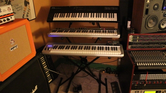 Moved things around again! Much cleaner and larger workspace. Found the OmniMount brand speaker stands for cheap on ebay. Picked up a Zoom R25 and S-Amp headphone amp to replace the poorly supported M-Audio/Avid Fasttrack C600. So far so good!