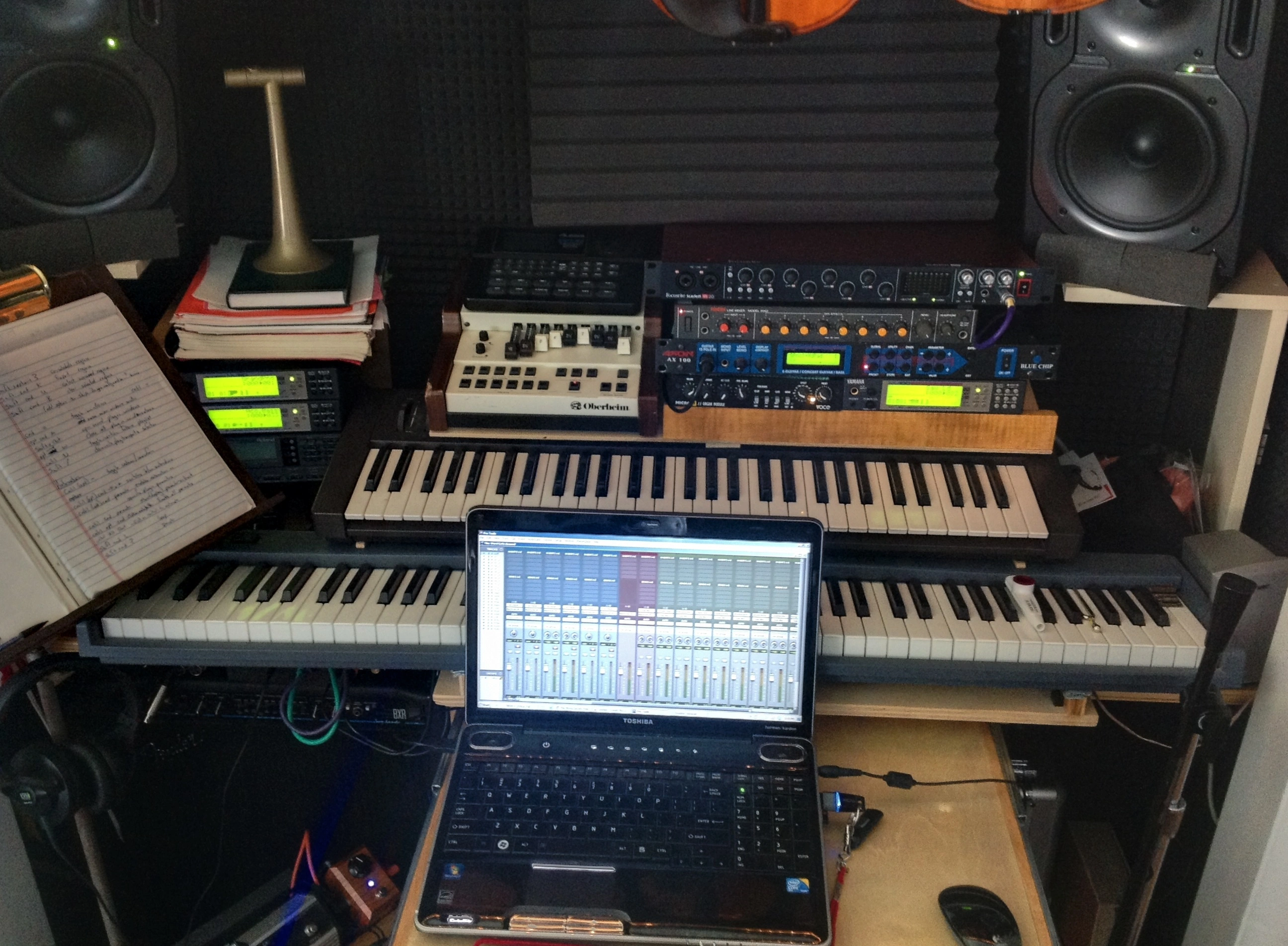 I've been stalking around here and learning many things, but this is my first contribution. My 'studio' began as a way to consolidate when I moved from a house with a huge bay window and living room where I had my instruments spread out, into a smaller house, while preparing to marry. My wife plays the harp, I play the double bass, which both take up a bit of room in the living room, and I figured she'd like a little room for herself.