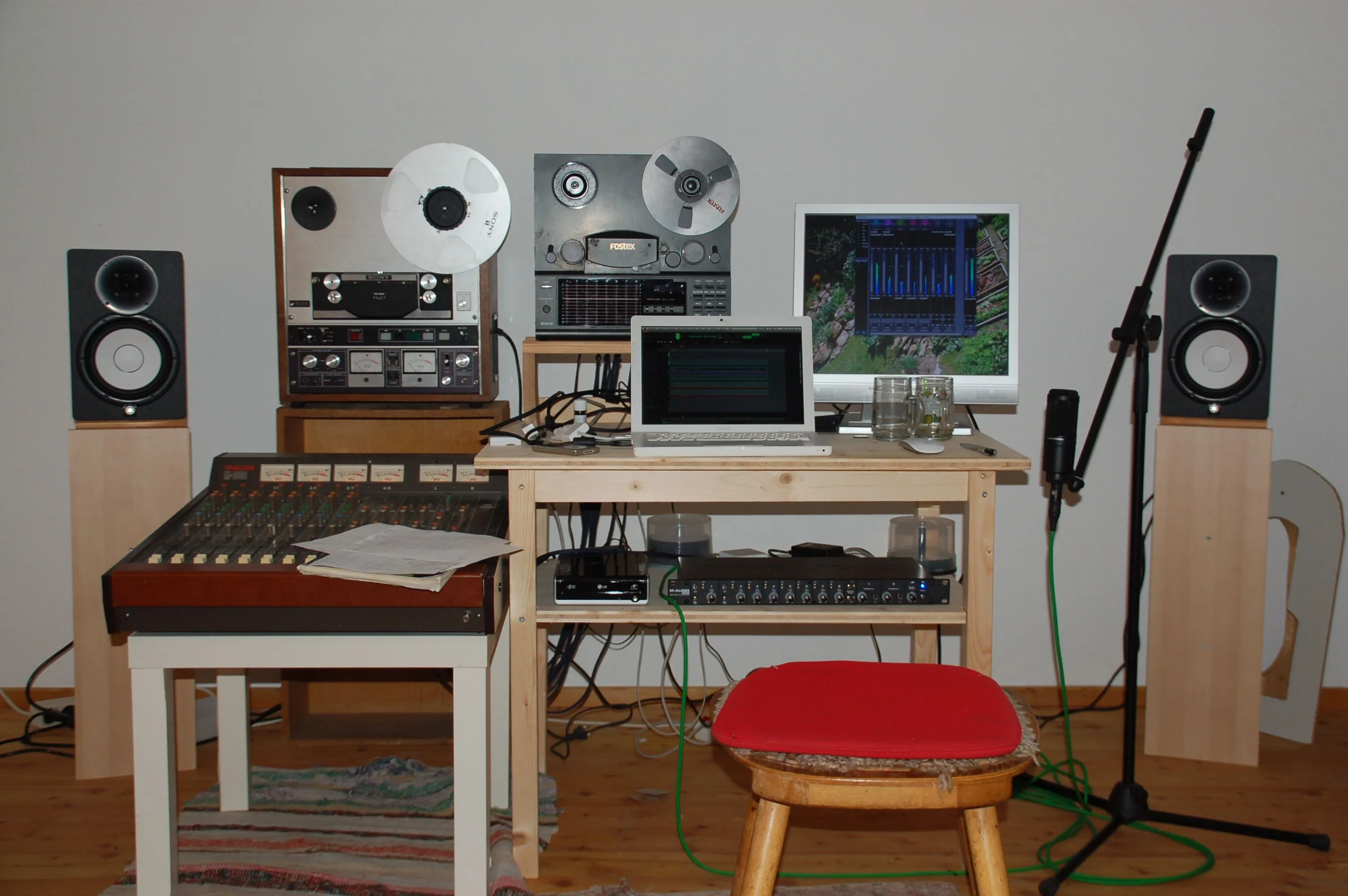 I am lovin the Reel To Reels!Ok here's my studio ... it's a bit of a cheapo compared to the other ones I see pictured here but this is all I got! There's the analogue section at the left, with the Tascam 308 mixer as the best part, and the digital section right, with Ardour running on a MacBook. I even built the table myself and the stands for the speakers.
