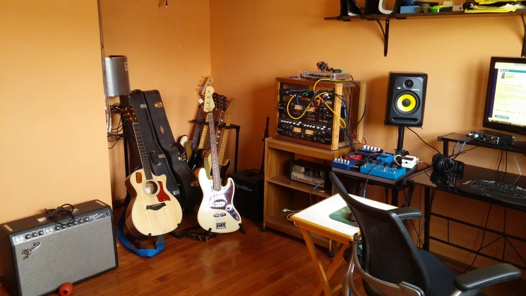 Here's where I do most of my work. Small upstairs bedroom, right hand monitor jammed into a corner. Hardly ideal. There is a large living room downstairs where I can record as well, but it's a fairly big job moving things so I'll usually only set up down there when my wife is out of town for a few days.
