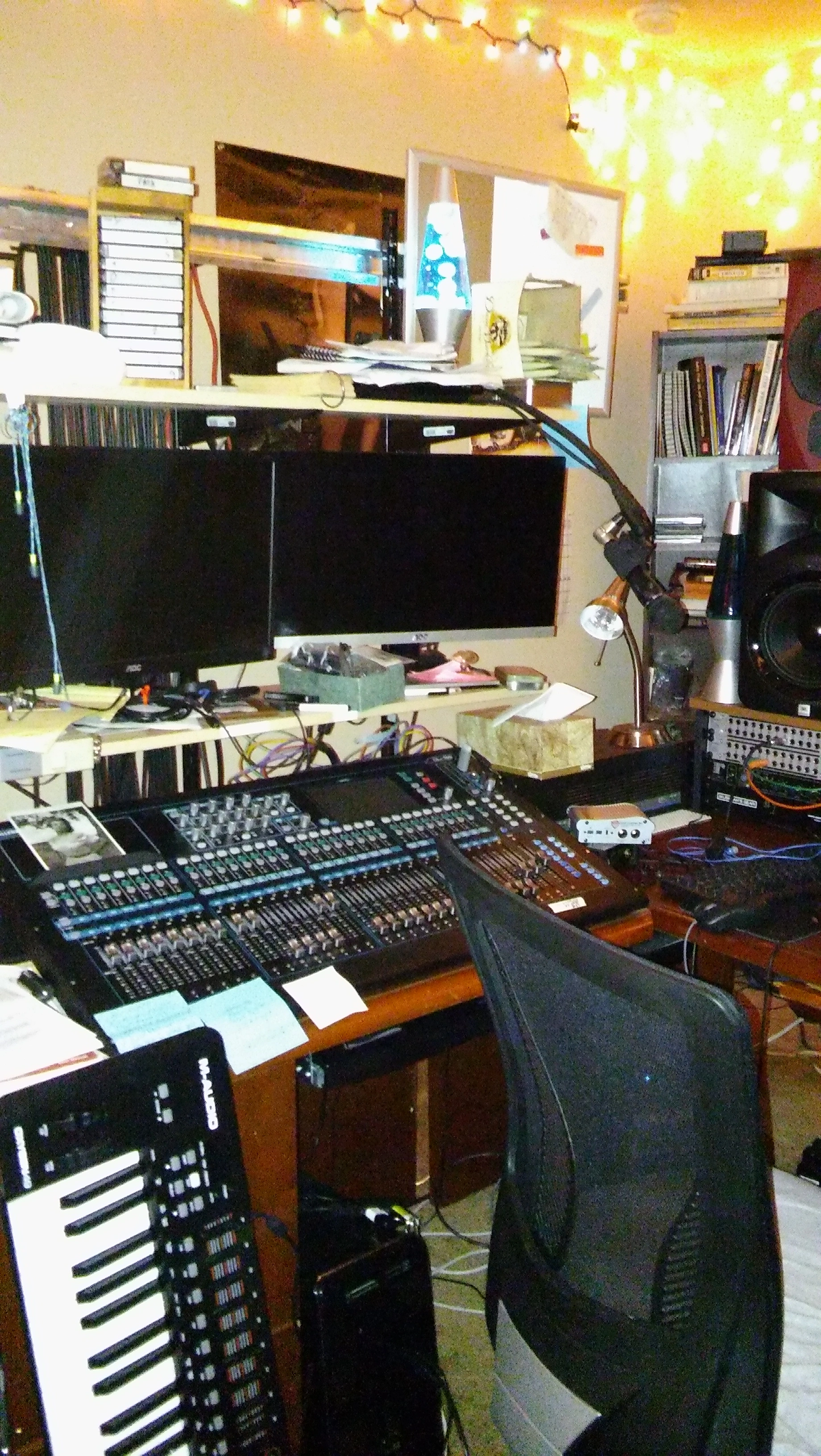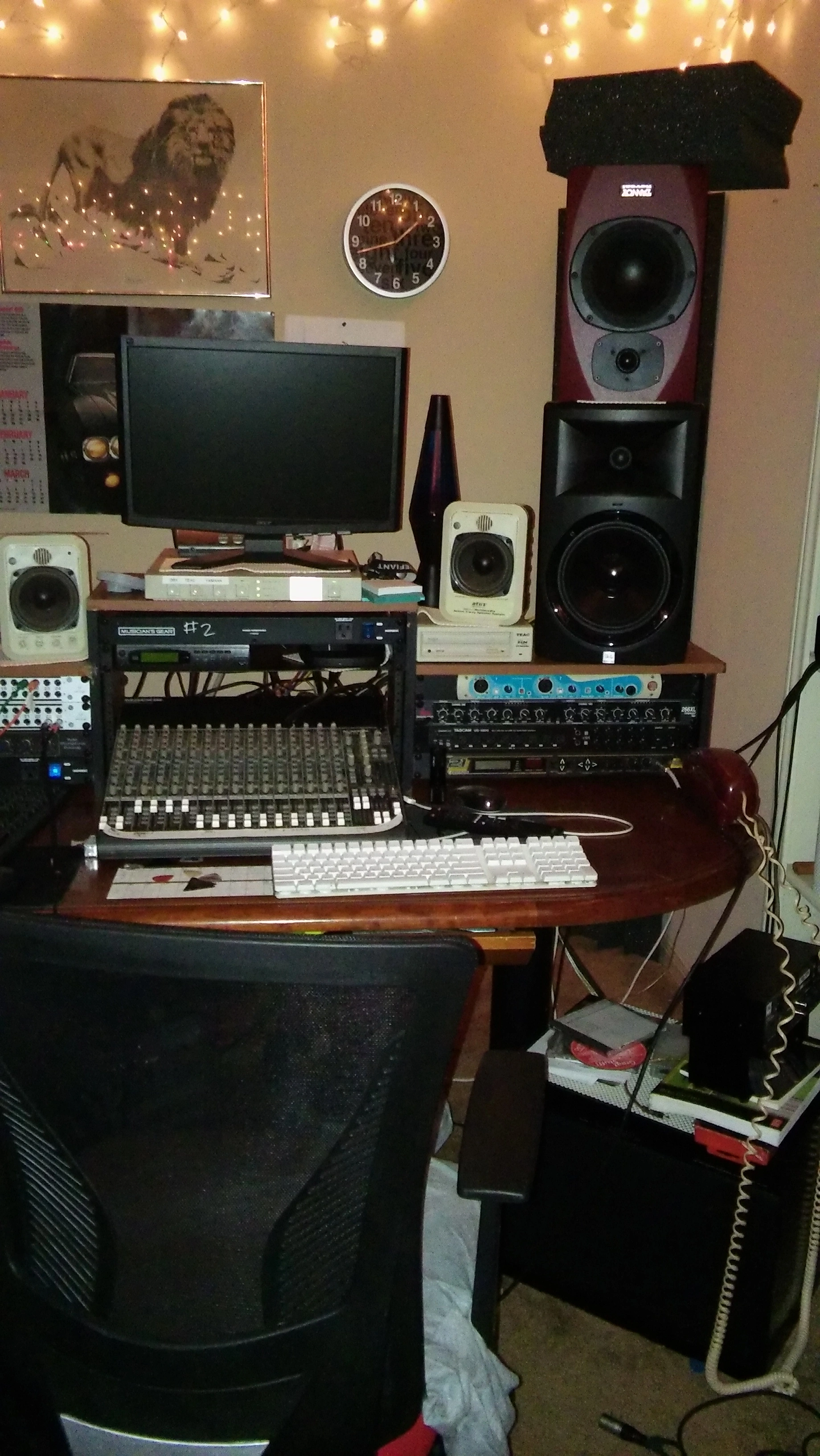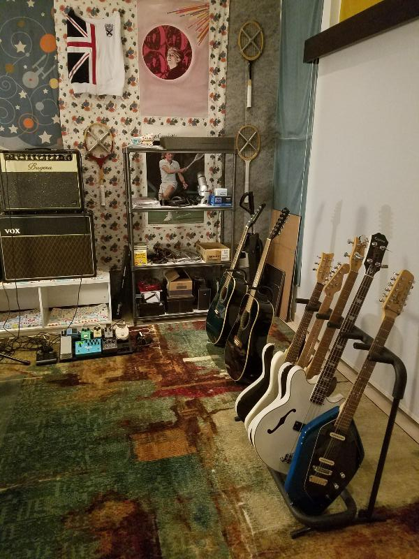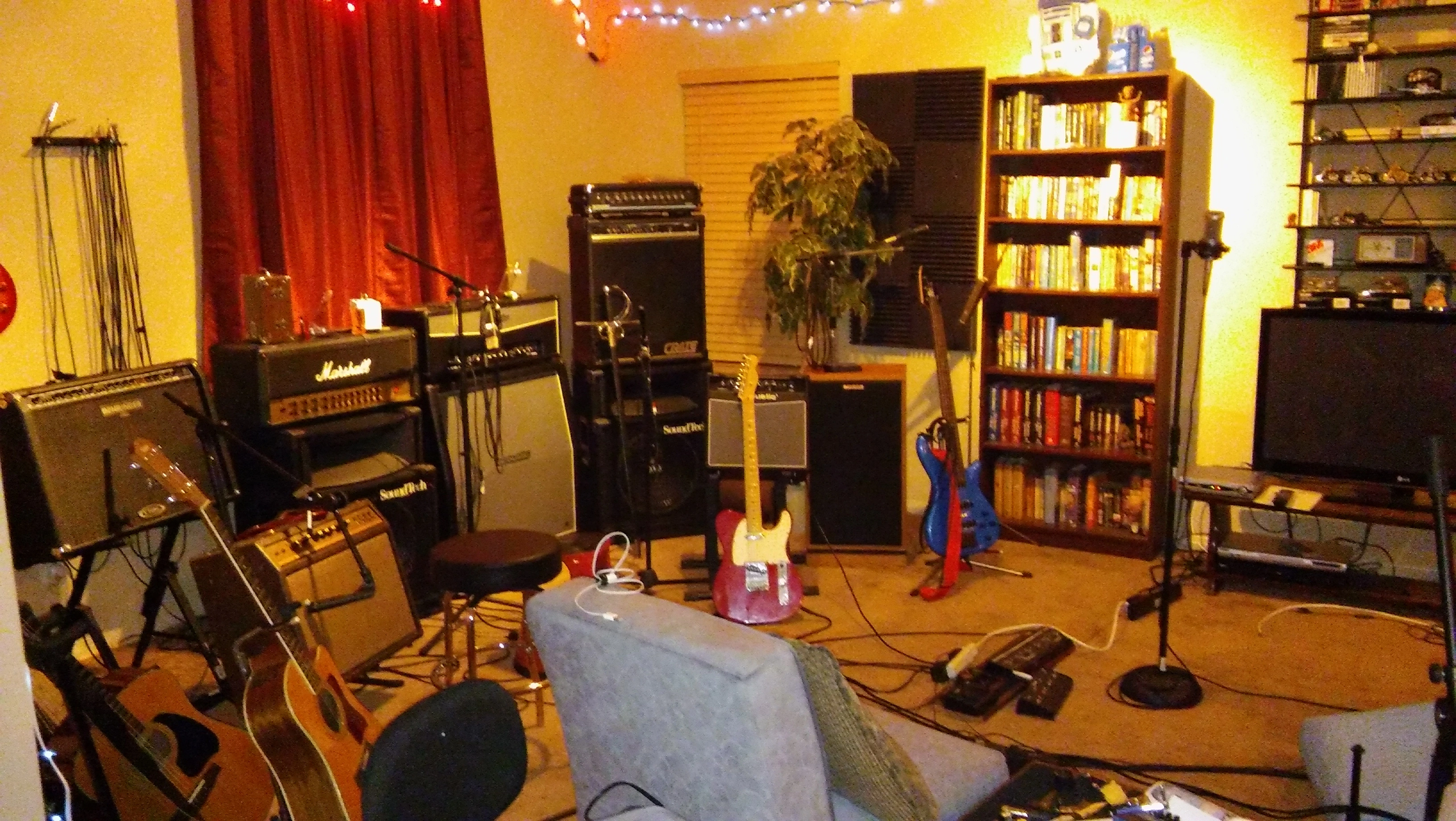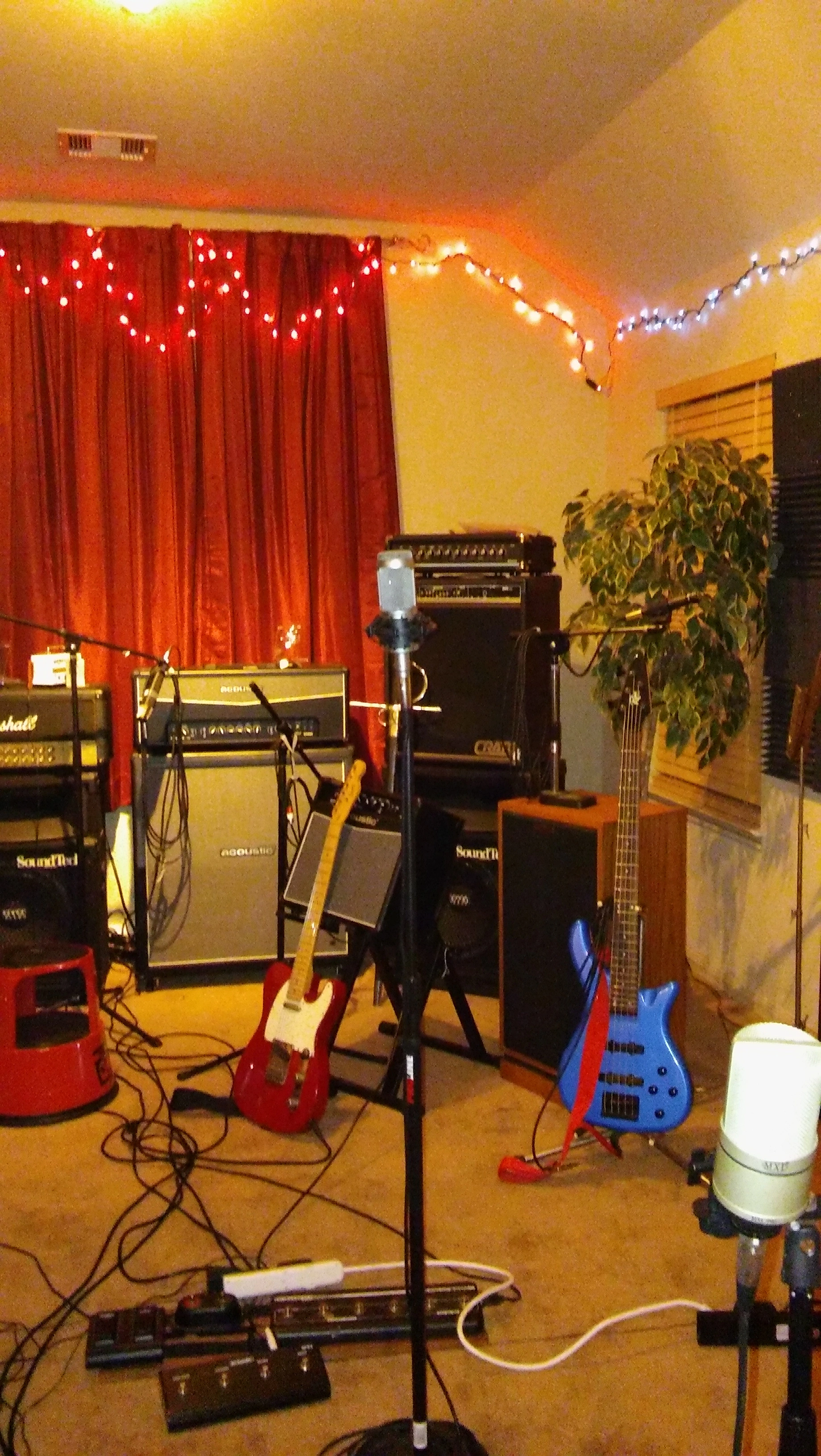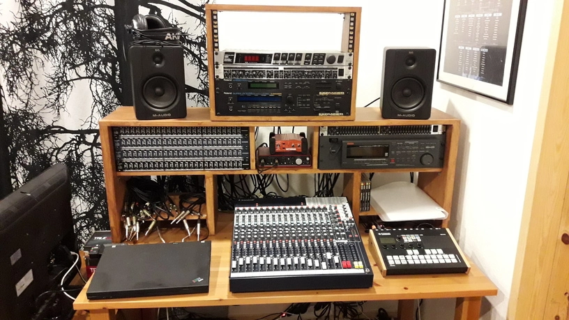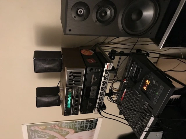 Here's my little analogue studio. Just a Tascam 488mkii on a keyboard stand. Upper rack has an 8 channel preamp and Sony wm-475 mix down deck. Then an old JVC receiver to run the Realistic Minmus 7's. I'm just starting out and wanted to do analogue on the cheap(ish, that 488mkii will run about $400 these days). Its fairly compact and sounds pretty good. I have a Boss ME-50 that's doing most of the outboard effects. I bought 100 20-minute tapes from National Audio Company a year ago, just before they ran out of chrome tapes. and cause of a mixup later I got another 100 tapes. They give 5ish minutes which is plenty for most of my songs. I can then label those to keep track of them. Using this as my only recording system at the moment. Cheers.