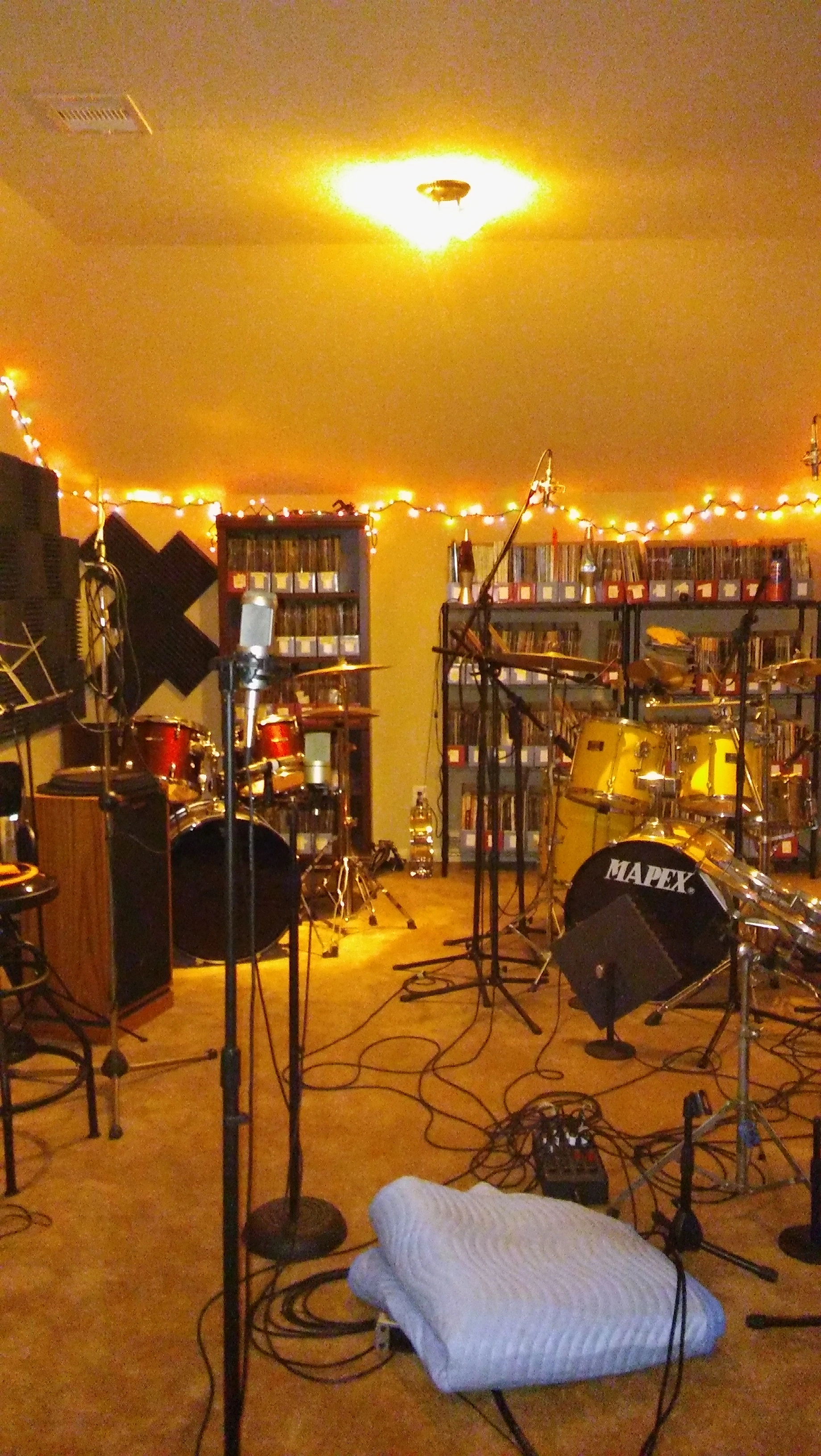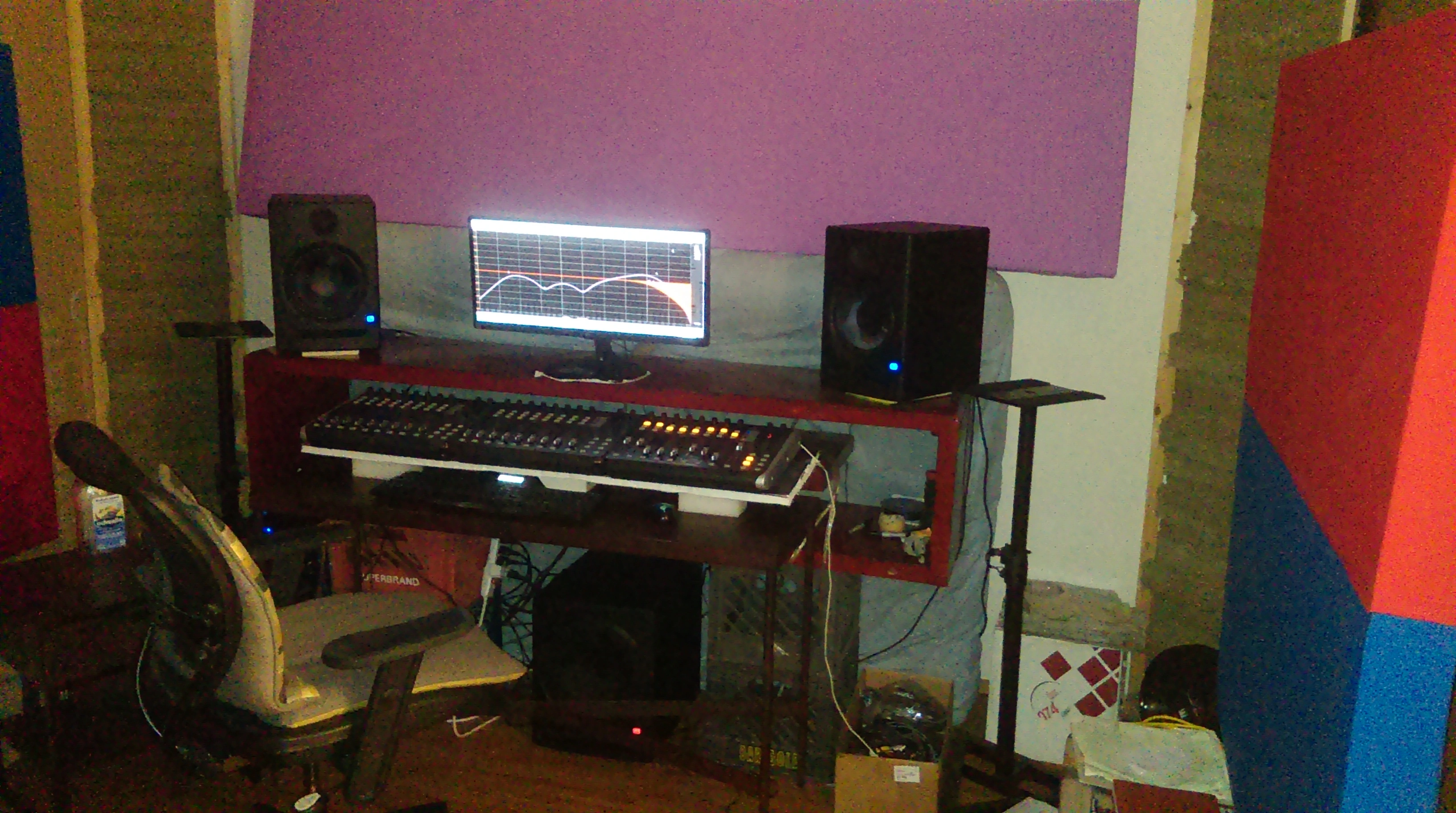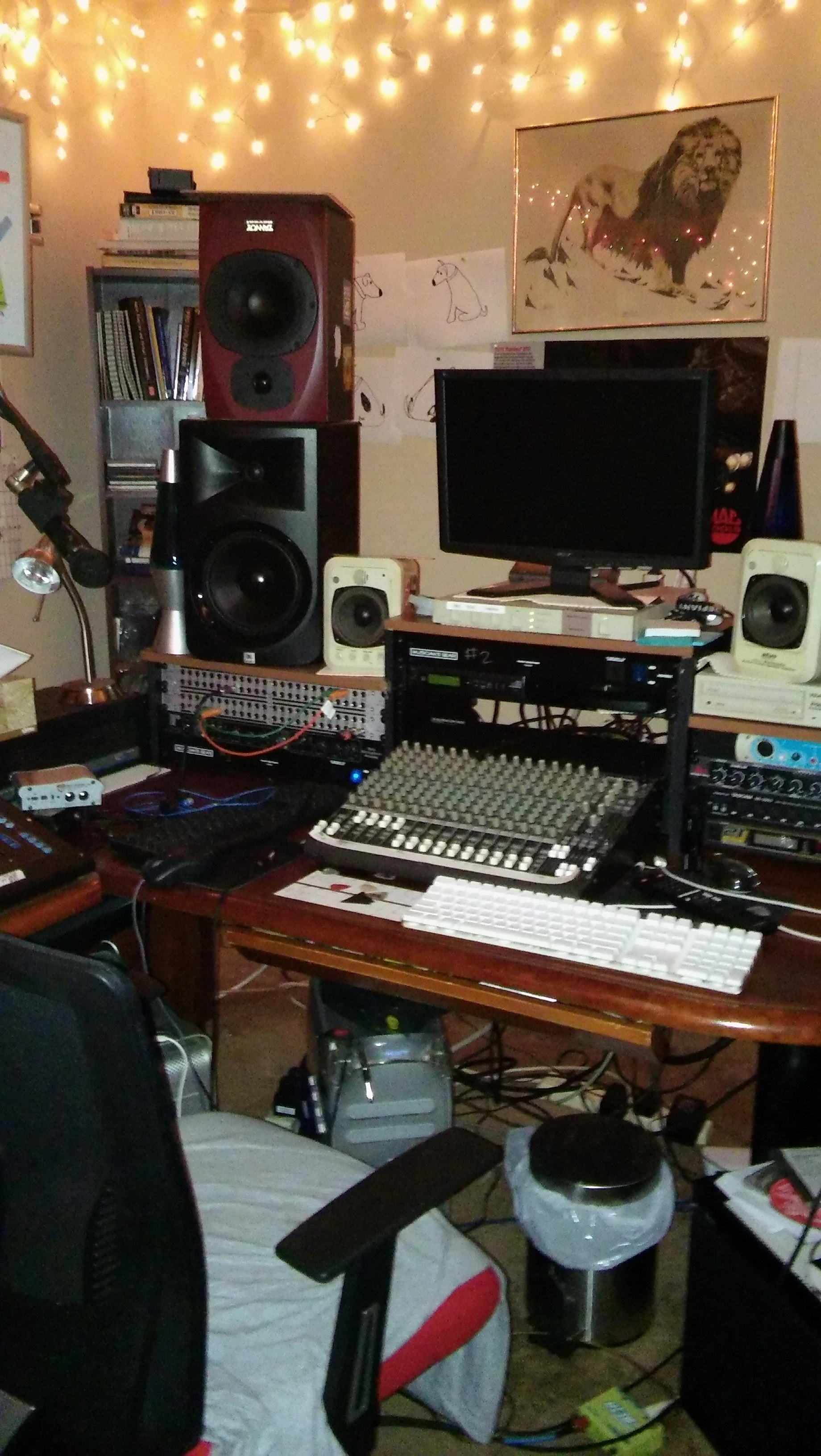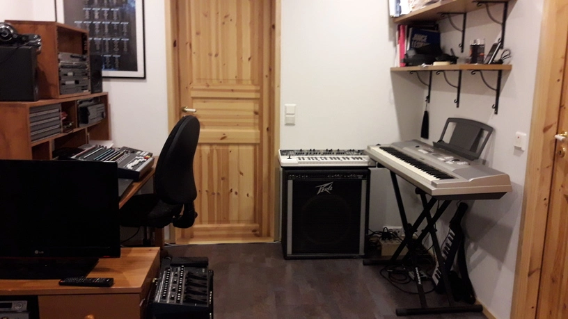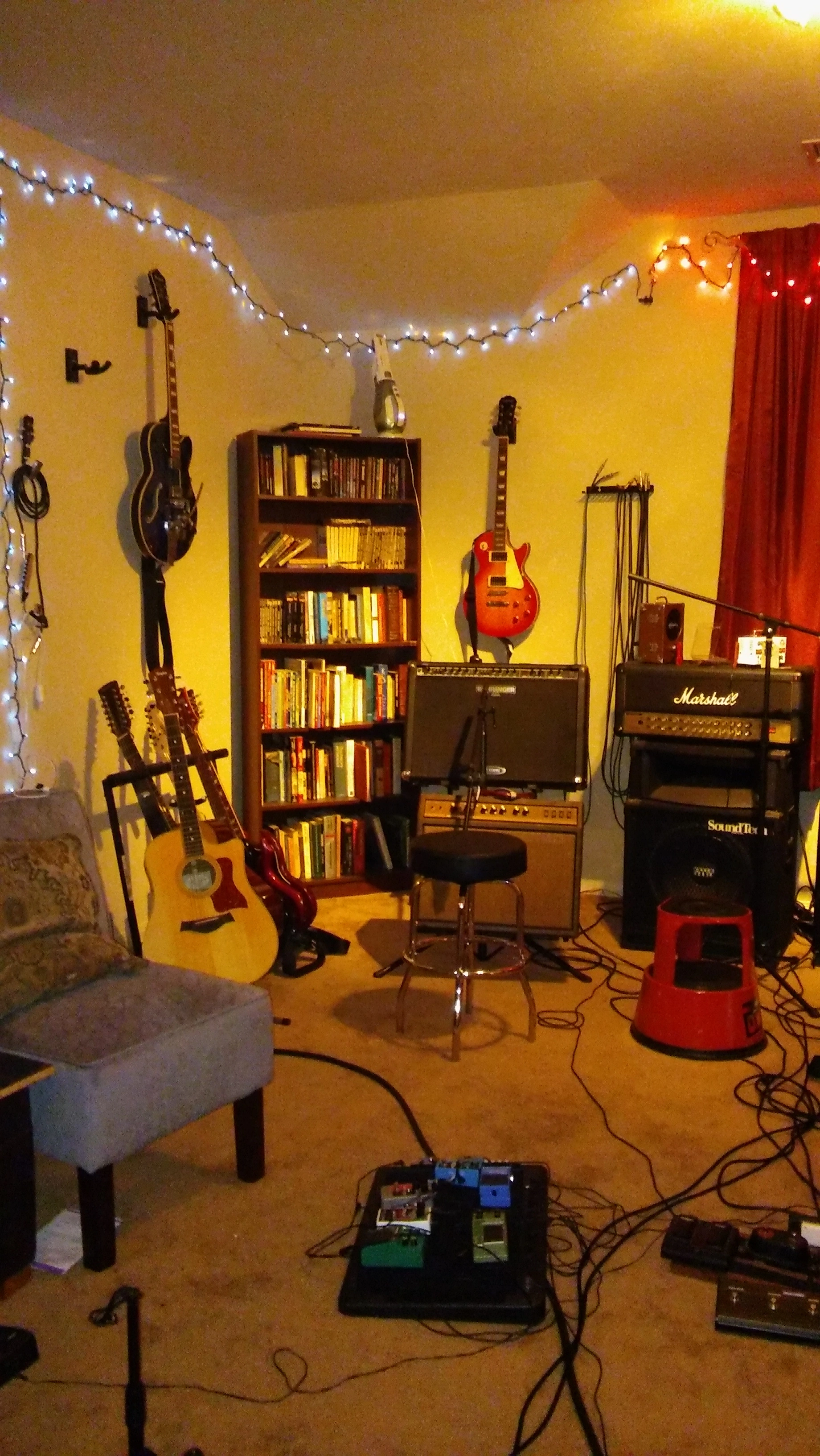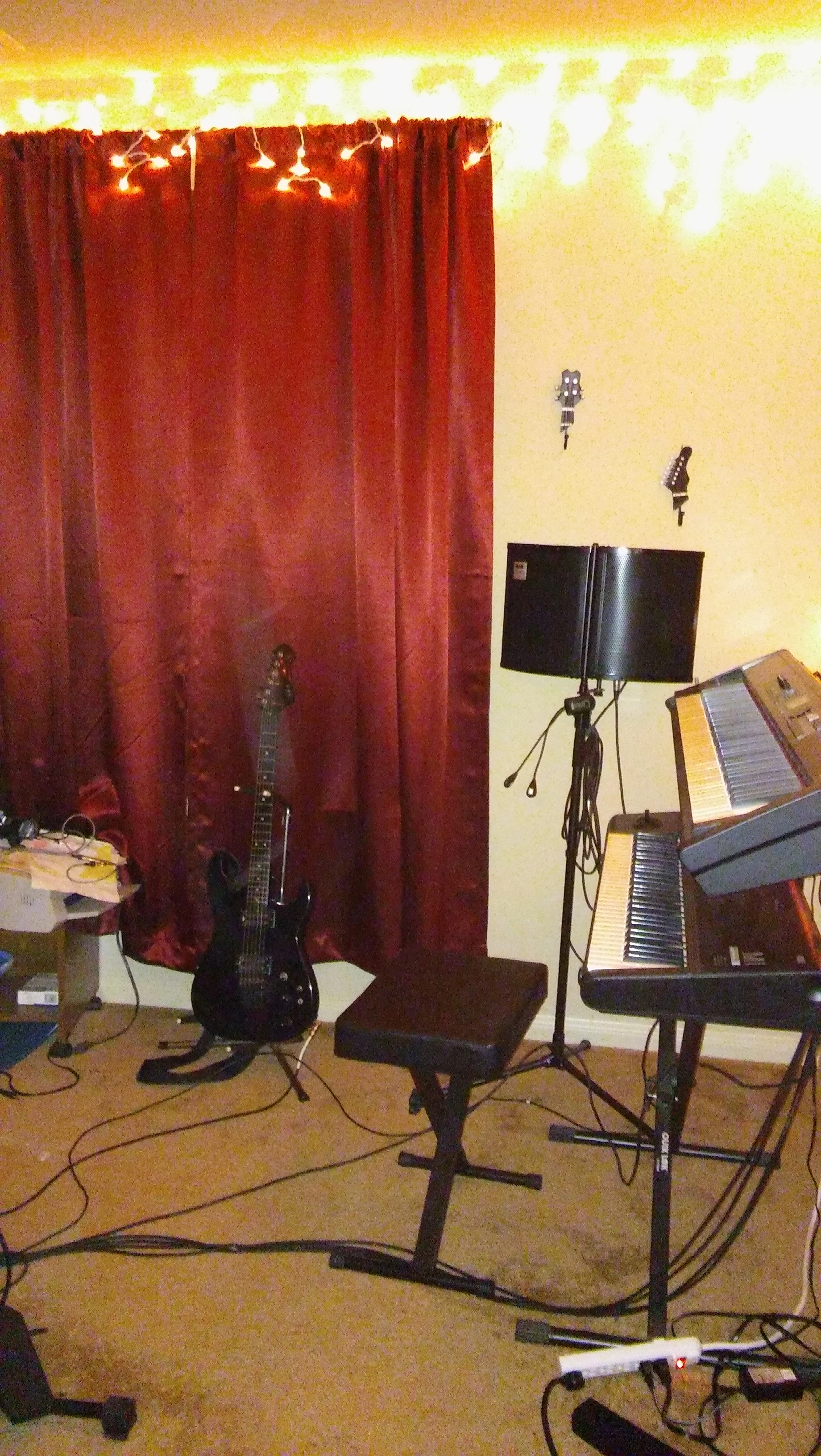 Here's my little analogue studio. Just a Tascam 488mkii on a keyboard stand. Upper rack has an 8 channel preamp and Sony wm-475 mix down deck. Then an old JVC receiver to run the Realistic Minmus 7's. I'm just starting out and wanted to do analogue on the cheap(ish, that 488mkii will run about $400 these days). Its fairly compact and sounds pretty good. I have a Boss ME-50 that's doing most of the outboard effects. I bought 100 20-minute tapes from National Audio Company a year ago, just before they ran out of chrome tapes. and cause of a mixup later I got another 100 tapes. They give 5ish minutes which is plenty for most of my songs. I can then label those to keep track of them. Using this as my only recording system at the moment. Cheers.