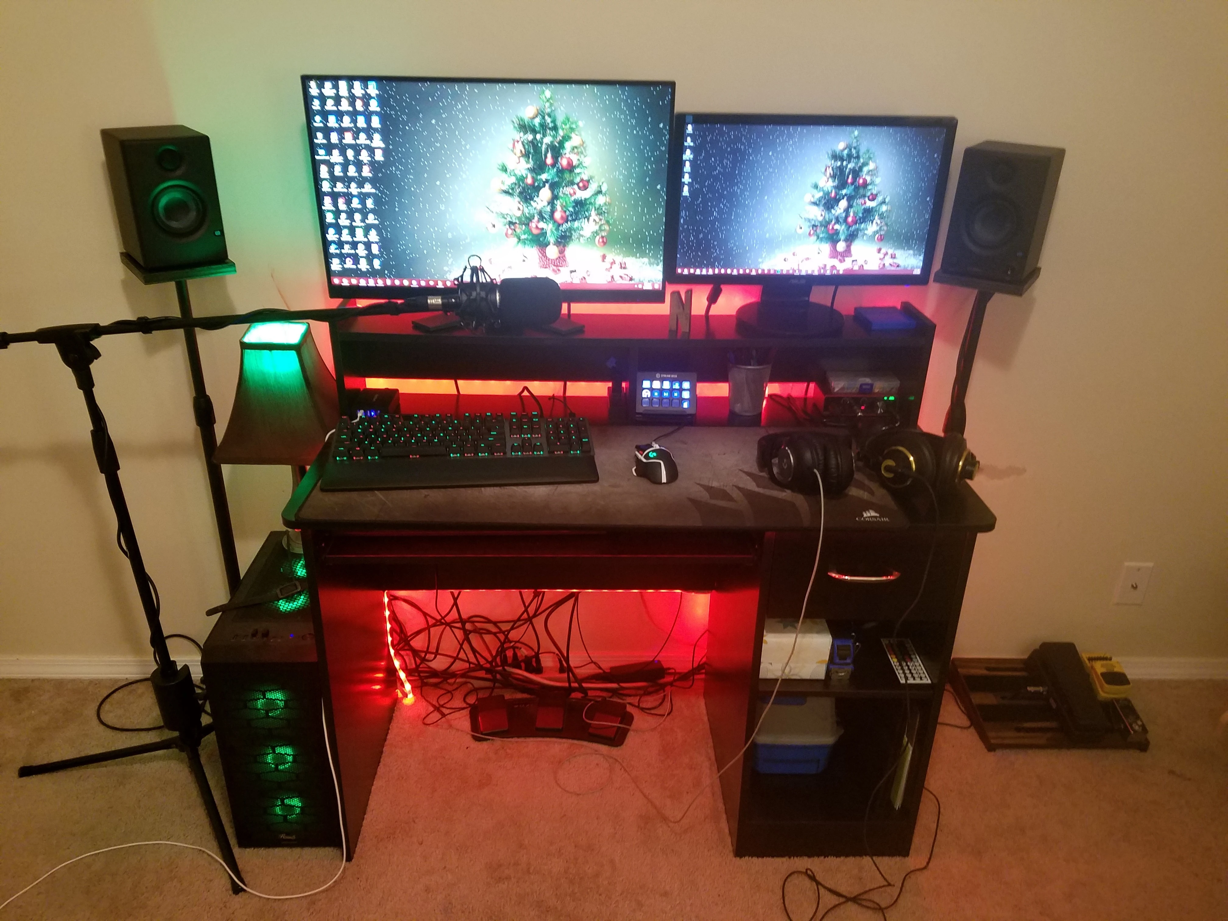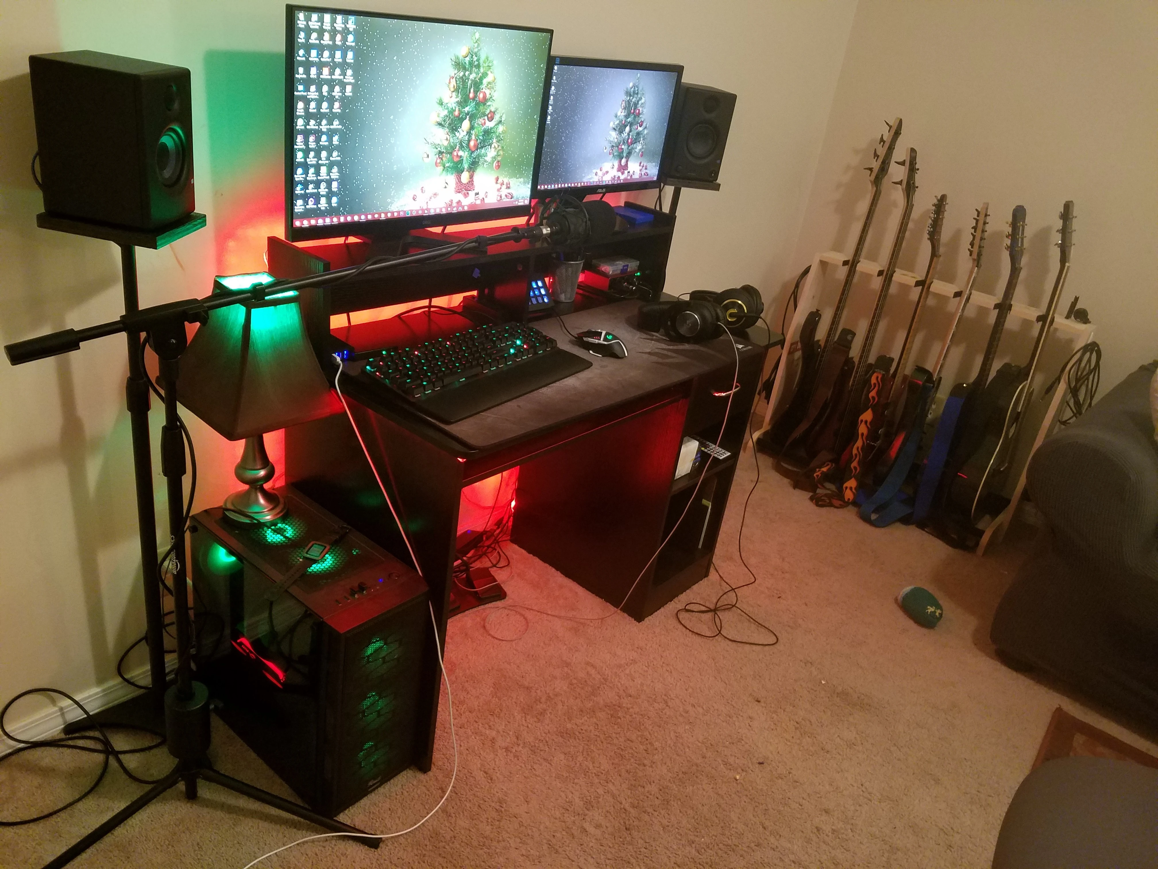 My current gaming and music set up. also where I do all my sketchup stuff for my woodworking hobby. Everything is currently Christmas themed for... Christmas. I still have a long way to go, the room isn't treated at all all but gotta start somewhere rightAlso, I REALLY need to do something about all those wires...