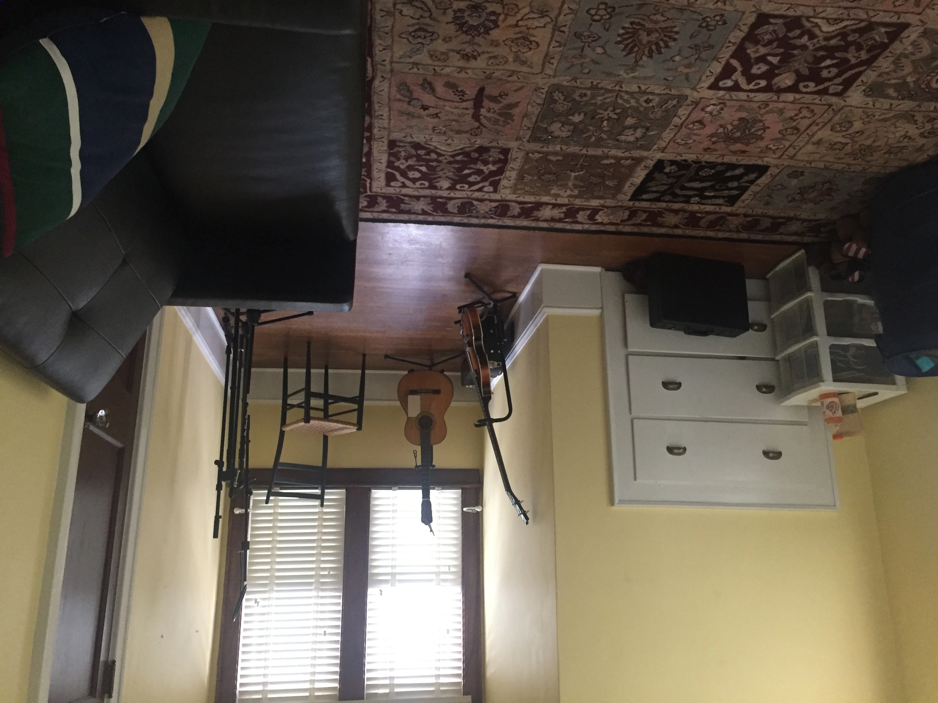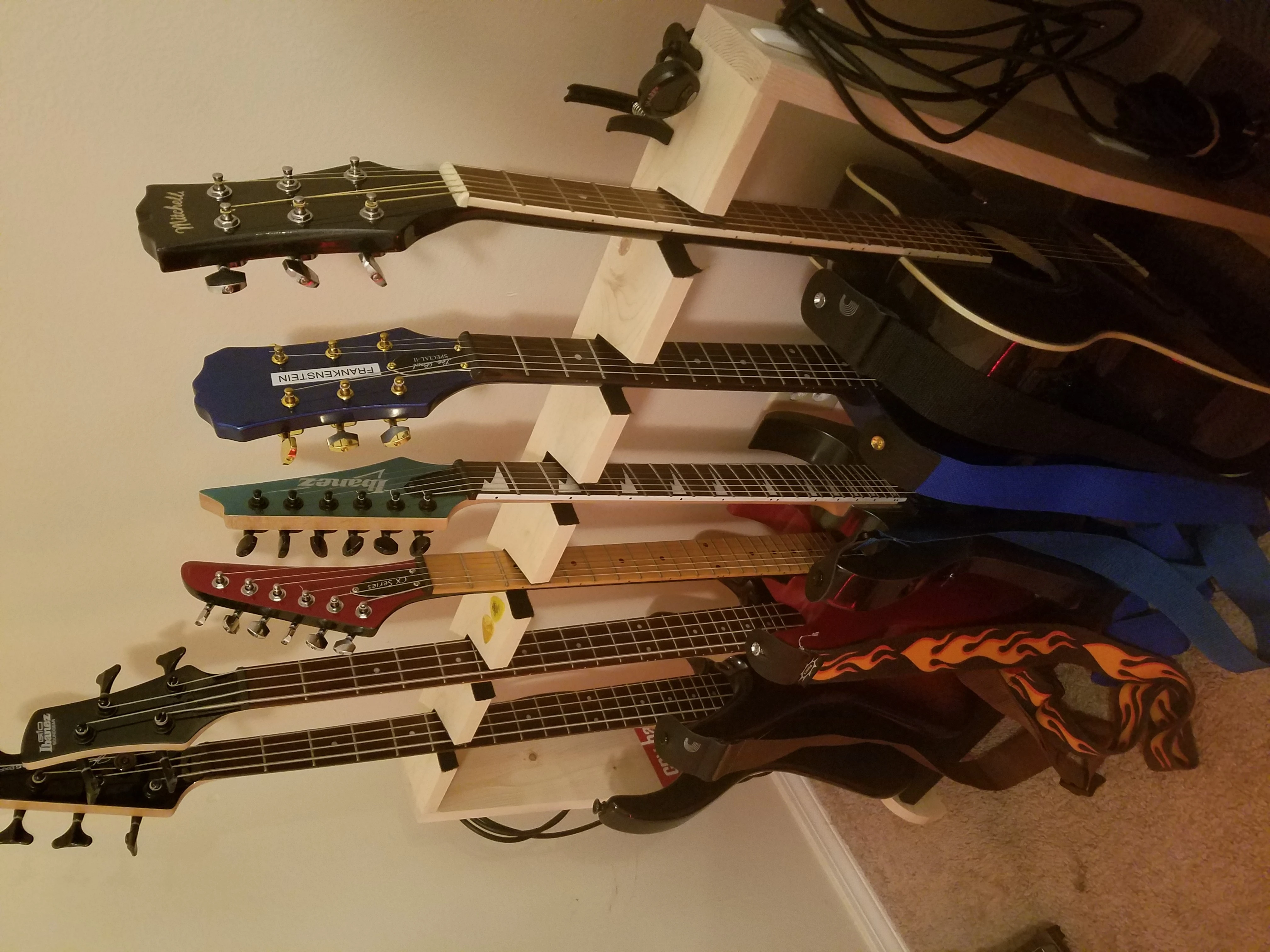 all of my guitars were purchased used save for the acoustic and the Ibanez bass. I sanded down and refinished all of the electric guitars myself. the red guitar was found broken all to hell in someones garage and I got it for 30 dollars