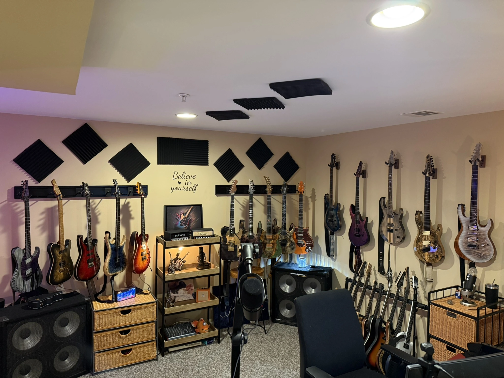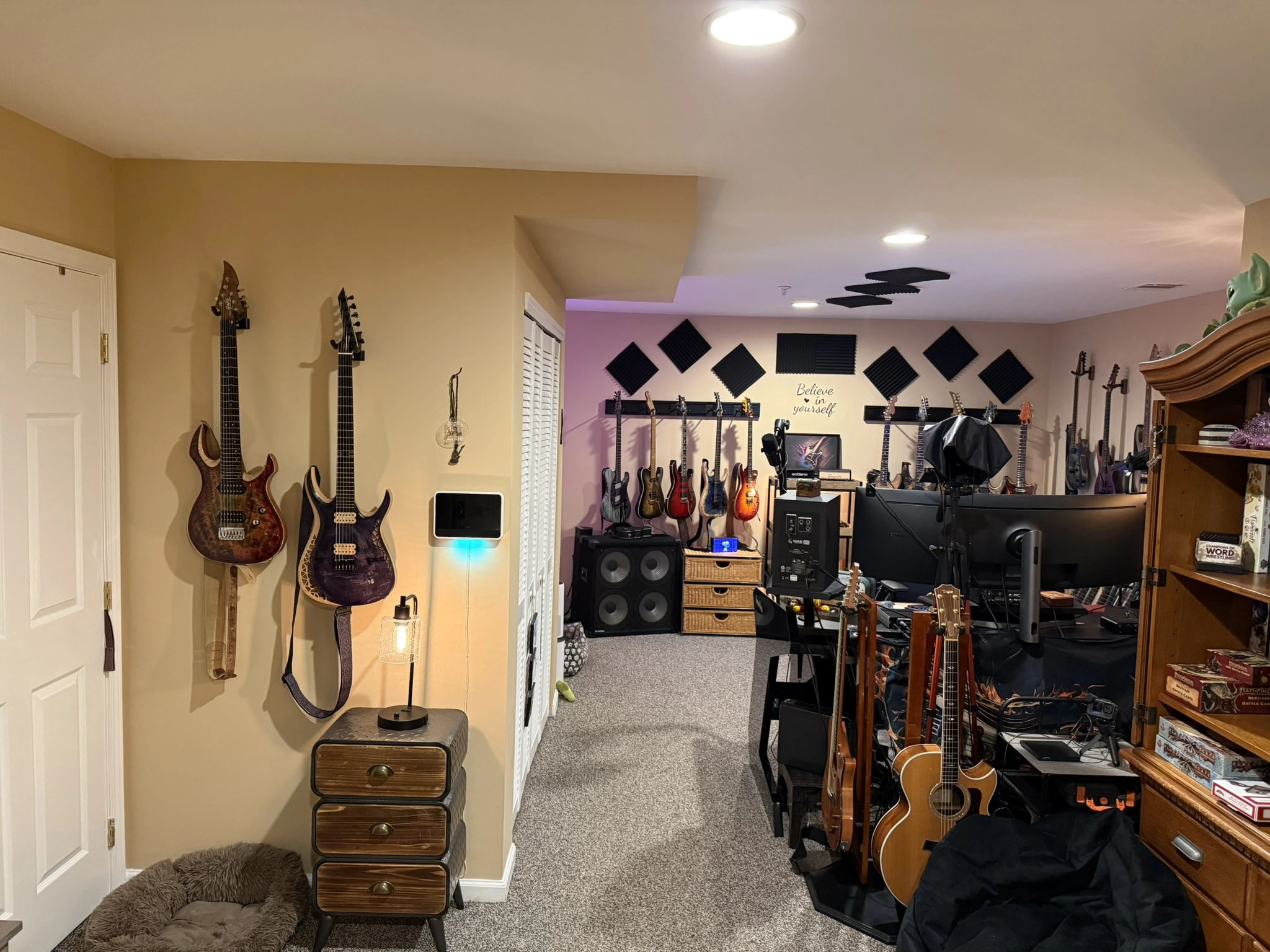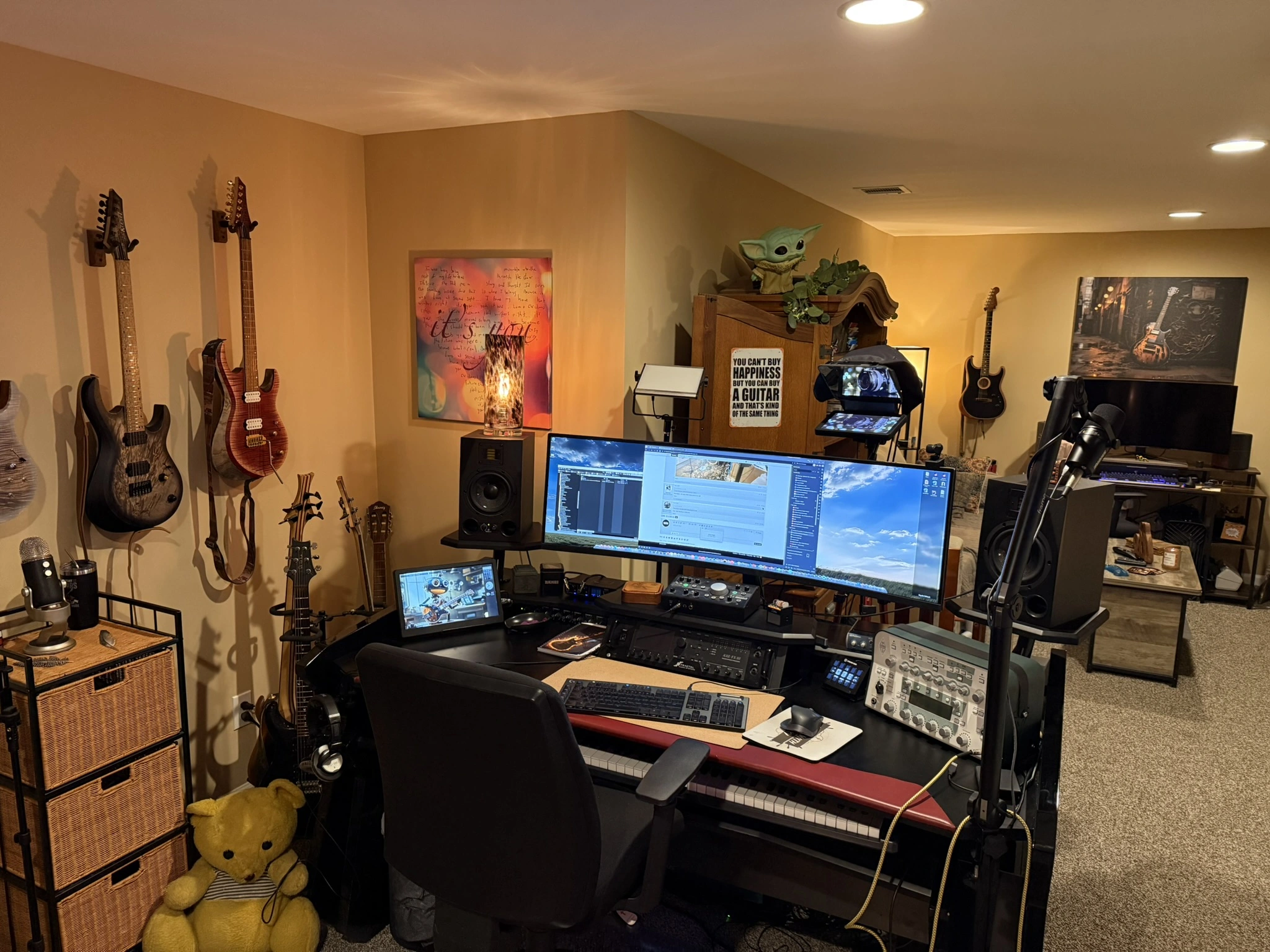 I added a few tablets I bought for about $50 each on Amazon. They allow me to control ProTools from the drumset and vocal booth. I have an iPad on an old mic stand that does the same thing. I also made some extension boxes that are GCFI protected and provide USB charging, which have been handy.
