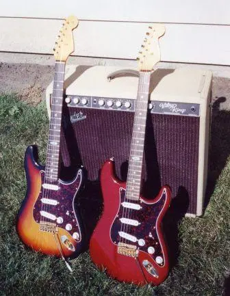 I also really like the sunburst custom paint on Anfontan's right strat - sweet