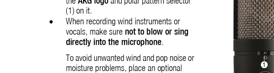 As for AKG's recommendation, if you don't have an effective pop filter, then you need to avoid going straight at the mic, especially if you are close. The plosives will pop out at you. If you look at a many announcers, they will often have the mic about nose level and pointing down at the mouth. That's because the natural flow of air is usually down and outward, not up. You get the proximity boost that announcers like, without the pops.