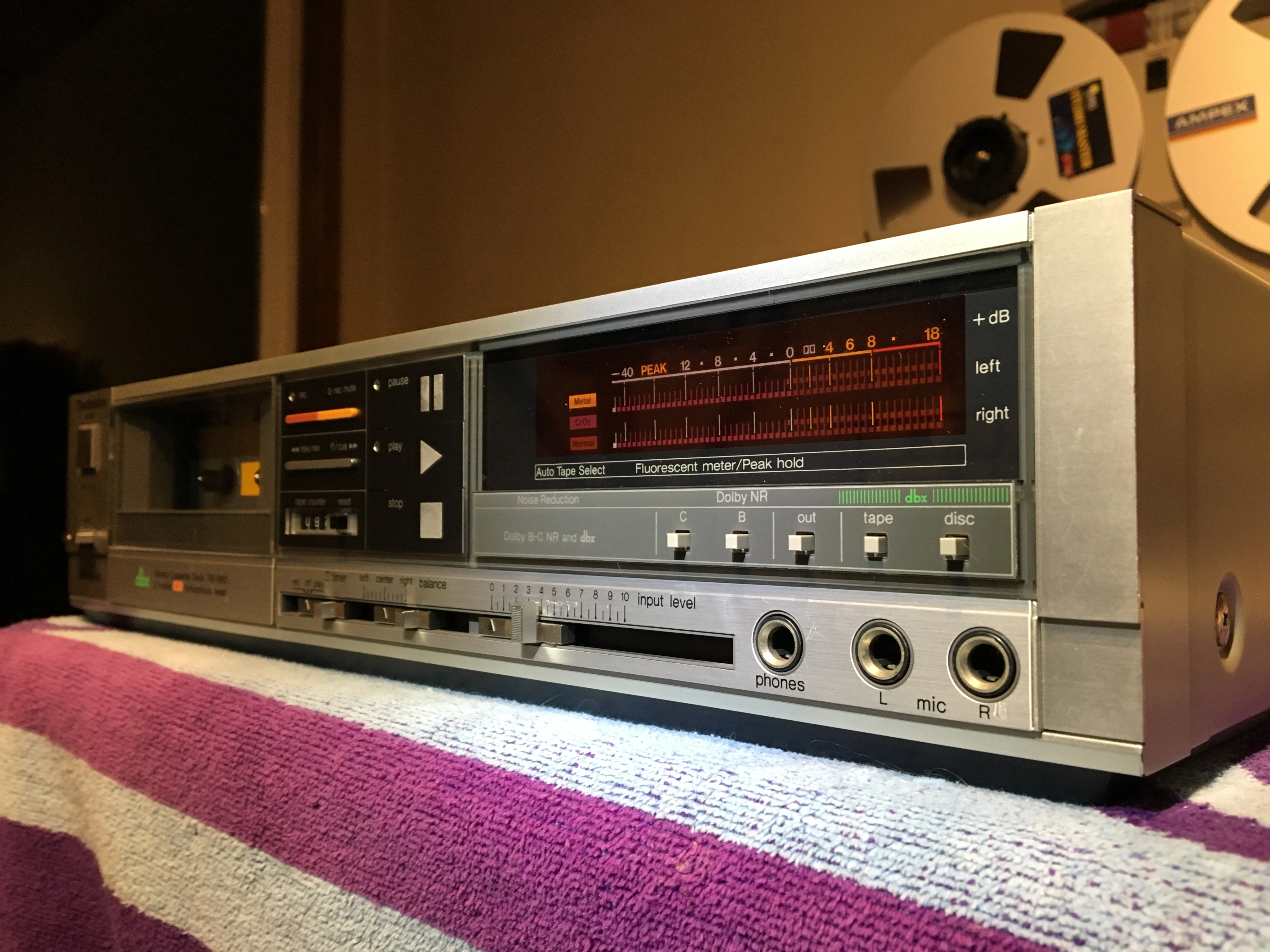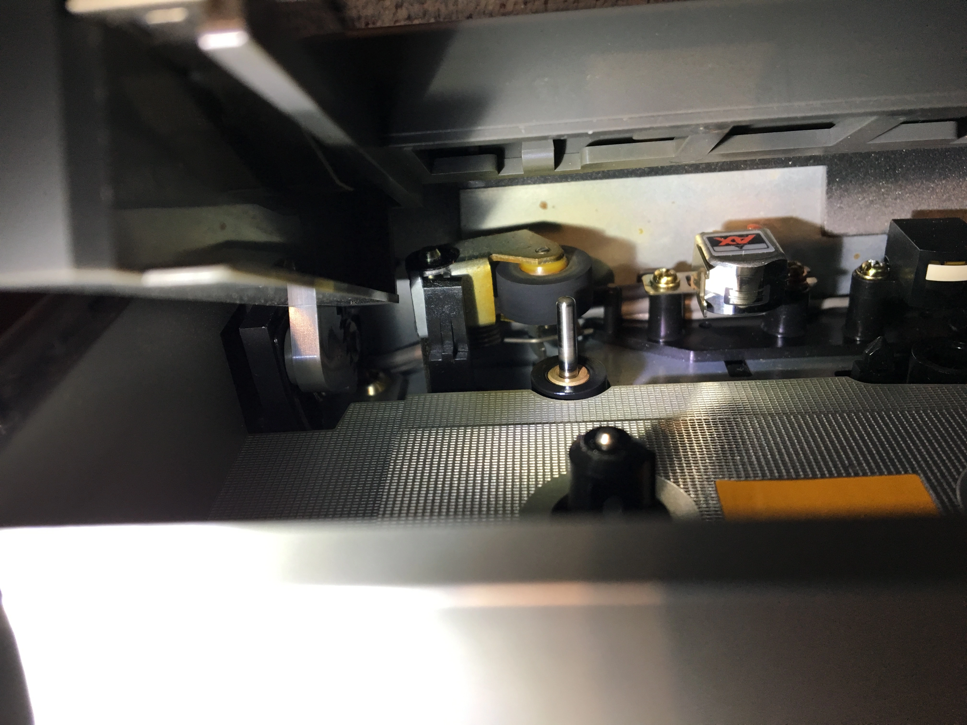 This is a straight-ahead 2-head single-direction cassette deck. The neat thing is it has onboard dbx noise reduction in addition to Dolby B and C. It needed a little cleaning up, but not a lot, and I think it’s seen a pretty easy life. Cosmetically it’s a solid 8.5 out of 10, and everything works as it should. I was surprised...was expecting it to be in need of a capstan belt and expected the pinch roller would either be hard as a rock or soft as gum. Neither is the case. It just works. Cleaned up the pinch roller and it feels like new: