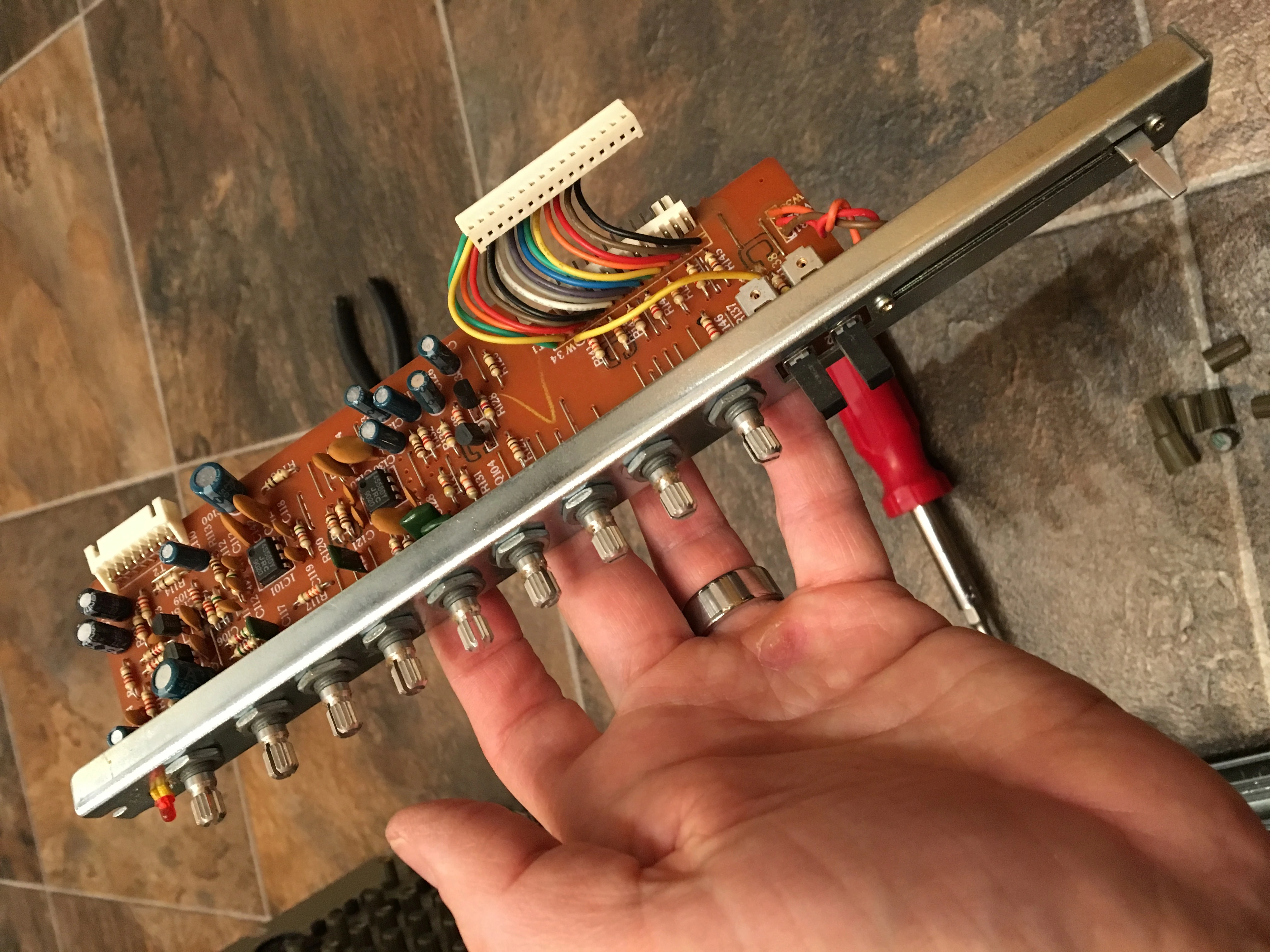 Now, this is no boutique mixer...it’s a budget model, but it’s got a decent feature set for what it is (phantom power, 3-band EQ with swept mid band, 3 AUX busses, one of them globally switchable pre/post, PFL circuit, a little assignable talk-back mic input, inserts on all inputs and outputs)...and it sounds alright. And I enjoy opening this stuff up to see how it was designed. I think some engineer got their way against the marketing team and the bean-counters on this one...each channel is on its own card, all wiring is connectorized and/or point-to-point, and each card is mounted by two screws to the frame...all pots are individually nutted but to an individual channel structural member, so once the cover is off the chassis, pull the knobs off of a channel, remove two screws and unplug two harness connectors and a channel is out. That’s not as convenient as individual plug-in modules, but it’s a whole lot more serviceable than scads of more expensive gear out there: