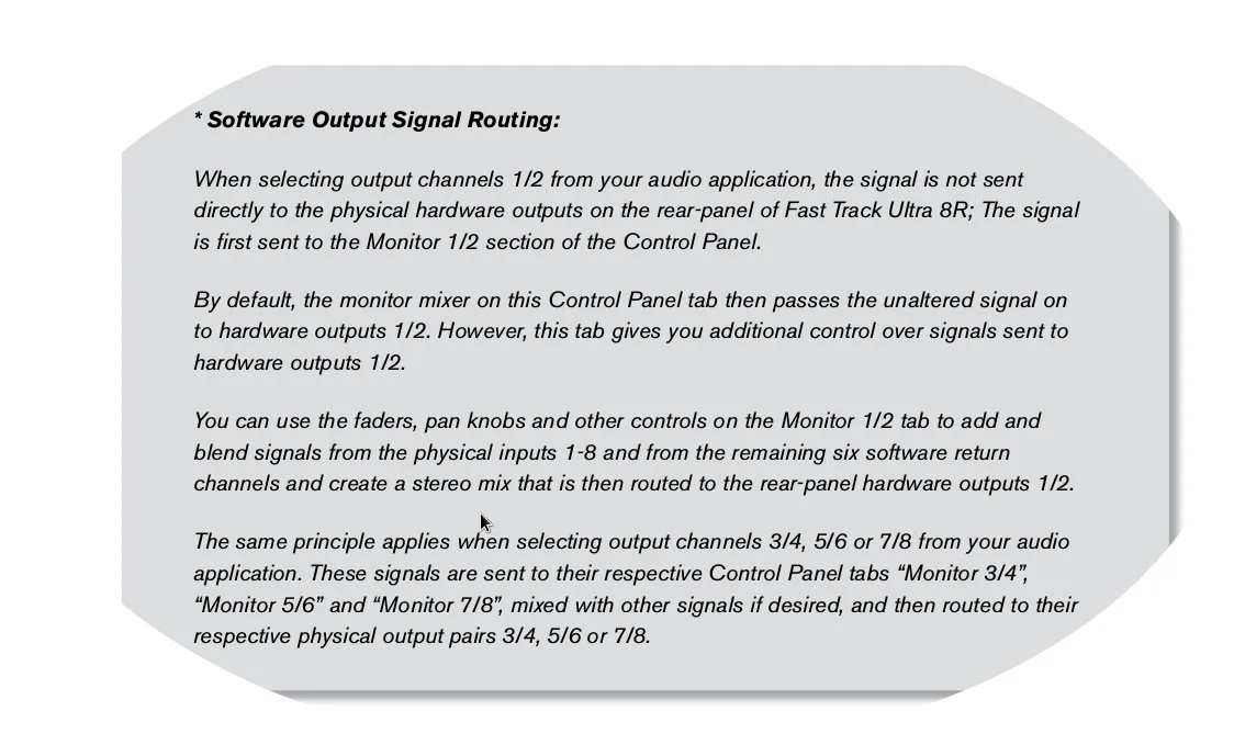 So, I ordered a M-Audio Fast Track Ultra 8r. It has eight inputs and eight outputs and here's where I run into trouble. I have all mics hooked up, #1 to 8.The outputs on the rear are accordingly numbered one through eight. I was told outputs 1 and 2 serve as the "outputs" for the entire board. So, I expected to hear sound when I plugged my monitor speakers into outputs one and two. The only thing I could hear was the #1 and 2 mics. If I plugged my outputs to say, #1 and #3, then I only have sound from mics one and three!