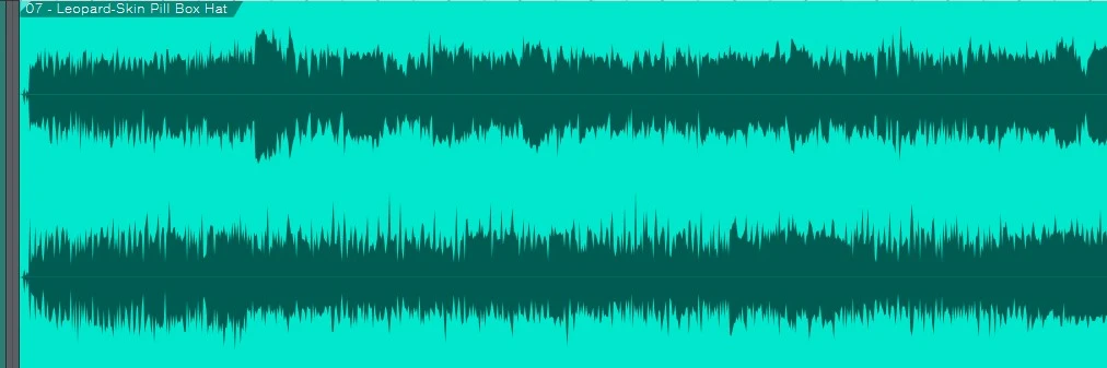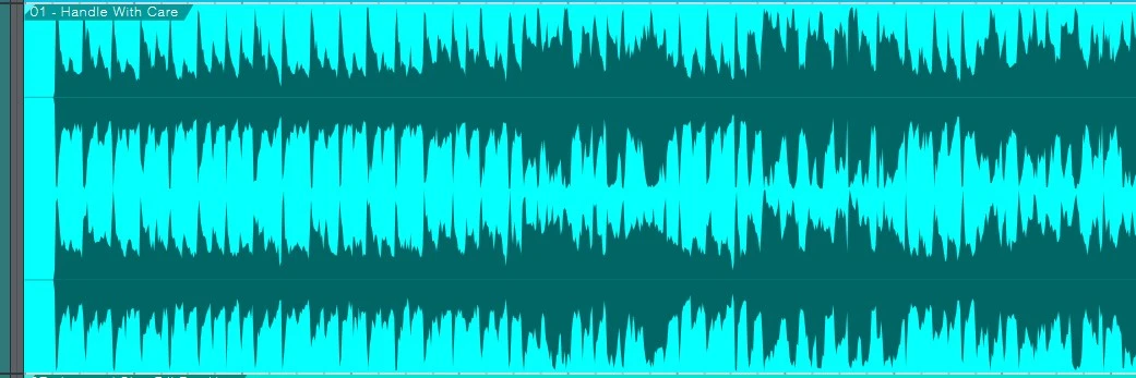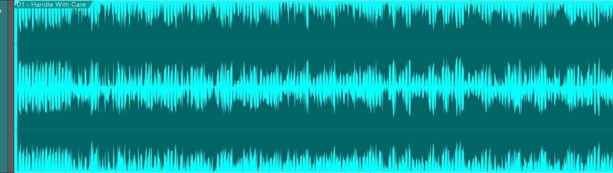 d) Handle With Care...this one looks a bit like mine...you can clearly see those peaks. Obviously the song is fuller than mine and the peaks are even visually more beefy than mine. This waveform kind of makes me eat my hat because it shows that even pro tracks can have peaky peaks. My song has peaky peaks. But...even still...the peaky peaks here have some girth. Still, we can put this down to pro tracks doing what pro tracks do, when recorded analogue compared to my digital.