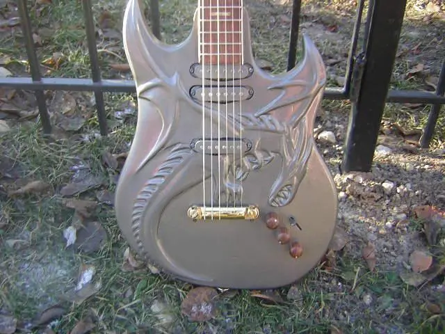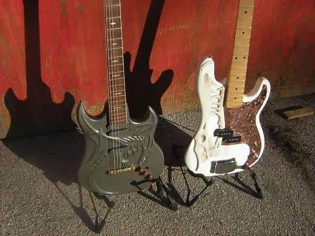 These are 2 guitars that I customized recently.The 6 string started out life as a 60,s Kent setneck.I bought it off of Ebay for $15 for just the body and neck and infilled all the routes with mahogany.I then carved the dragon into the body and leveled all of the body down.Cool body but a terrible player.The bass was a 70,s ? Onyx with a sunburst given to me by a friend.this one is in the process of being completed with a few small details to attend to.I had to make a custom copper pickguard to suit the carving.It is painted with a high dollar antique white lacquer and then a black glaze was added to highlight the dragon skull.Both were challenging because of their origional body construction and layout but now I am running my own bodies for more control.Thanks for looking I hope you enjoy them.Rich