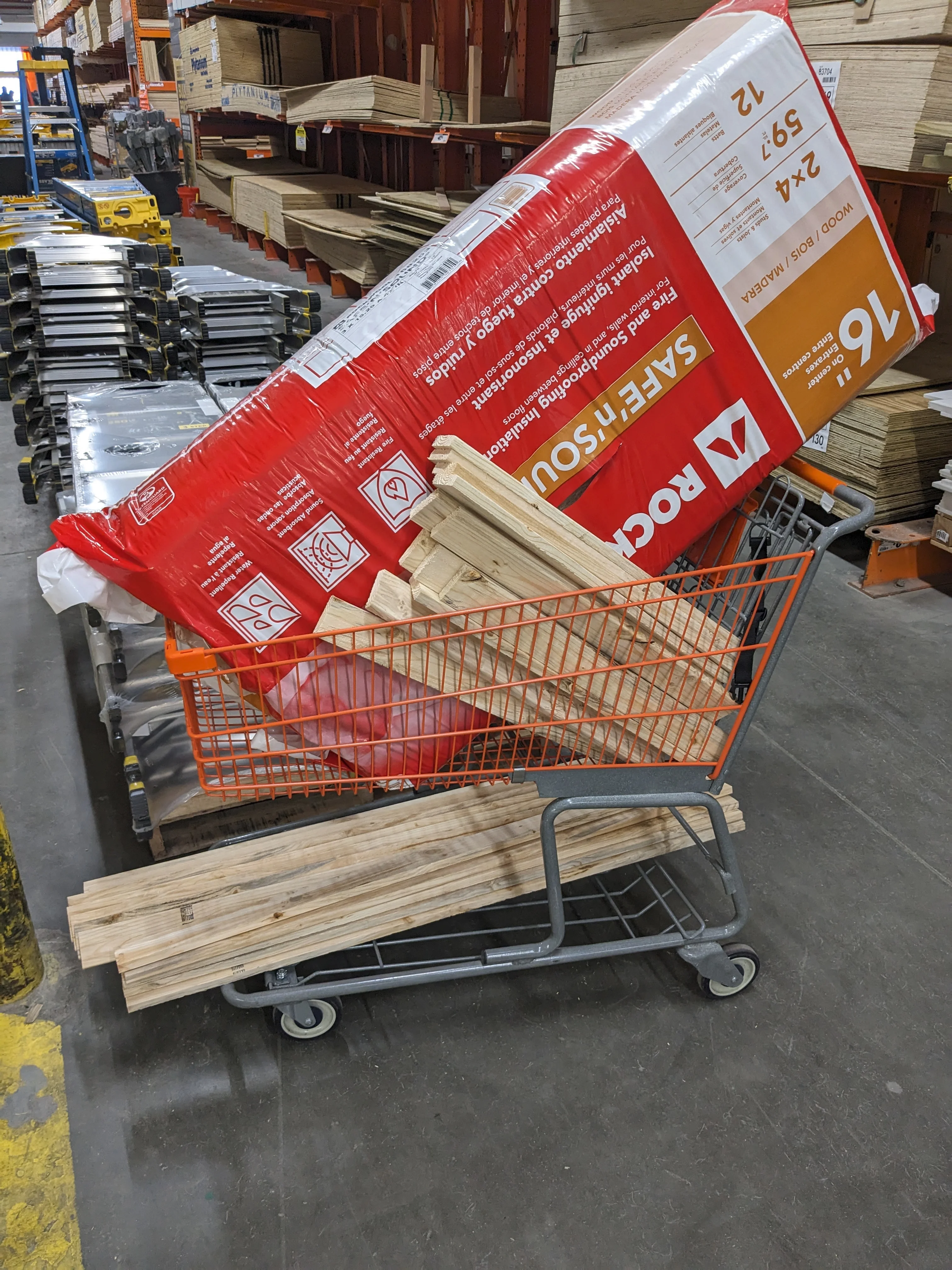 2. Went to Home Depot and bought enough lumber to make twelve 4' long pieces and twelve 2' long pieces, eyehooks for hanging, and twelve 2'x4' batts of Rockwool