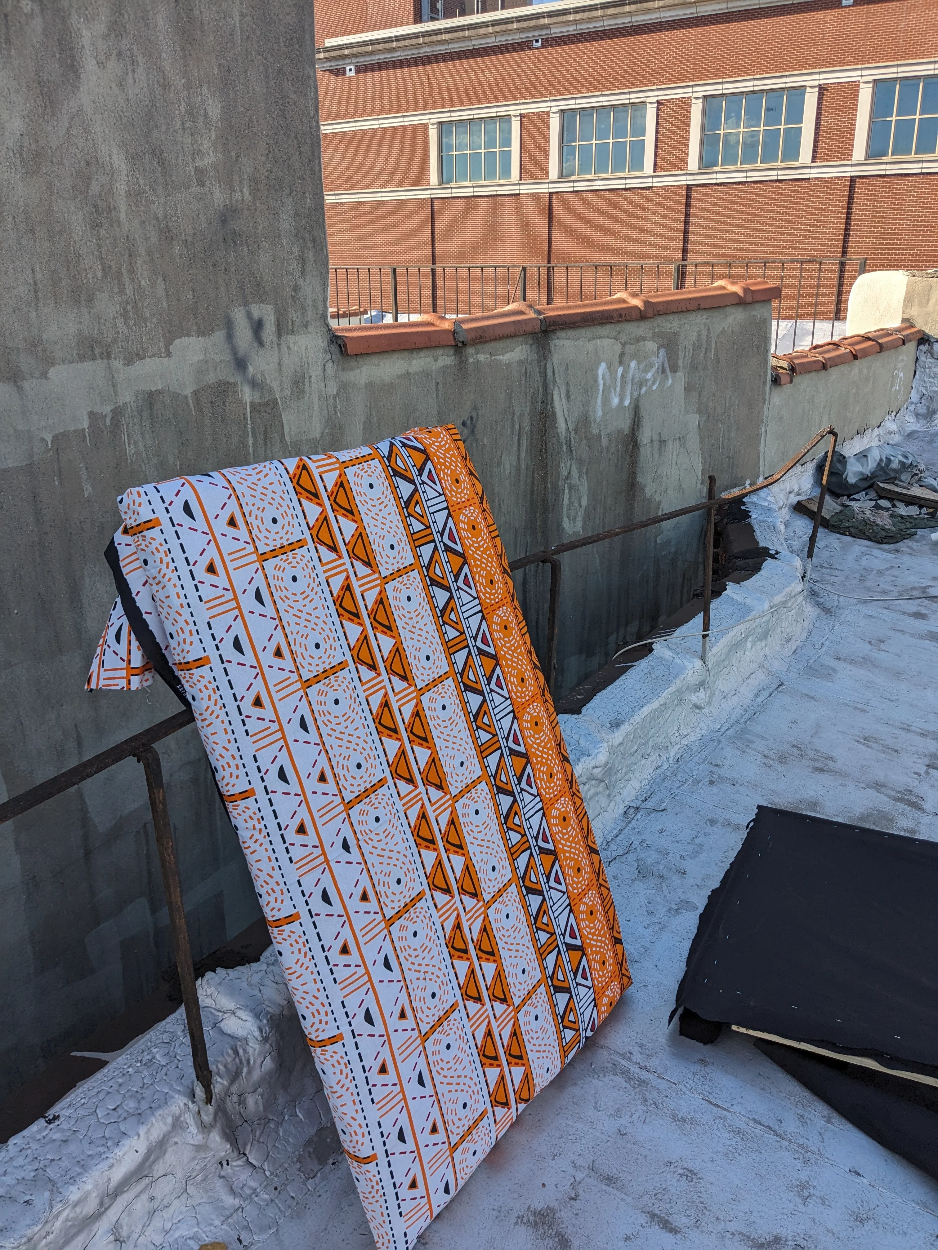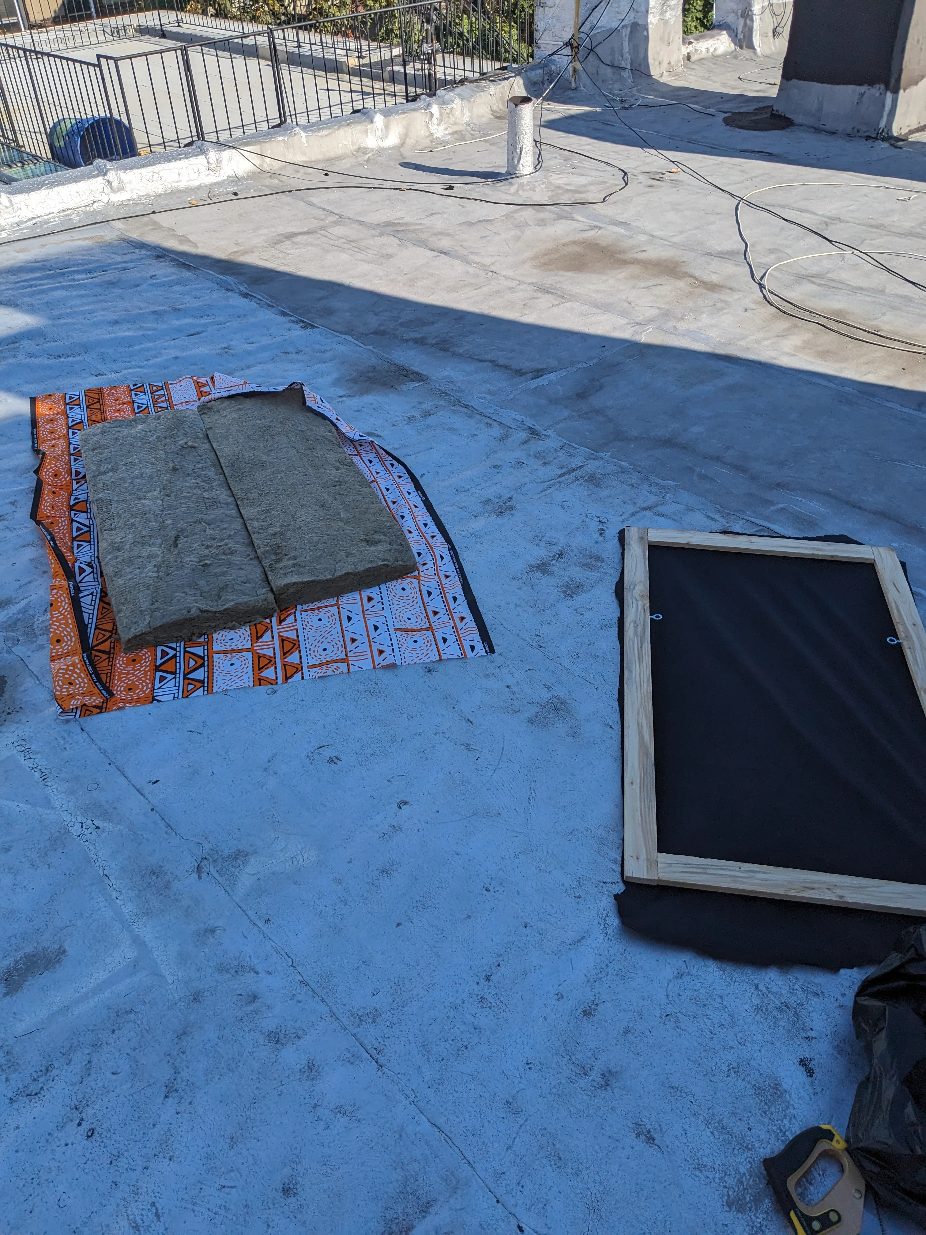 6. Laid down pretty outer fabric, laid Rockwool inside outer fabric, put frame on black-fabric-side-down, pulled the outer fabric tight and stapled all around (took almost 1000 staples for all 6 panels)