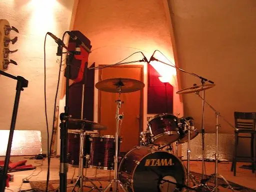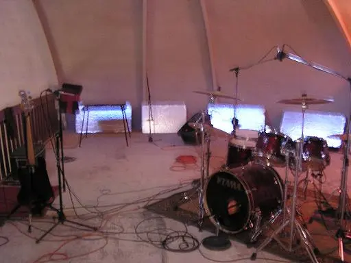 Normally domes are pretty weird when it comes to acoustics but this place has two special characteristics. It's oval, around 30'x40' at the top level perimeter, and has an open turret in the middle so the sound can diffuse. There's around a 4 second diffused reverb and the drums sound huge.