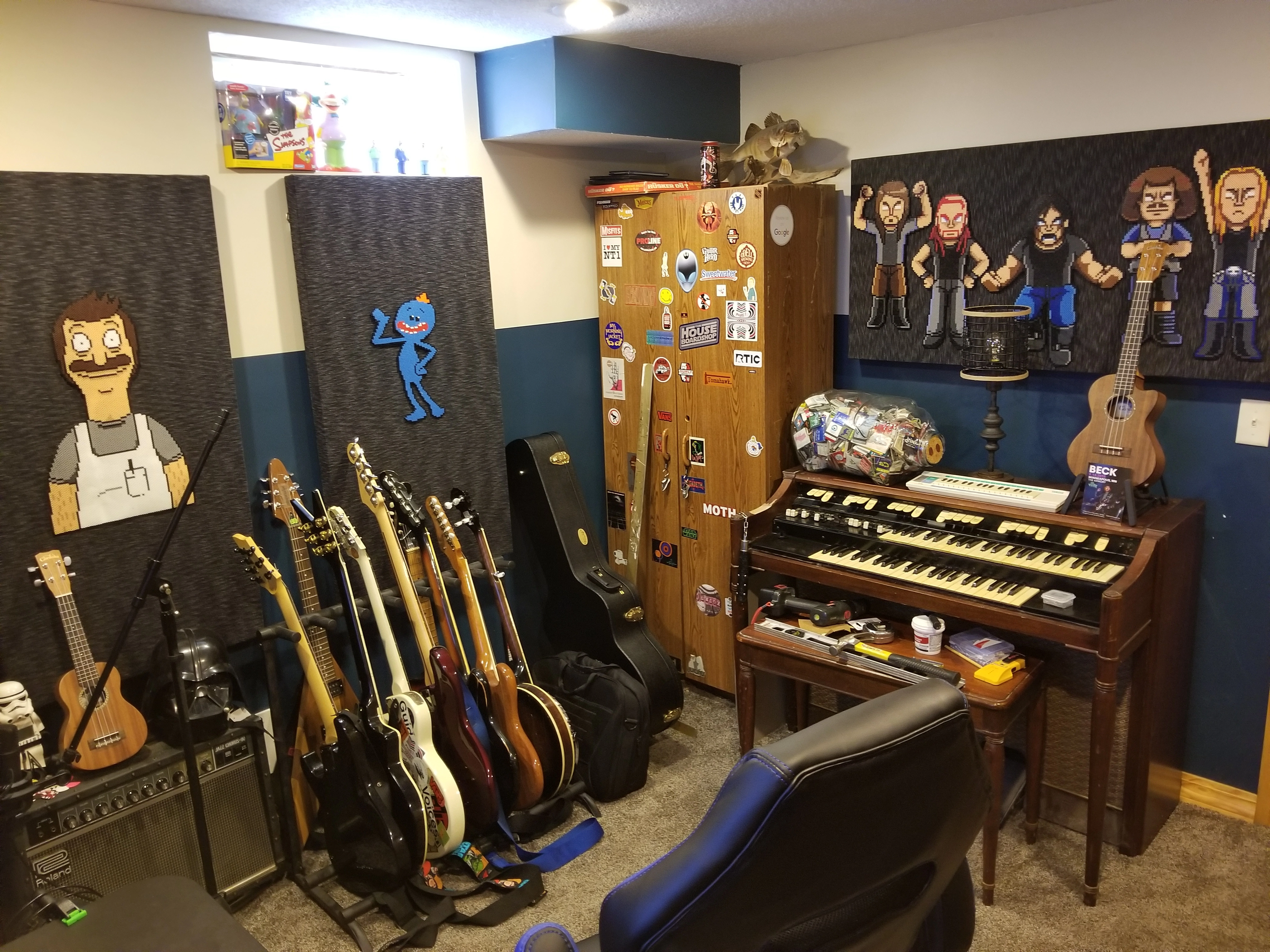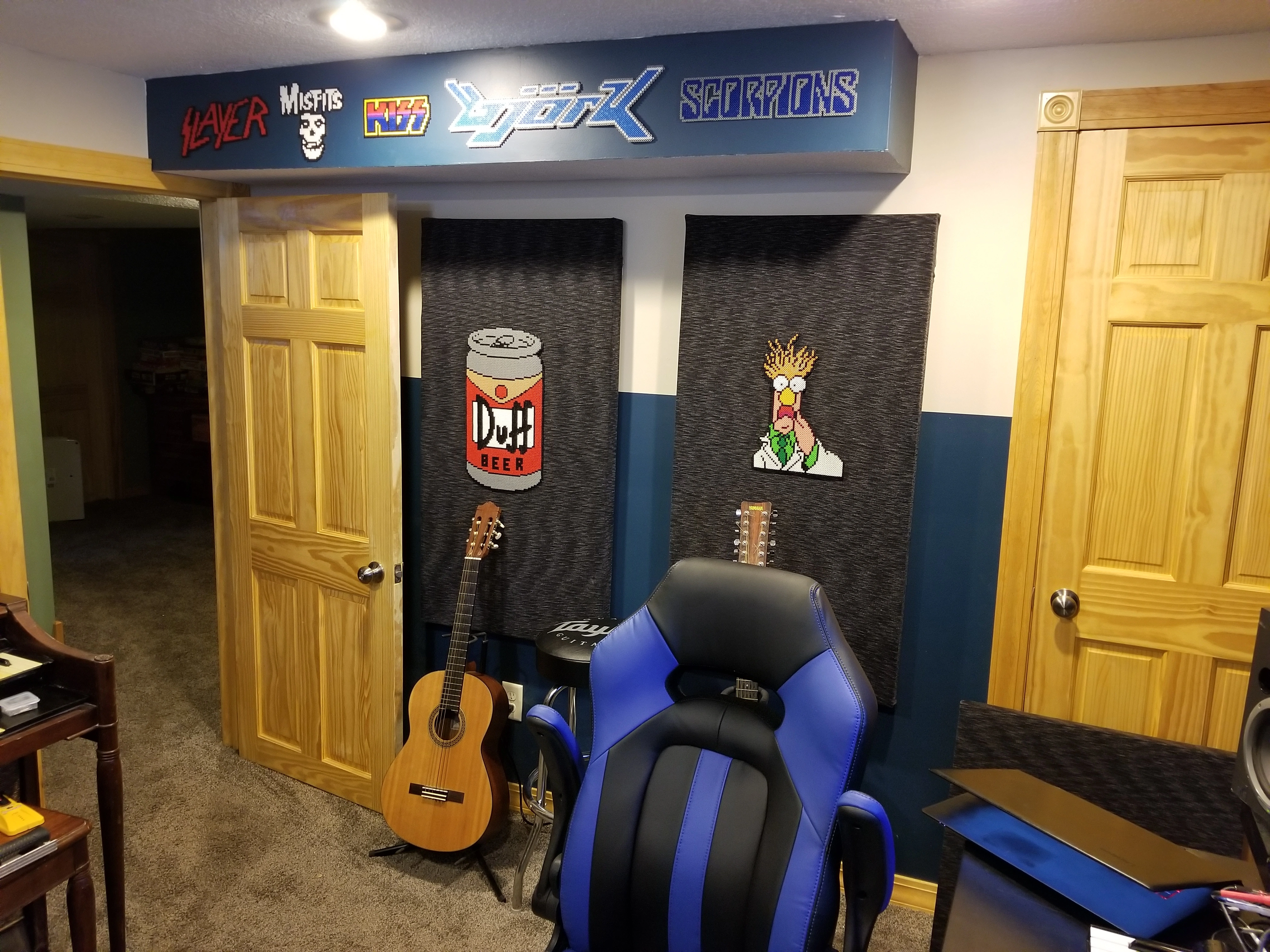 Here's my studio. It's a 10x10 room in my basement. Adding the acoustic treatment to the walls was the best decision I ever made. I primarily record only myself and acoustic instruments, plus vocals. Electric guitar and bass are usually direct and keys are typically done via midi. For my drums I use SD3.