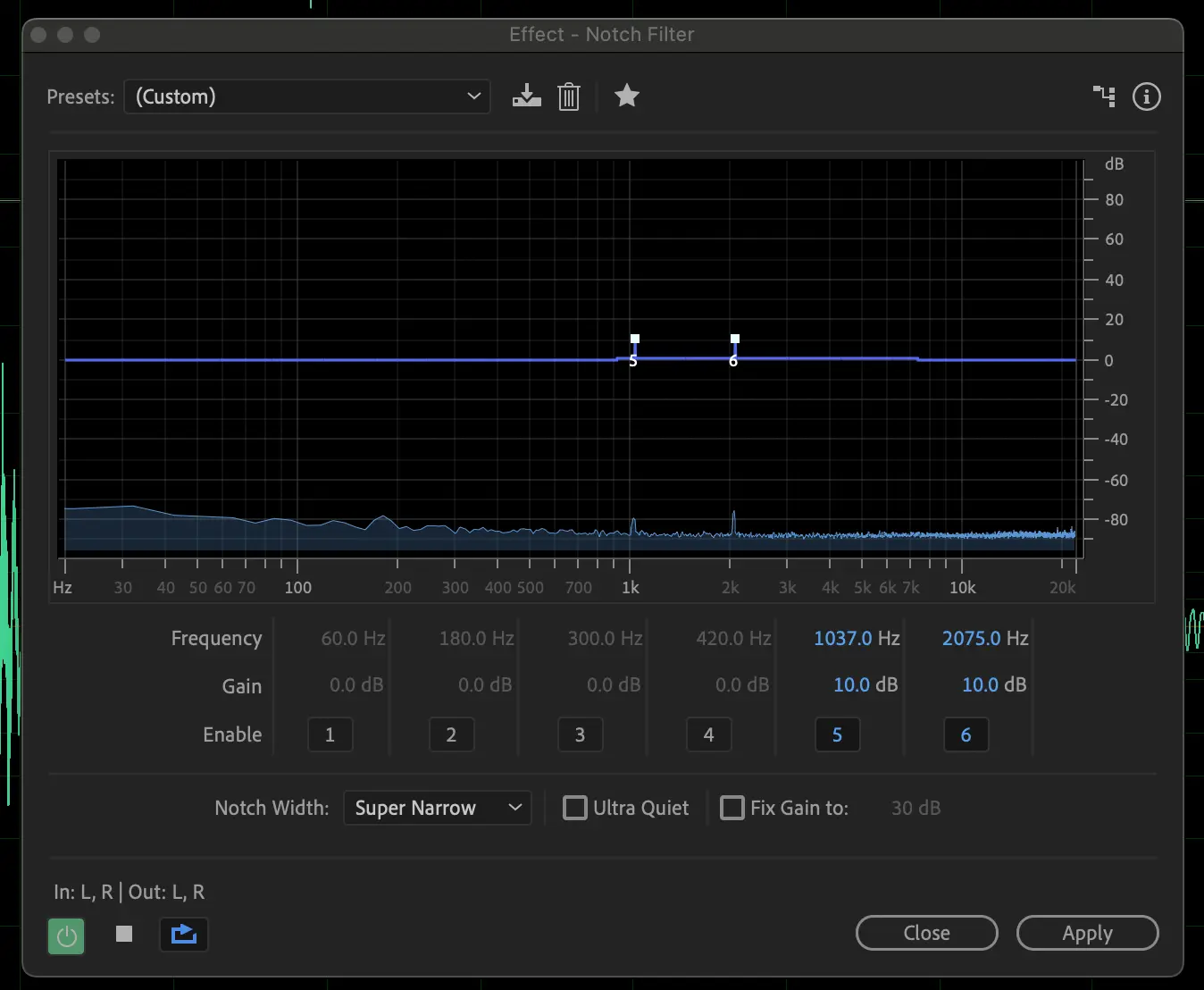 The louder of the two, which made the quieter sections of the music nearly unlistenable, centers around 2075 Hz. This is the only one I'd ever really known I was hearing. However, when I ran that filter on the tracks, I was then able to hear a second, quieter tone at 1037 Hz.