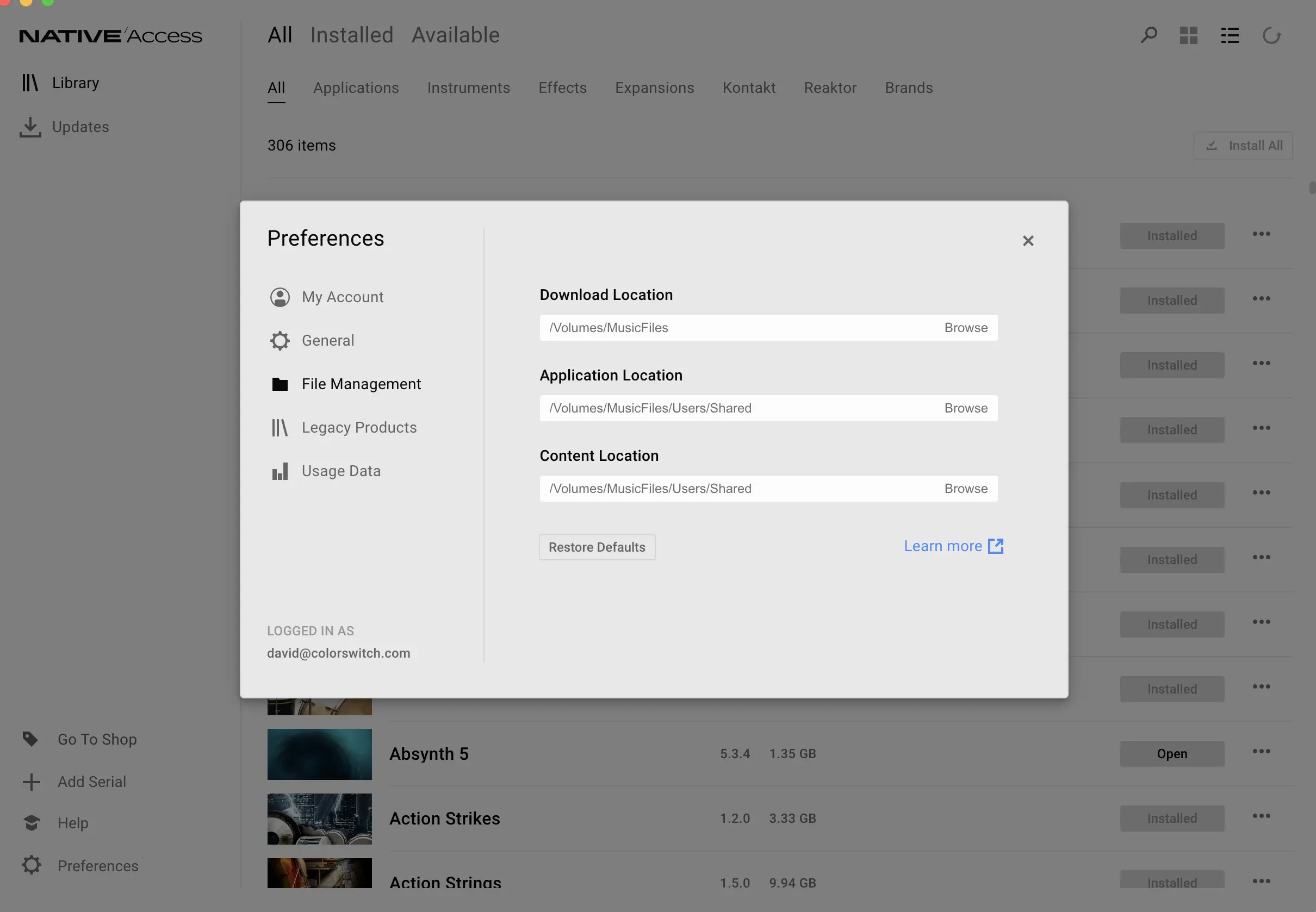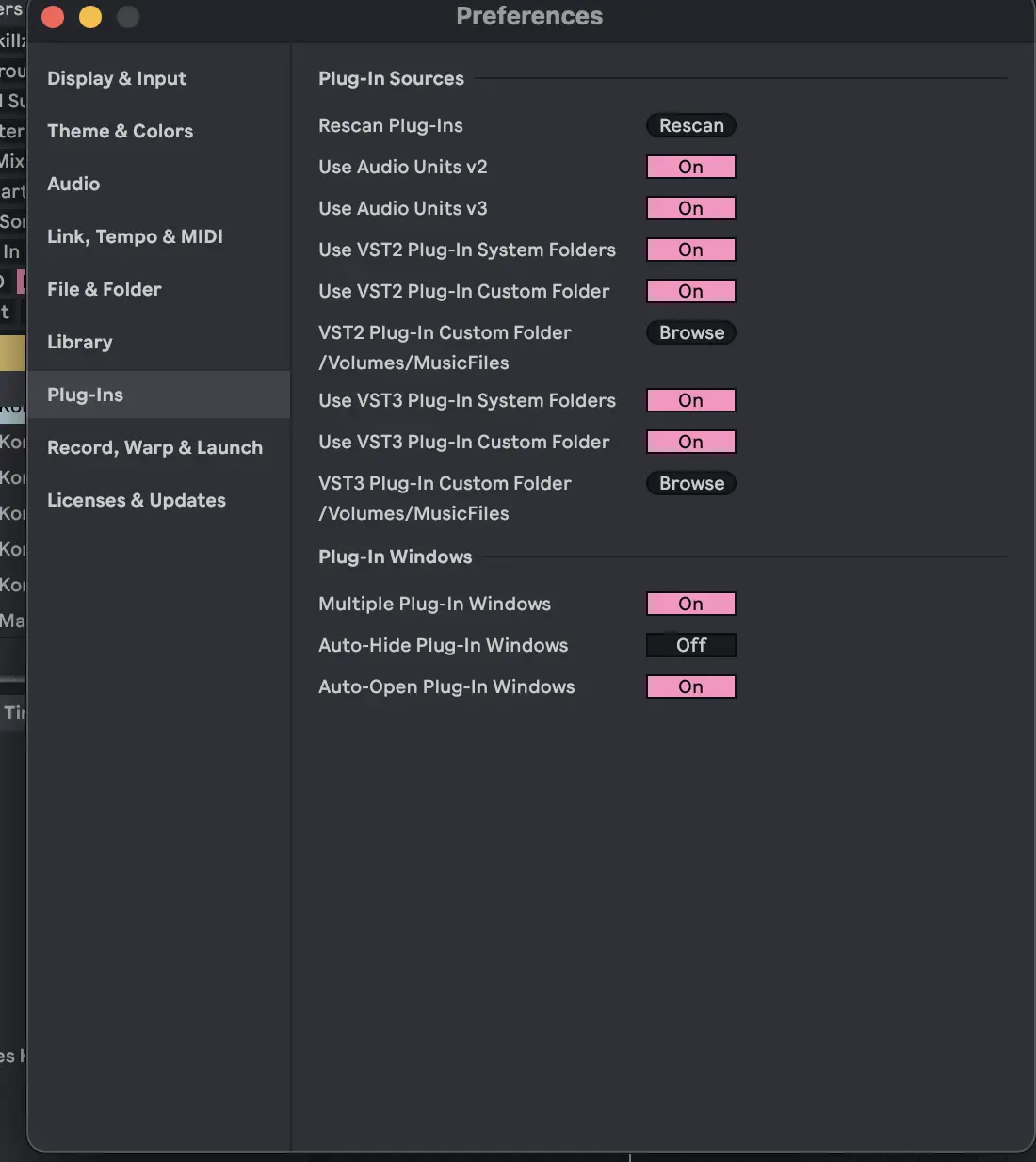 I have tried rescanning, choosing different folders within Ableton and within Native Access. It seems to be a simple setting error on my part of looking at the wrong place for the plugin, I have included screenshots of native access settings as well as ableton. The name of my external drive is "musicfiles" in the screenshots. I have my content there. Perhaps the problem is I have some applications saved on my mac and some on the external? Not sure. From my screenshots I have two folders on my external drive with native instruments items in them. One path is musicfiles>applications>nativeinstruments and the other is musicfiles>usersshared> and you can see my list of plugins. I'm not sure if this is what is causing the issue or if this is the file management that is needed? Thank you in advance for any clarifications.