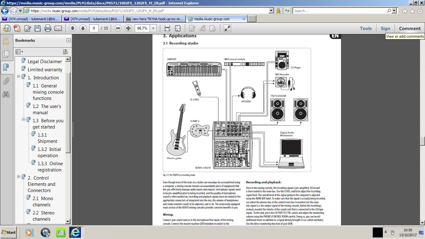 Now lets deal with your gear specifically. Set your channels up like this on your 1202. Place your main gain control on each channel (top) you will be using to the the 3 o"clock position. At the bottom of each channel set the knob labeled "Level" to the 3 o'clock position as well. This is the knob you will use to fine tune your input for that channel. Pan every channel you will be using to the left. Turn your mixer off.