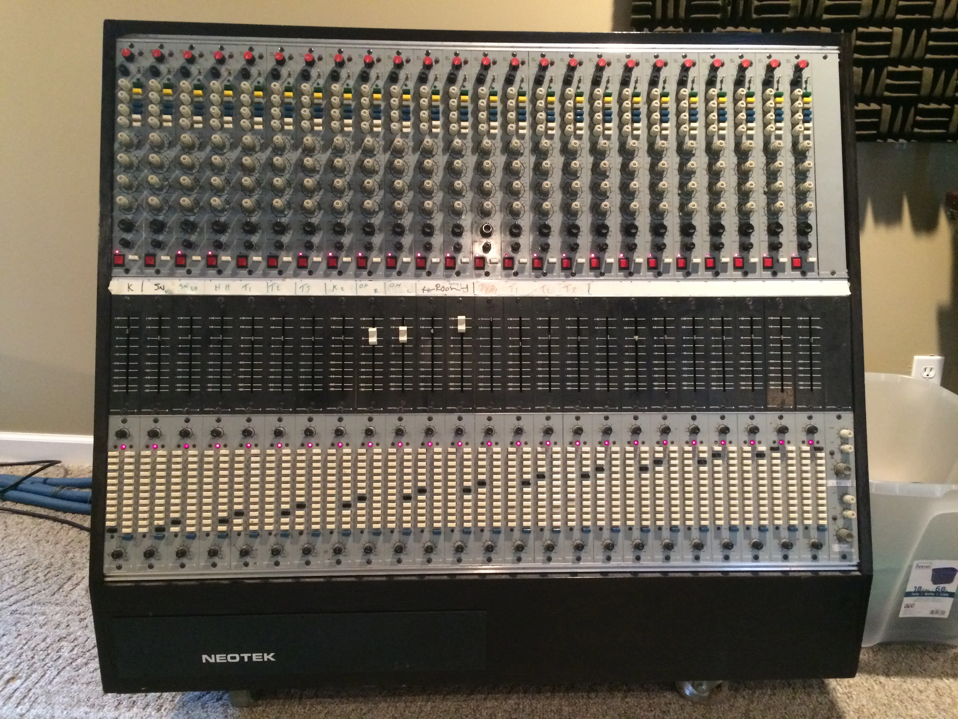 I thought I'd update you guys on a recent development at my private studio. I just got back to Madison WI from Nashville with a 24 channel Neotek Series III console that's been converted into a side car. He basically sold it to me for a song. It's totally wired up to a punchblock and patchbay, with cables coming from the punchblock that go to all my gear. My first observation, this thing is enormous. Everything is double the size of my Tascam M3500. Looking at it is messing with my mind because photos make it look like a modern, compact console, but in person it's huge. One fader panel barely fits in my hand. The knobs are huge, the pots feel totally different, like I imagine big gears underneath turning as I rotate the knob. So strange! The appearance just screams "REAL professional console'
