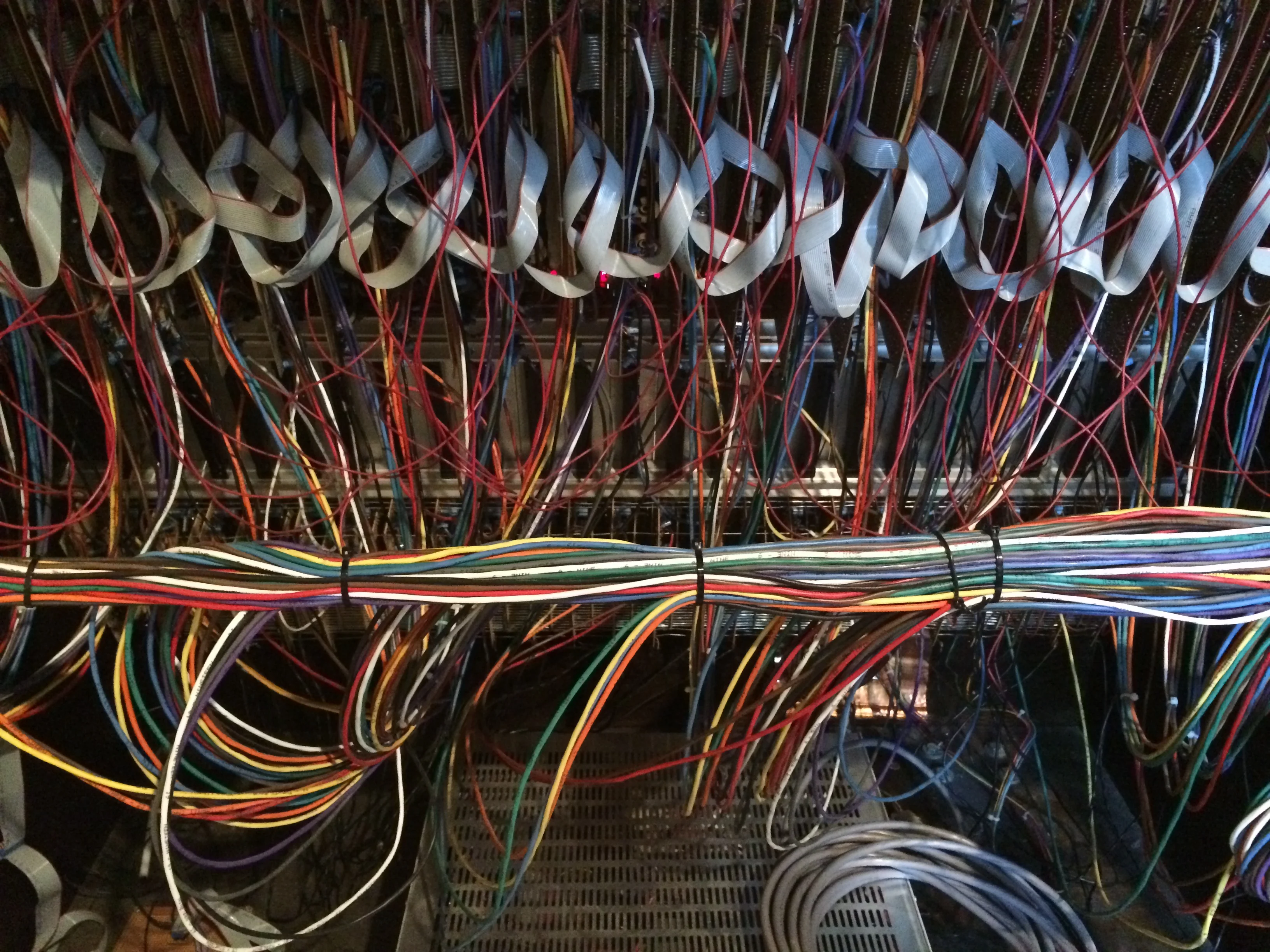 My second observation is that the wiring is humbling. It must've taken a team of technicians an entire week to run wires from the channels to the punchblock-to the patchbay. Hundreds of pounds of copper bundled in rubber so thick it looks like fire hoses coming from the console. I can see how the cables cost $thousands to purchase, and additional thousands to connect.