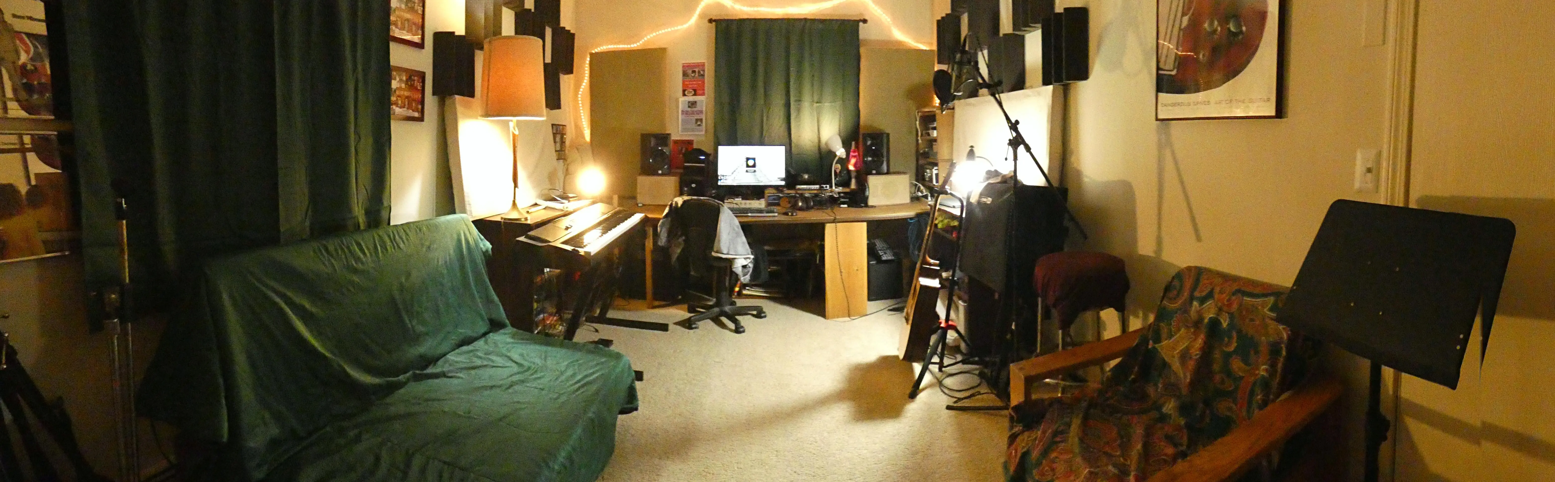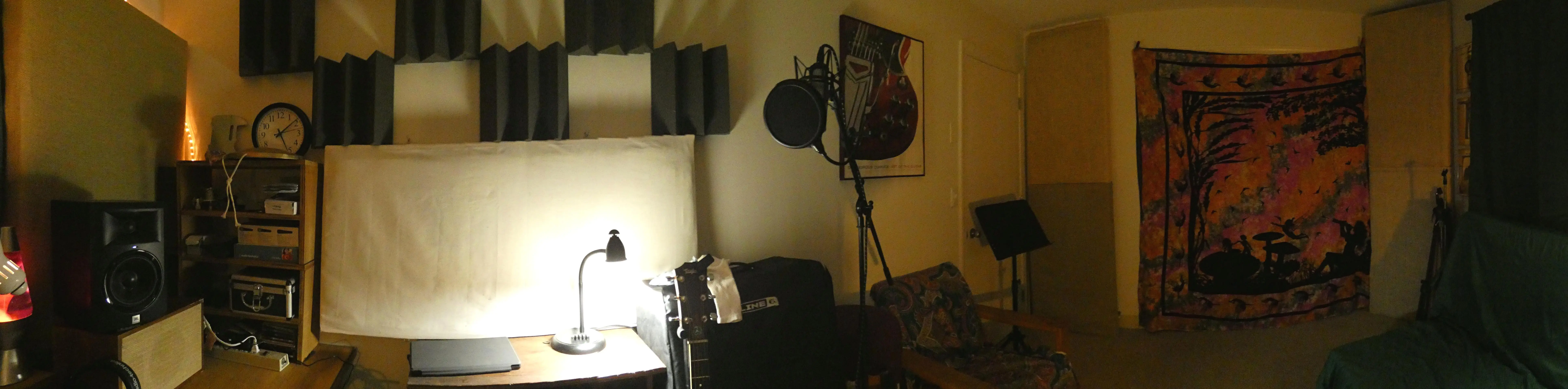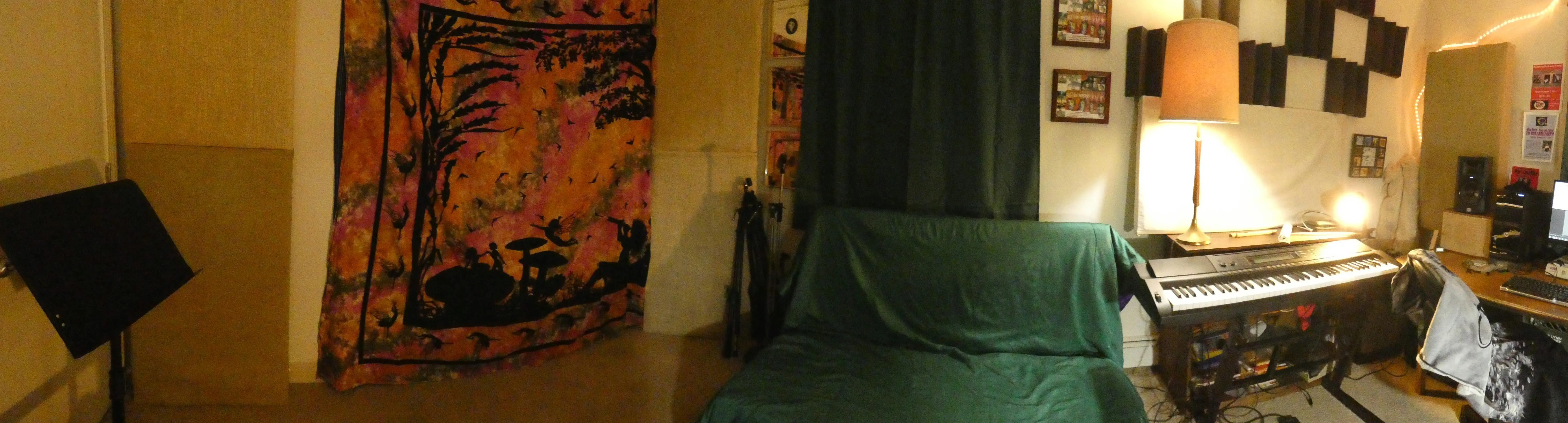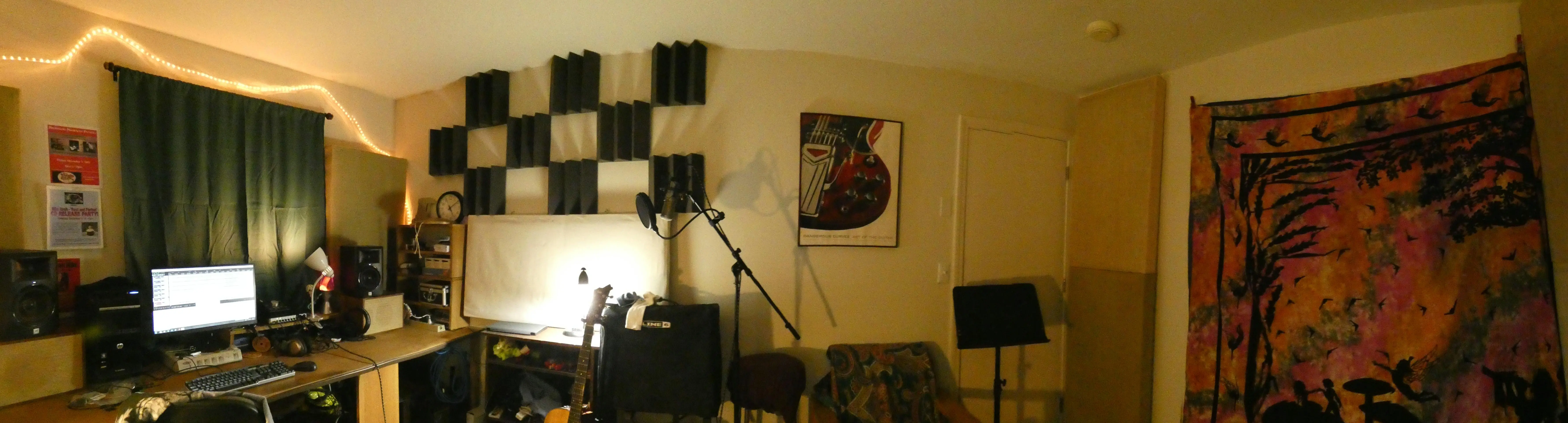 With a recent separation and move, I now have effectively doubled my space. Enough so that all my instruments plus PA gear can be stored in the closet (behind the tapestry). Just tracked a few acoustic guitar and vocal tracks, but really have not started to 'learn' the room yet. I'll miss my ceiling cloud, I know, but can't put holes in the ceiling to hang anything.