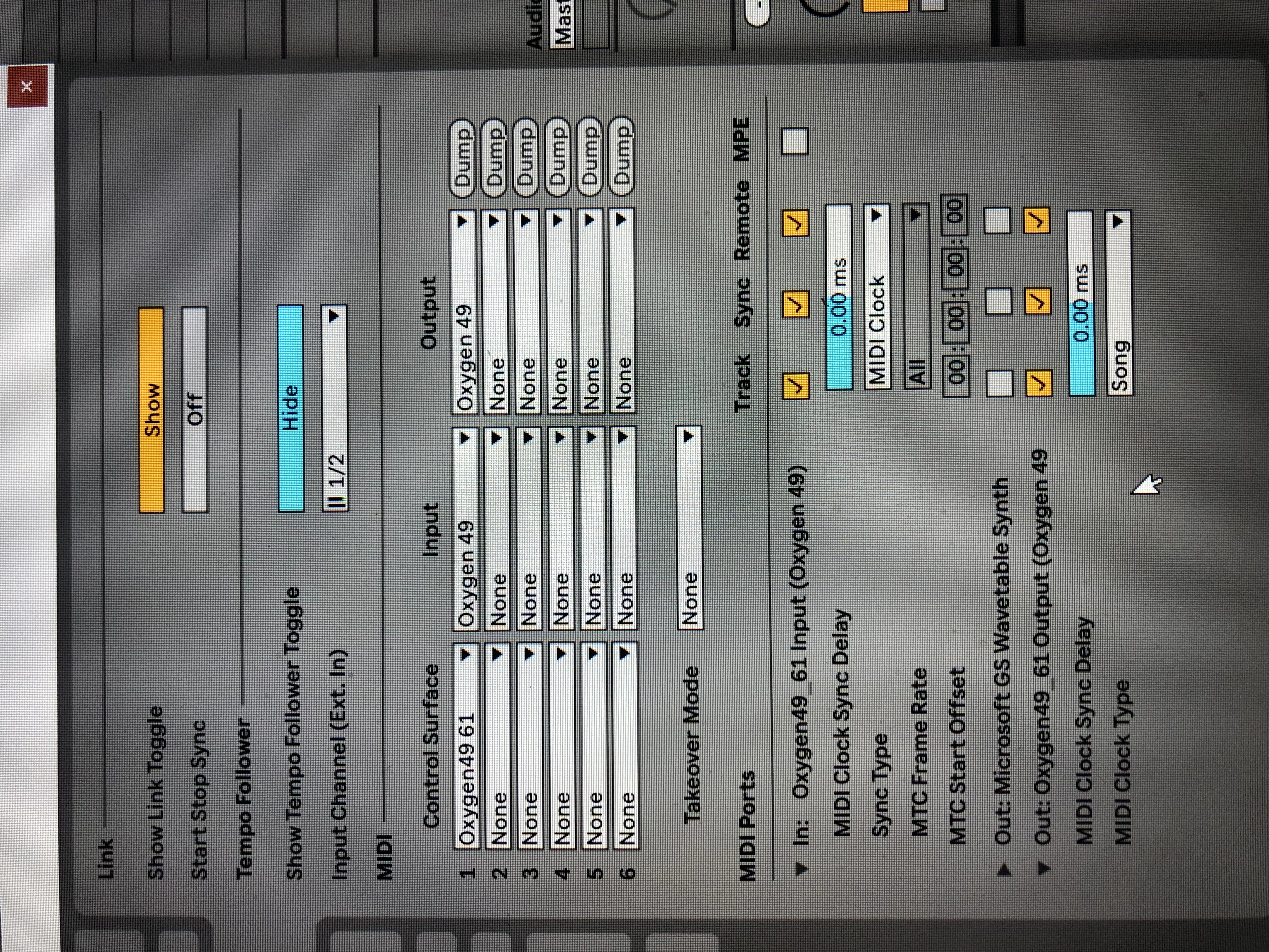 Hello, I posted this to the Ableton forum a couple days ago, but that forum doesn't appear to be very active, so thought I'd try here. I can't seem to get my Oxygen 49 midi keyboard to produce output - to play sound in Ableton Live 11 Lite. When I press a midi key the Ableton input level meter moves showing that midi input is getting from the Oxygen to Ableton. But I hear no midi output sound, just silence. I do hear the output of some audio (non midi) tracks I recorded in Ableton a few days ago. So I do get audio output in Ableton. Just not midi audio output. The Oxygen output works OK on another laptop/DAW. The Oxygen 49 appears to be recognized in the Ableton Preferences\Midi Ports Input and Output fields (see photos below), but not in the Control Surface field. The only Oxygen 49 I can choose in the Control Surface field is Oxygen 49_61 device, which may be a different midi keyboard from my older plain vanilla Oxygen 49 midi keyboard. Also, I have armed the 1 Midi Track in Ableton. So I thought that was all I had to do to hear midi input from the Oxygen within Ableton. But all I'm hearing is silence when hitting the midi keys of Oxygen keyboard. I feel like I'm missing a simple setting in Ableton (I used to use Garageband, so I'm new to Ableton). I'm using a Windows 10 laptop, Focusrite Scarlett 2i2 via USB as audio interface, Oxygen 49 midi keyboard via USB. If anyone has a suggestion/tip, or pointer to a url, please feel free to enlighten me. Thank you.
