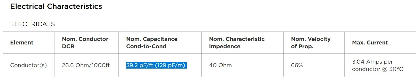 Here's the spec for Belden 1192 star quad microphone cable. Notice the conductor to conductor capacitance value of 39.2pF/ft. The longer the cable, the higher the resistance, and the higher the capacitance. It really comes into play when you have a high impedance signal to start with. That's why you don't want to use 50 ft cables on your guitar, the capacitance will change the tone, just like a tone control.