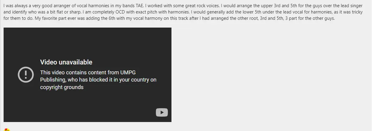 I was always a very good arranger of vocal harmonies in my bands TAE. I worked with some great rock voices. I would arrange the upper 3rd and 5th for the guys over the lead singer and identify who was a bit flat or sharp. I am completely OCD with exact pitch with harmonies. I would generally add the lower 5th under the lead vocal for harmonies, as it was tricky for them to do. My favorite part ever was adding the 6th with my vocal harmony on this track after I had arranged the other root, 3rd and 5th, 3 part for the other guys.There is no way...... it is on the internets for eternity or you could edit the post and delete it but I encourage you to leave it up...nothing to be ashamed of there...good pipes and good playin brother...not perfect but frickin listen to the Beatles basement tapes and realize you did a fine rough cut...