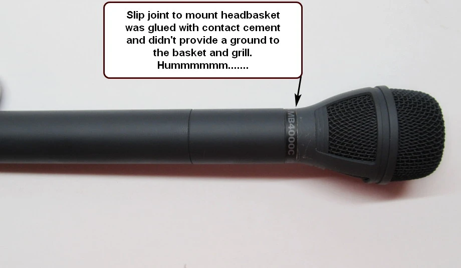 I don't remember how half my old mics sound and maybe some may sound better on the newer gear I have, so I've pulling out a few to give a try. Bought this AT MB4000c back in the late 90's as it would run off an AA battery for the old Fostex 4 track cassette deck that had no phantom power. Plugged it into the mixer last night and right off I heard a light hum. Touch the headbasket and it got markedly worse. Scraped a small amount of paint from the basket frame and ohmmed it out back to the pin 1 ground of the XLR connector.... infinity/open circuit. Carefully removed the mylar label around the body and some seepage of contact cement was visible near the slip joint where the headbasket assembly connected. I have no idea if internally a ground was somehow attempted to connect the body to the headbasket or AT relied on the metal making contact. To get the headbasket semi-connected to the body I ran the blade of an Exacto knife around the slip joint seam to abrade the aluminum and this seemed sufficient to get my resistance reading down to zero. The mic now has zero hum and sounds pretty good for a not expensive mic.