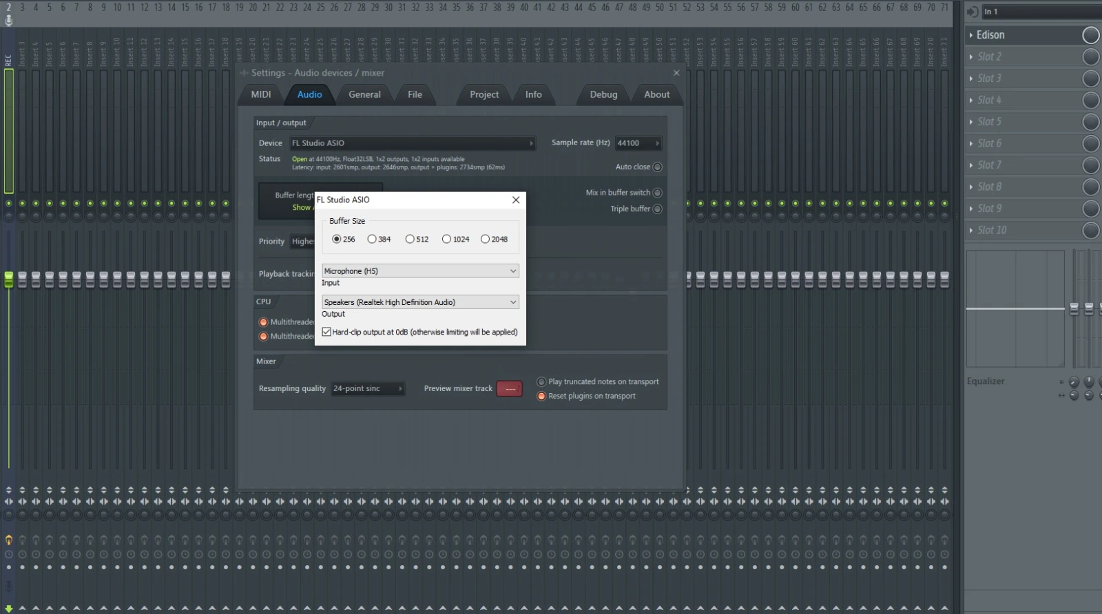 When I plug it in, it gives the option for SD card reading or audio interface. I select the latter. The computer recognizes it and lets me select it as an input/output on the FL ASIO driver. I can then connect it to the edison plugin for recording and....there's just no sound. I have these settings: