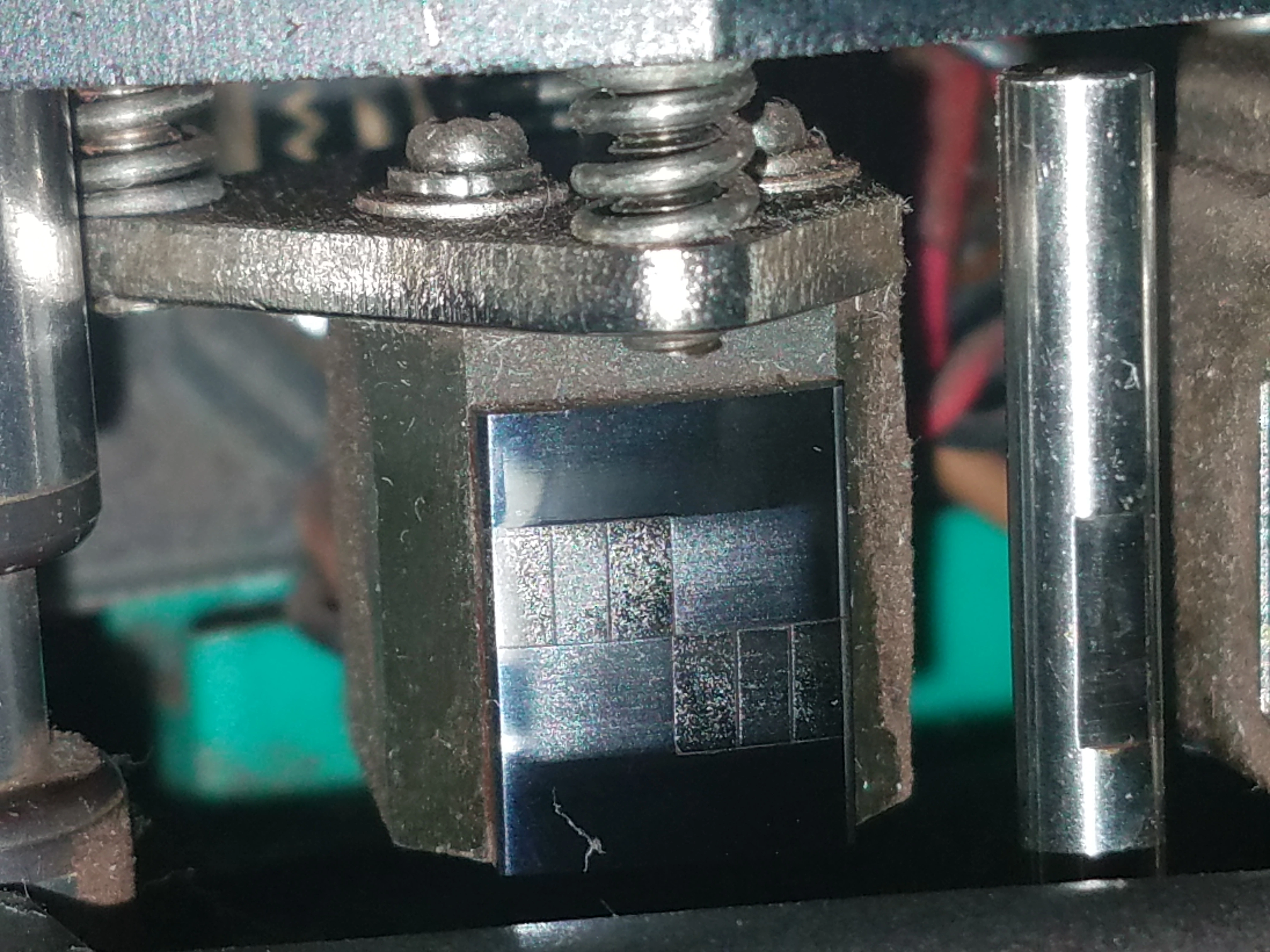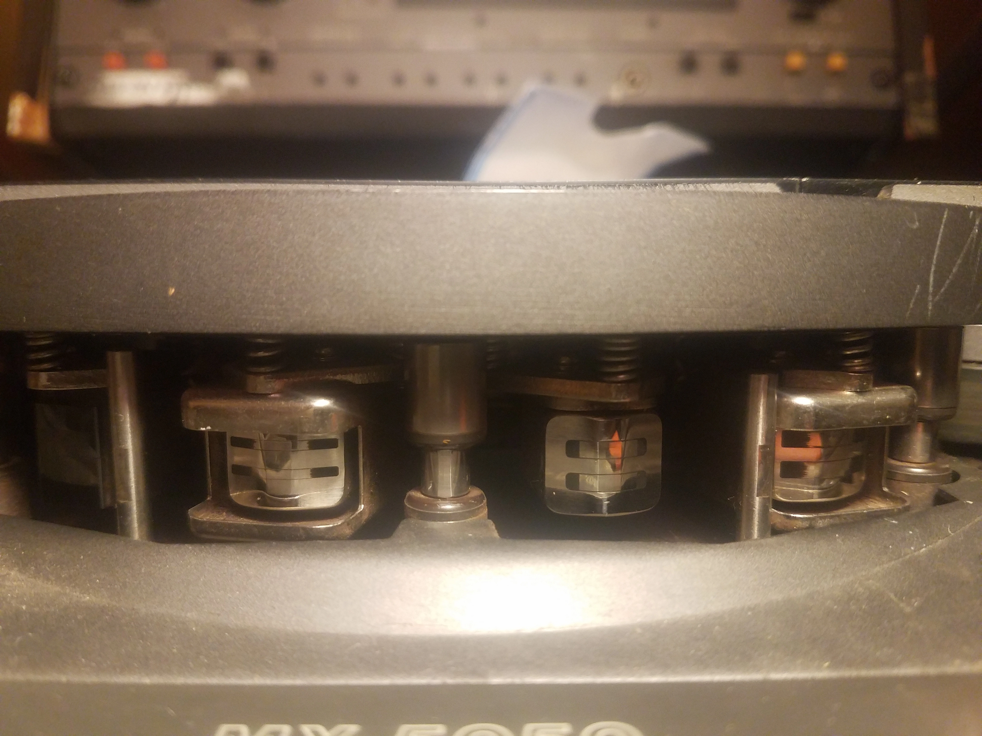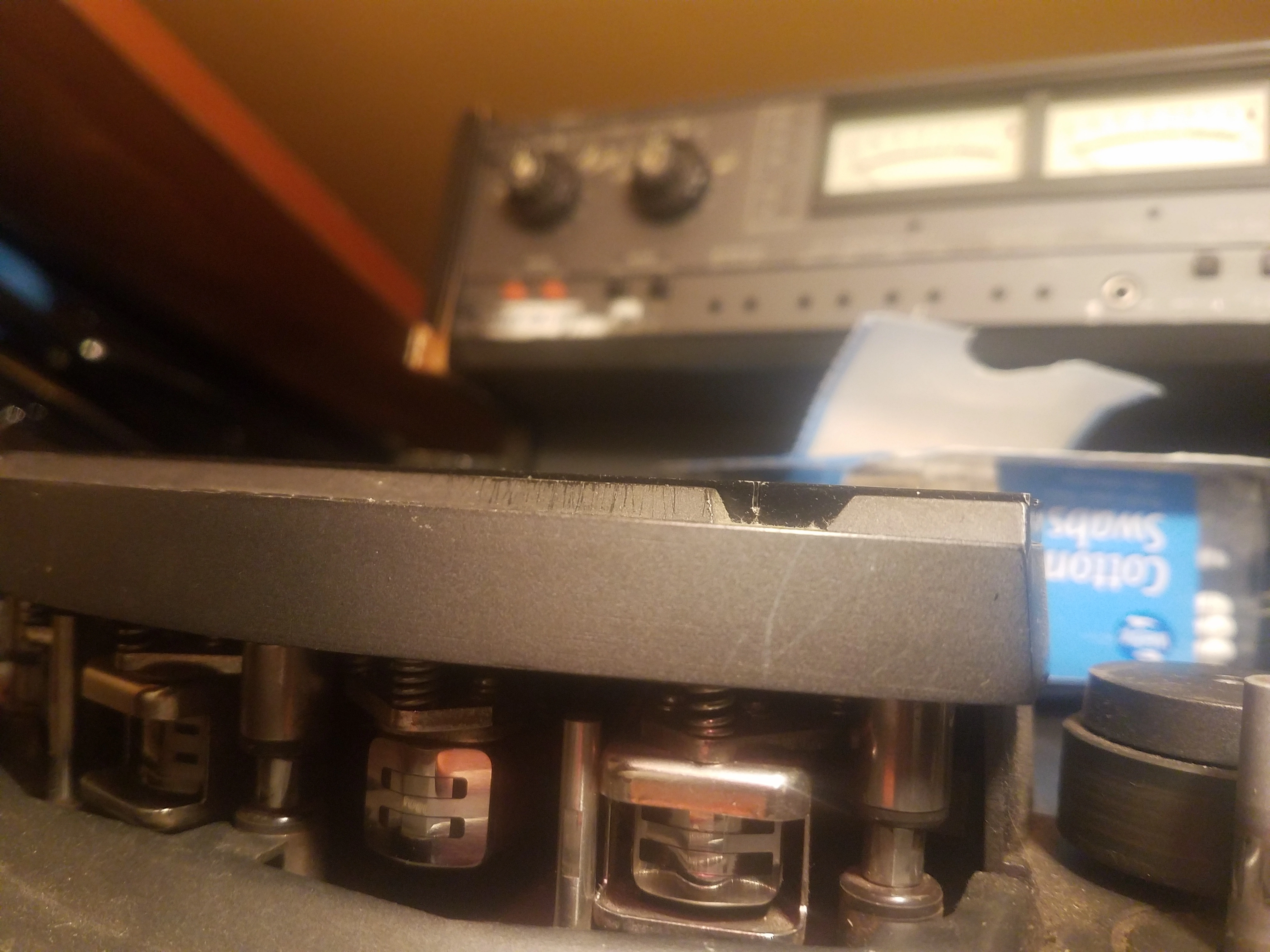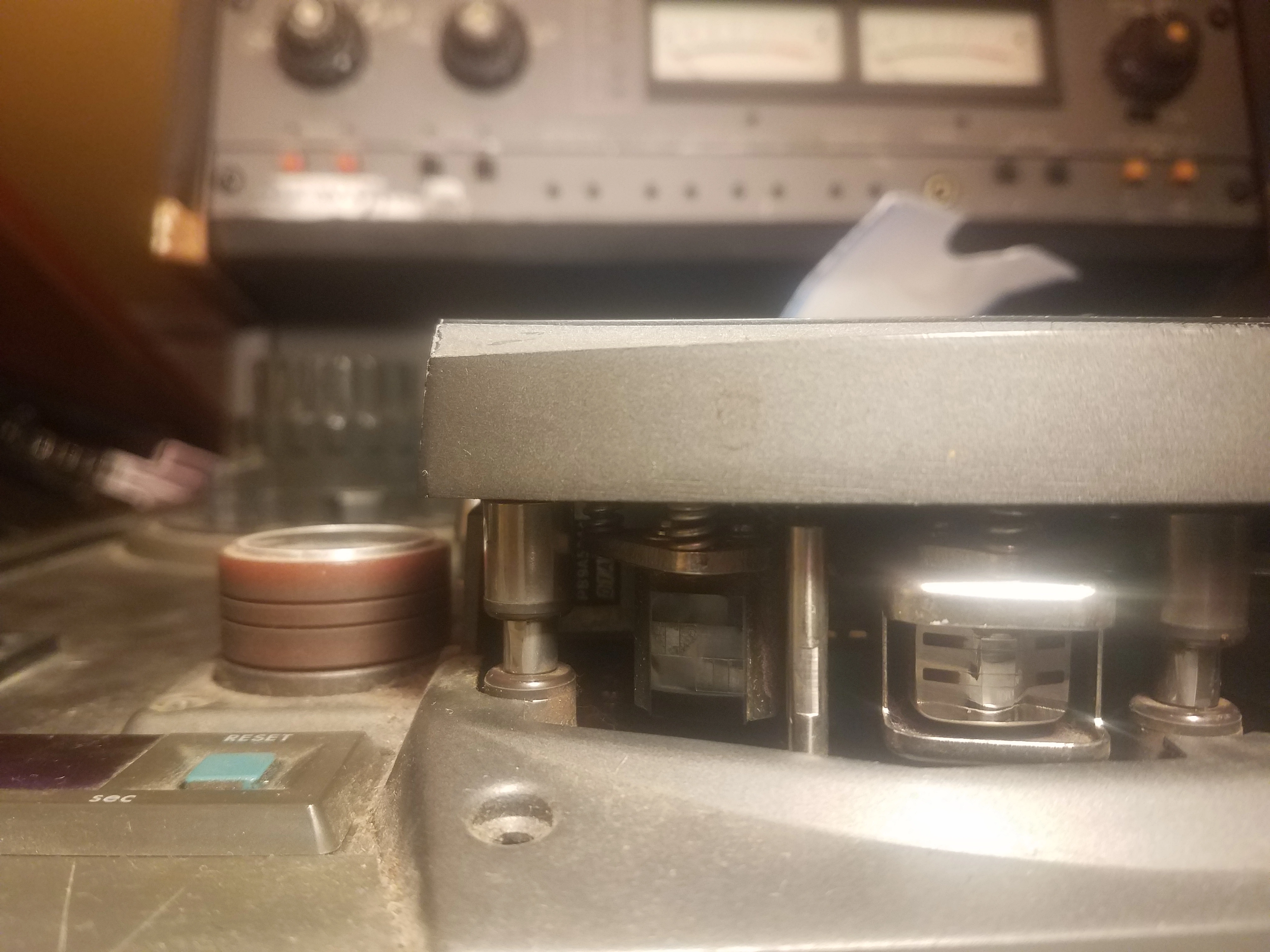 1. There is a completely black head marked ER above it (I presume that means it's the erase head) located all the way to the left. I'm thinking it's probably not stock but I don't really know much about this stuff yet. Anyways, the head has a dull mark on it that doesn't seem to be coming off. I'm thinking it may be really old tape residue but I don't know for sure.