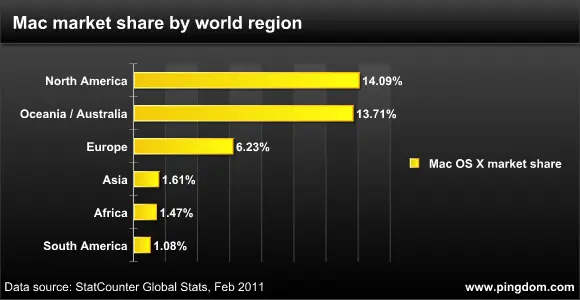 Speaking of which, my figure of 12% of computers in use being Apple came after some Googling. Figures ranged from 9% to 15% but several sites (and the most recently dated ones) mentioned the 12% figure so I used it. Note that this figure is for desktops and laptops; tablets are not included. Some of the sites I mentioned were the US market, others were the world market but differences were relatively small. Here's a chart from the OSX Daily website giving individual stats for every world region. It's about the most "pro mac" of all the sets of numbers I found: