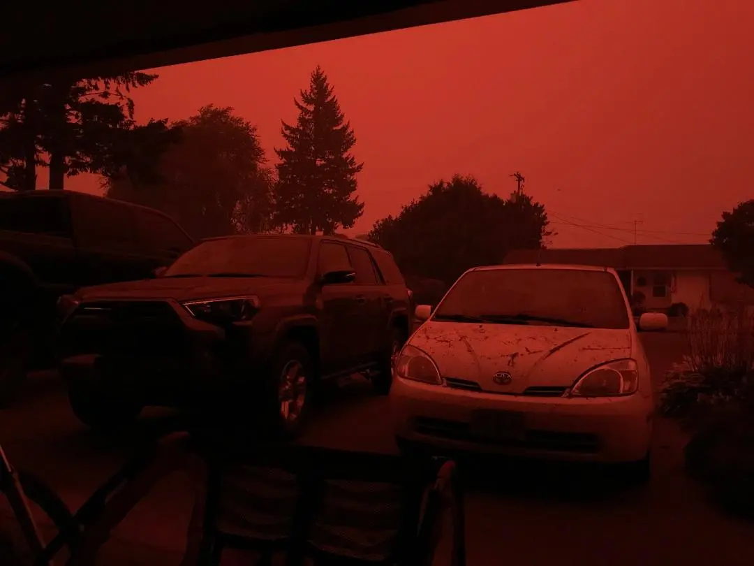 He sent this one picture of what the sky looked like...you can even see some ash/soot on the cars!