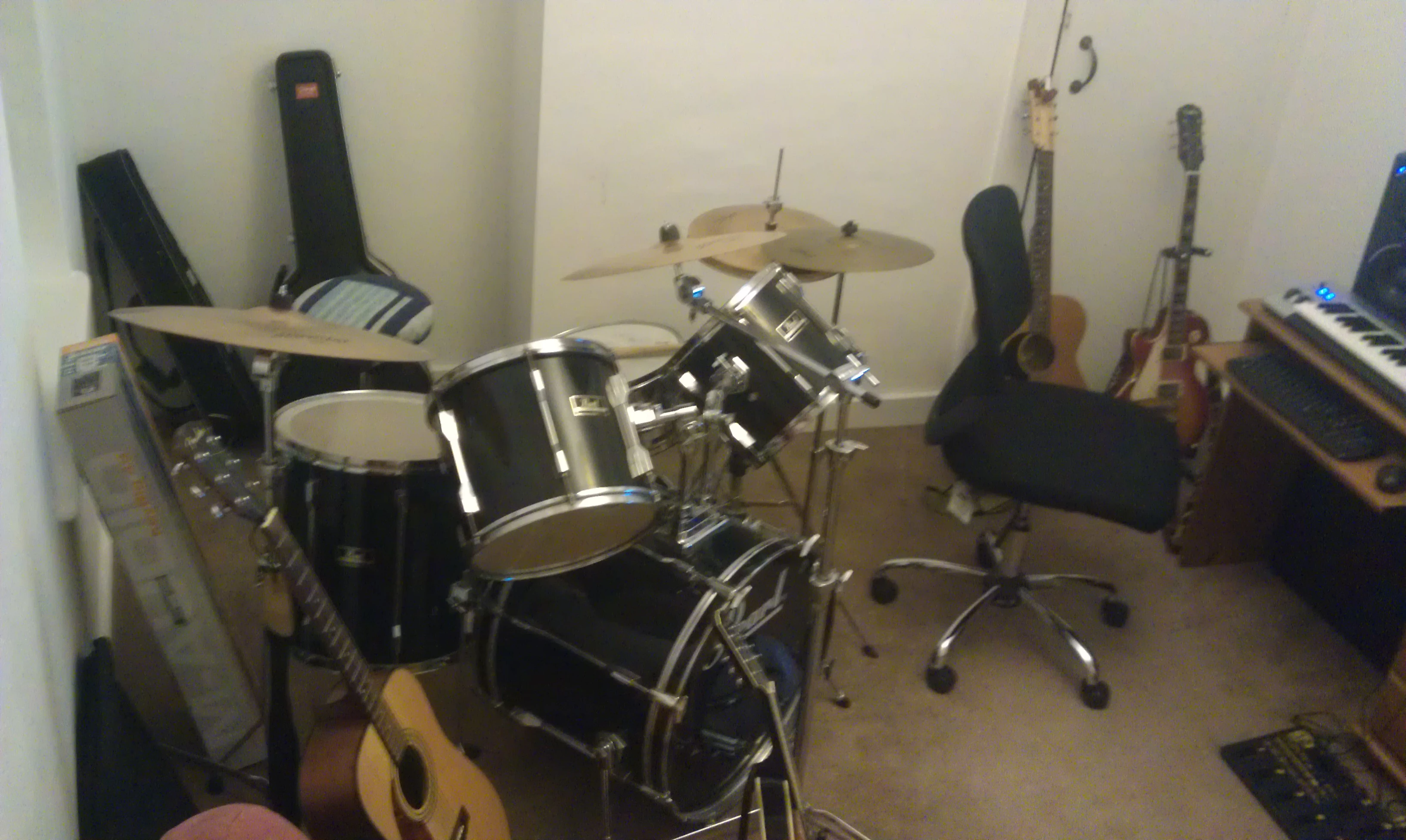 Not to knock electric kits but in the end, they just didn't work out for me. A bit like double bass samples. They're great and all, certainly for some applications but I found that they simply cannot replicate some things that I take for granted so I just went and bought one last month. And that's what I did with the drums at the end of 2006 or thereabouts. I spent a while looking for cheap kits and this set caught my eye. It was an Arbiter flat lites kit and what stood out was it's storage capabilities. When the ad said it fitted in two bags, I thought "oh ?....". I read as much on them as I could find and the few drummers that had them said they were OK in certain situations.