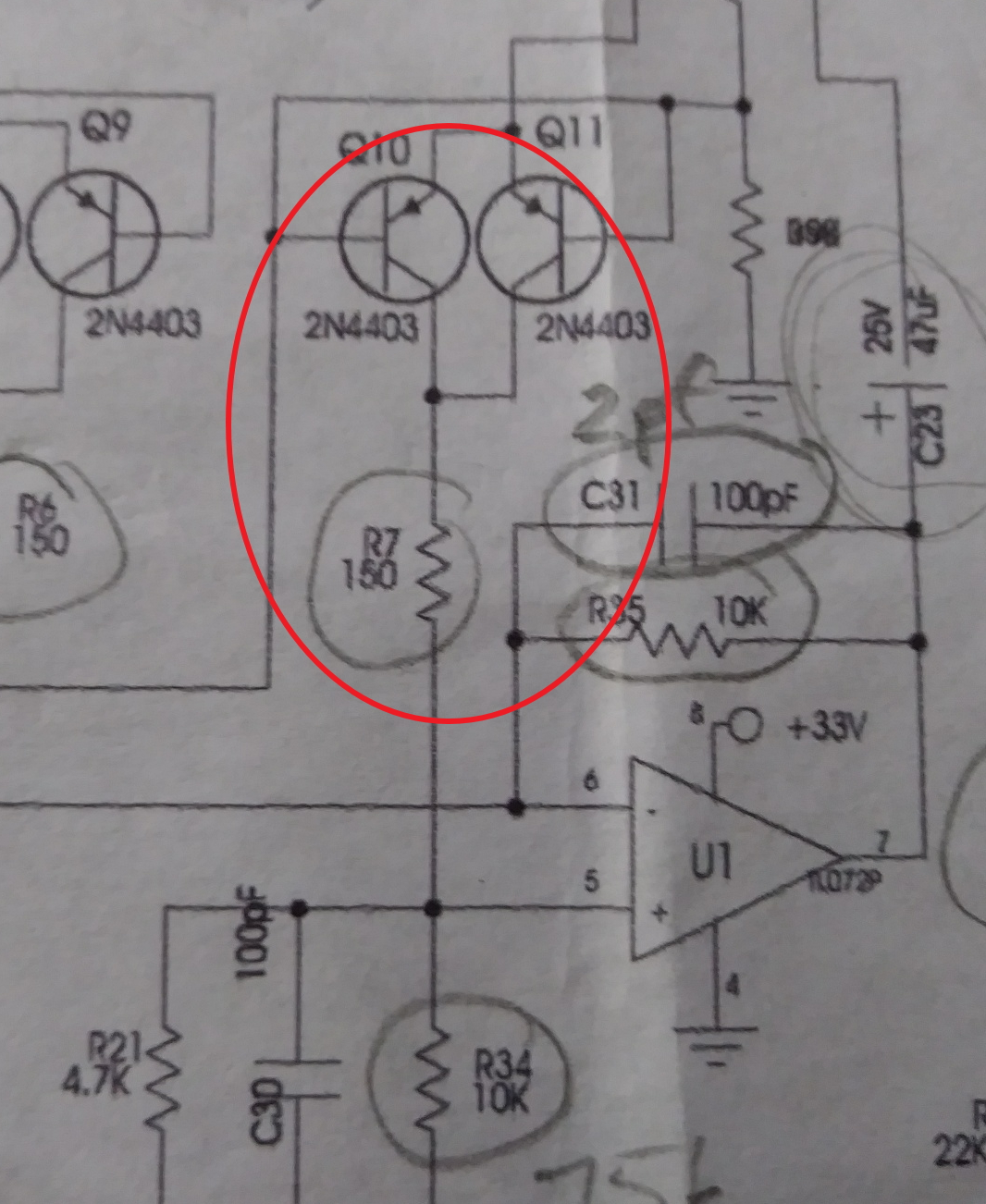 On the attached schematic, it's R7 (150 ohm). I'm getting continuity on the one leg that's going to R34, but on the end that's going to the transistors (Q10 and Q11), I'm not.