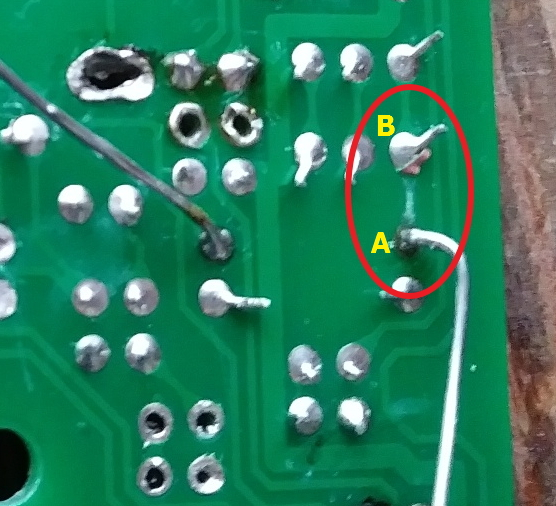 If it is indeed a lifted trace, I have no problem making a jumper. Before I do that, though, I just wanted to double check that there's nothing special about checking continuity with transistors. In other words, I should be able to get continuity from the point A (top leg of R7) to point B (transistor), even without current running through the circuit, correct?