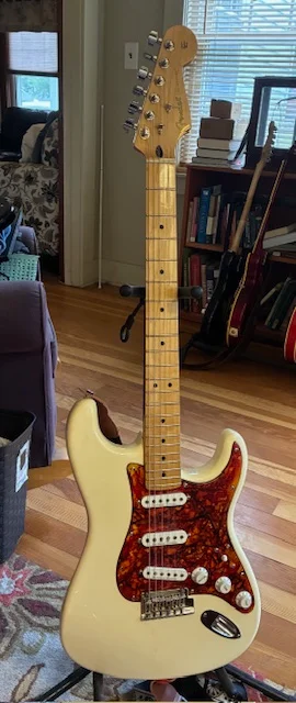 This is a USA body with a MIM maple neck, The pups are Seymore Duncan SSL3, SSL5-RWRP, SSL1 from neck to bridge respectively. The neck is blocked. 2 point bridge. Locking Fender tuners. The pickguard was painted by my wife, Robin. It was one of her first. It's a 3 ply done with alcohol paints. We did a little extra and it came out with a very nice 3D texture that almost feels like leather. I actually chose the parts based on the pickguard because it deserved it. It's quieter than I would expect from a Strat. Really nice player. The most versatile of my Strats. In parts, more expensive than new, for me it's priceless. It's never out of my sight.