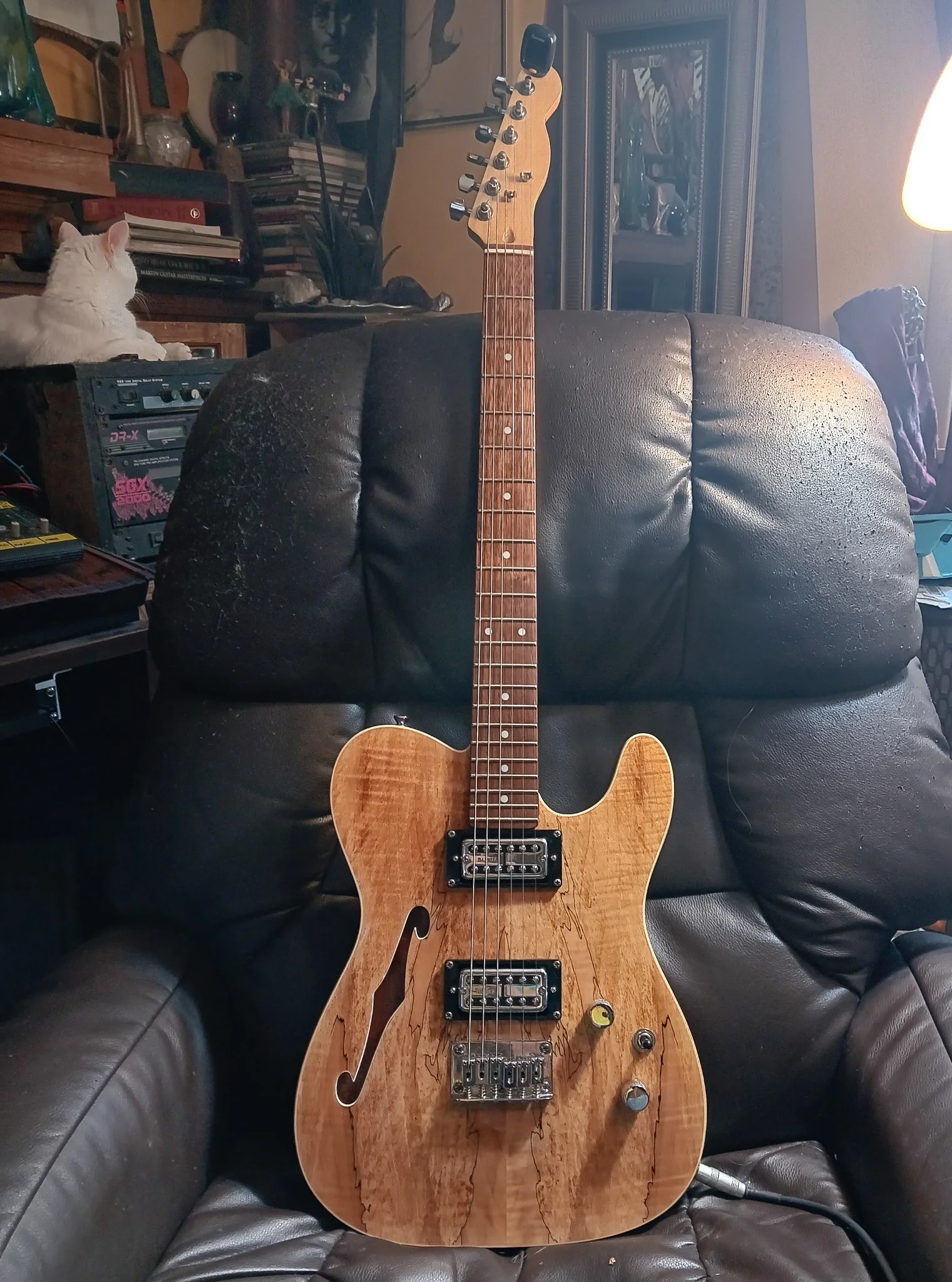 This guy is MIM. It has a 6 point bridge, roasted maple neck, Fender lockers. The neck has a really gorgeous grain. This is set up for tremolo. The pickups are Lindy Frailin Vintage Hot pre-wired. Treble bleed with a blend pot. This guy is a little odd. It sounds completely different depending on which amp and stomps I use. For the most part, to me, it's very thin. It also quacks like crazy. It sounds best through the Blues Junior, but it really needs to be driven, HARD. Beautiful weight, great neck, feels really nice and balanced. It's a lot of guitar with those pups. Again, more $$$ than new. It could be on the block. I'll take a loss, but, hey.
