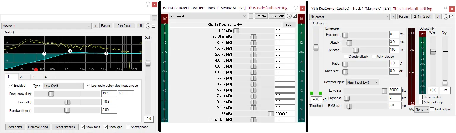 This song was originally recorded by our band as 8-Track analog tape. Years later, it was copied and edited with, maybe..., audacity(?) and sent to me as an .mp3, I did some graphic EQing in Windows Media Player and made copies for my .mp3, and a CD for my car's Bose system. The versions I post below are the(Pre Reaper) Audacity(?) flavored version, and (Post Reaper) after I made a few adjustments using ReaEQ.