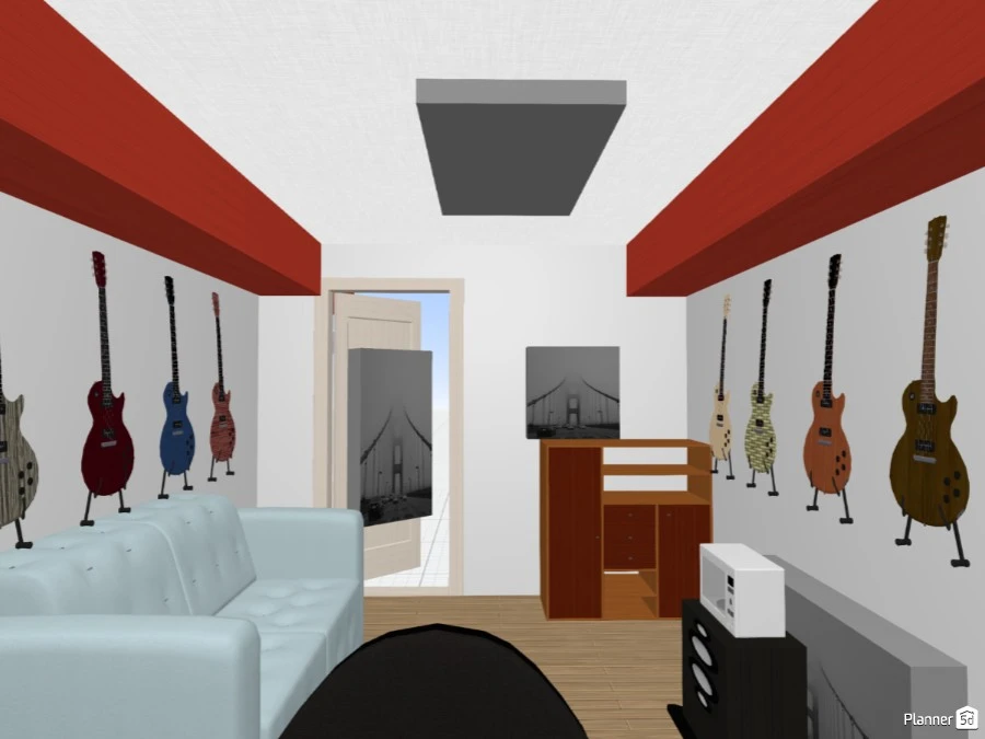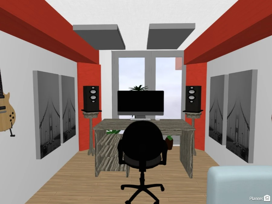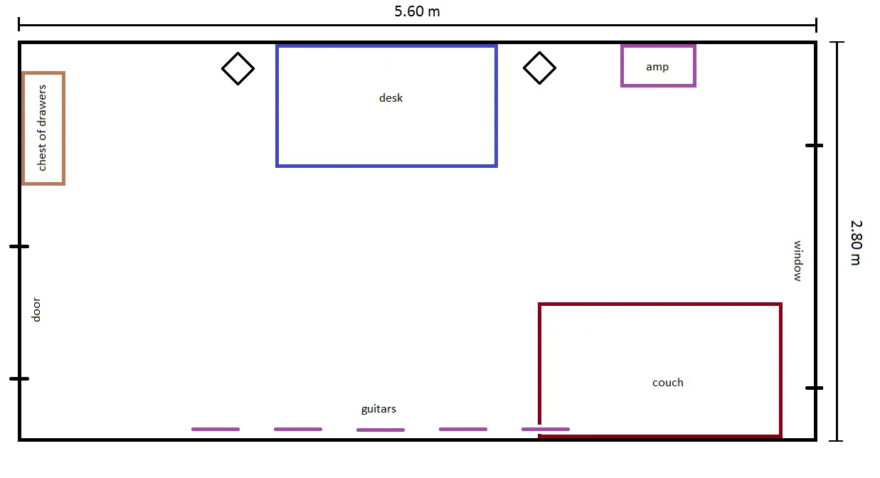 I made a little sketch to show how the room will be roughly organized. I should be able to put bass traps on each corner, but I am not sure if I can put panel in the back if hanging my guitars too (that's not been done yet, so I still can do that accordingly).