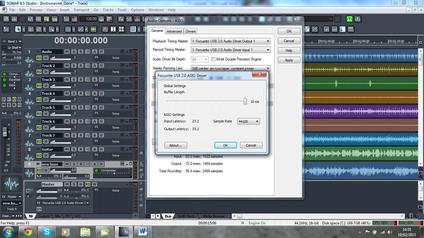 Problem is playback skipping/choppy. I have 6GB ram, i5 processor pc. Using Focusrite Scarlett 2i2 USB for recording. Sonar 8.5. I originally had the Driver mode set to MME (32 bit). This was difficult to use with the Latency and because i'm recording whilst listening to playback it becomes very difficult to work out the correct latency offset to use.