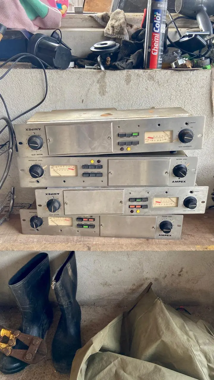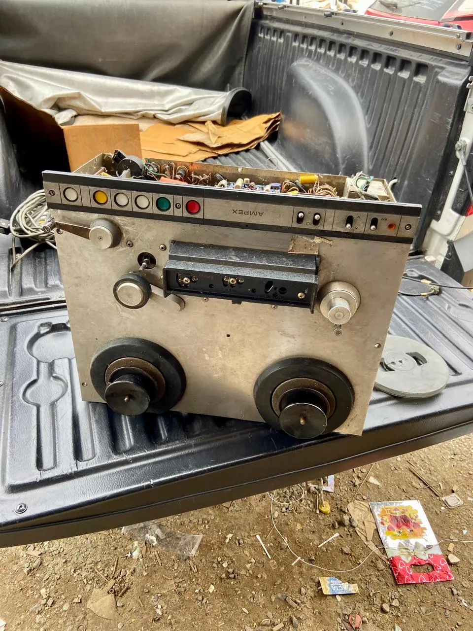 While picking up a Tascam Model 10 from a house being cleared out by a scrap dealer, I had the unexpected luck of stumbling across something much more exciting — a mono Ampex 440, mostly intact and sitting among the rubble. Even better, I also found four preamp modules from another Ampex 4-track machine that apparently was too heavy to be taken by the guy clearing the place. He ended up just ripping out the preamps and cutting the cables (painful to see), but I’m now in touch with the homeowner and currently negotiating to go back and rescue the two other Ampex decks that are still on site (last two photos of the post).