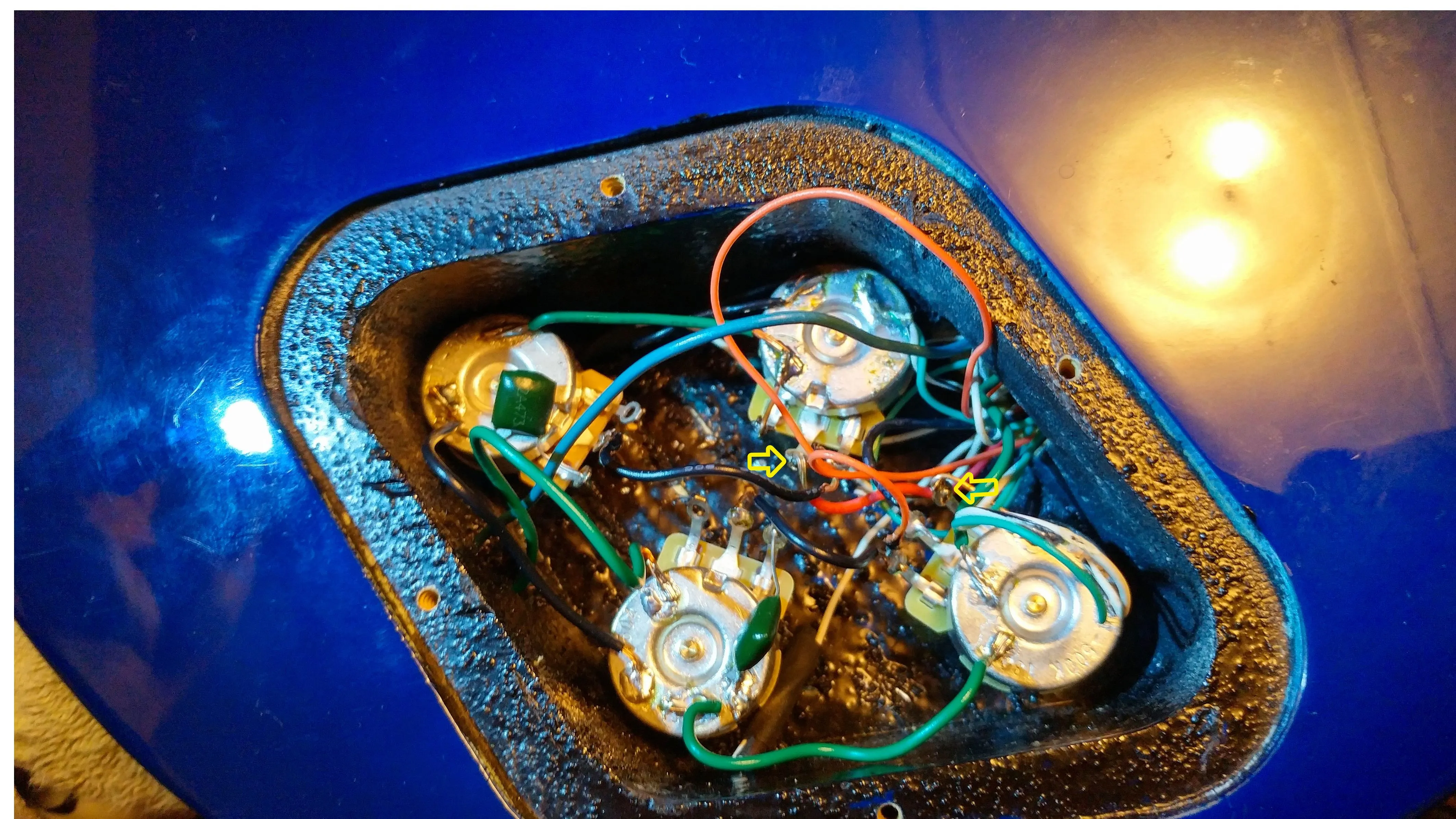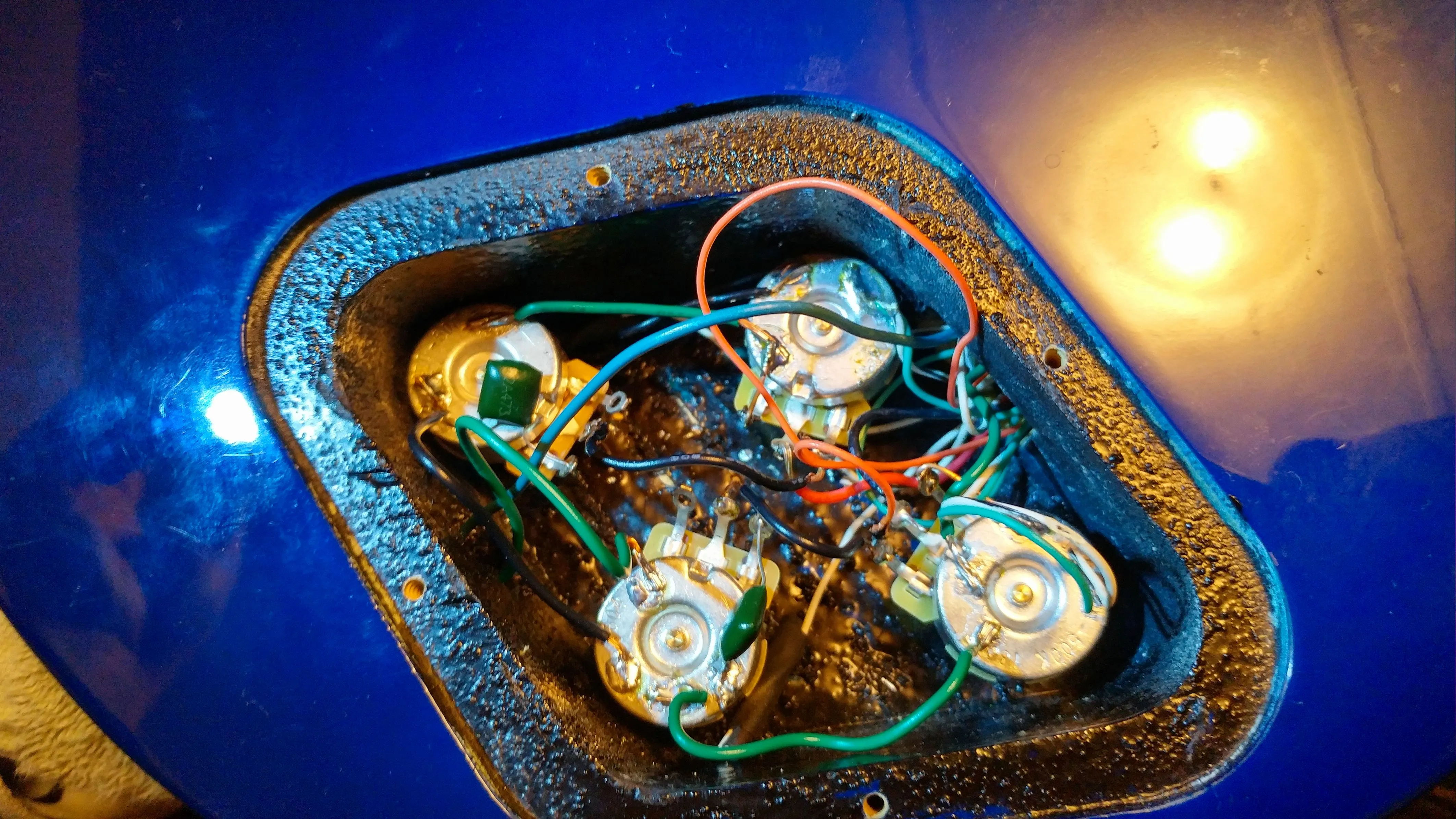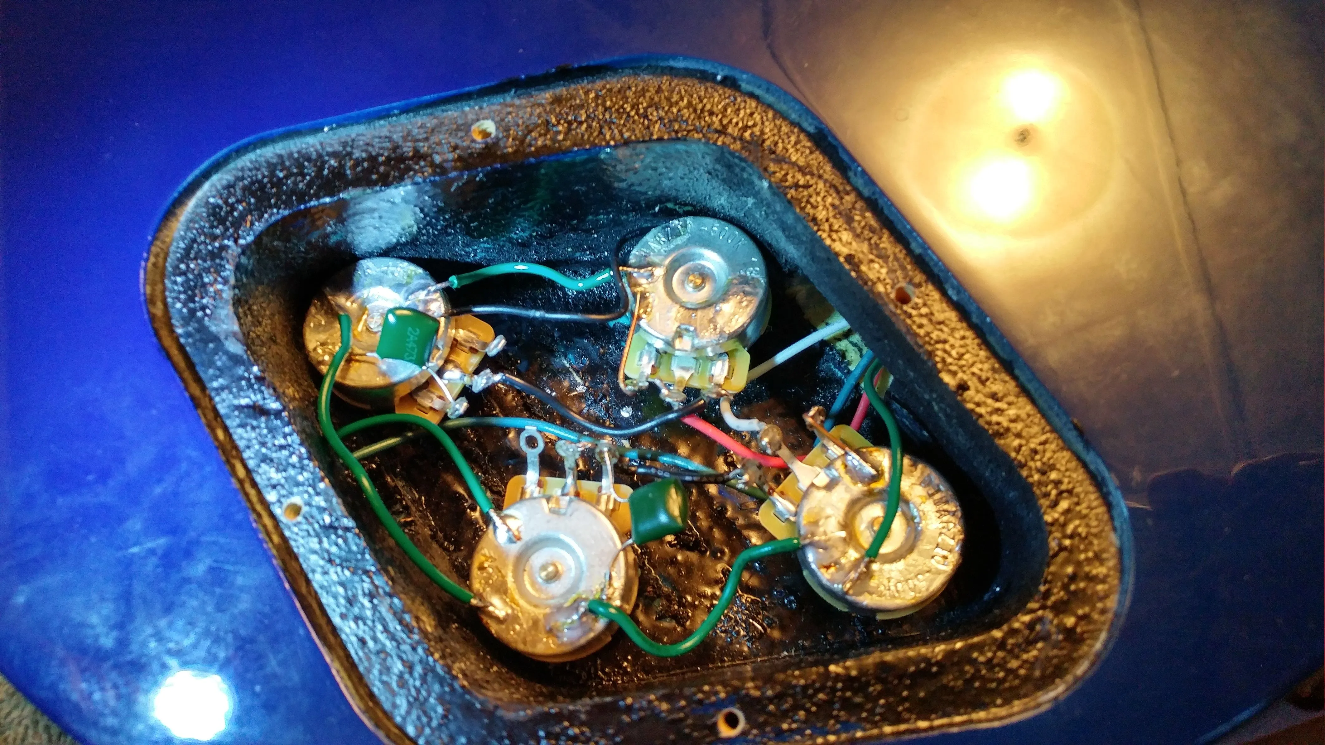 I'm left-handed. Also, one of my mods was to remove the old 1/4-inch pots and replace with 3/8. That's why it's a bit cramped in there. It's driving me nuts! I miss playing this thing!