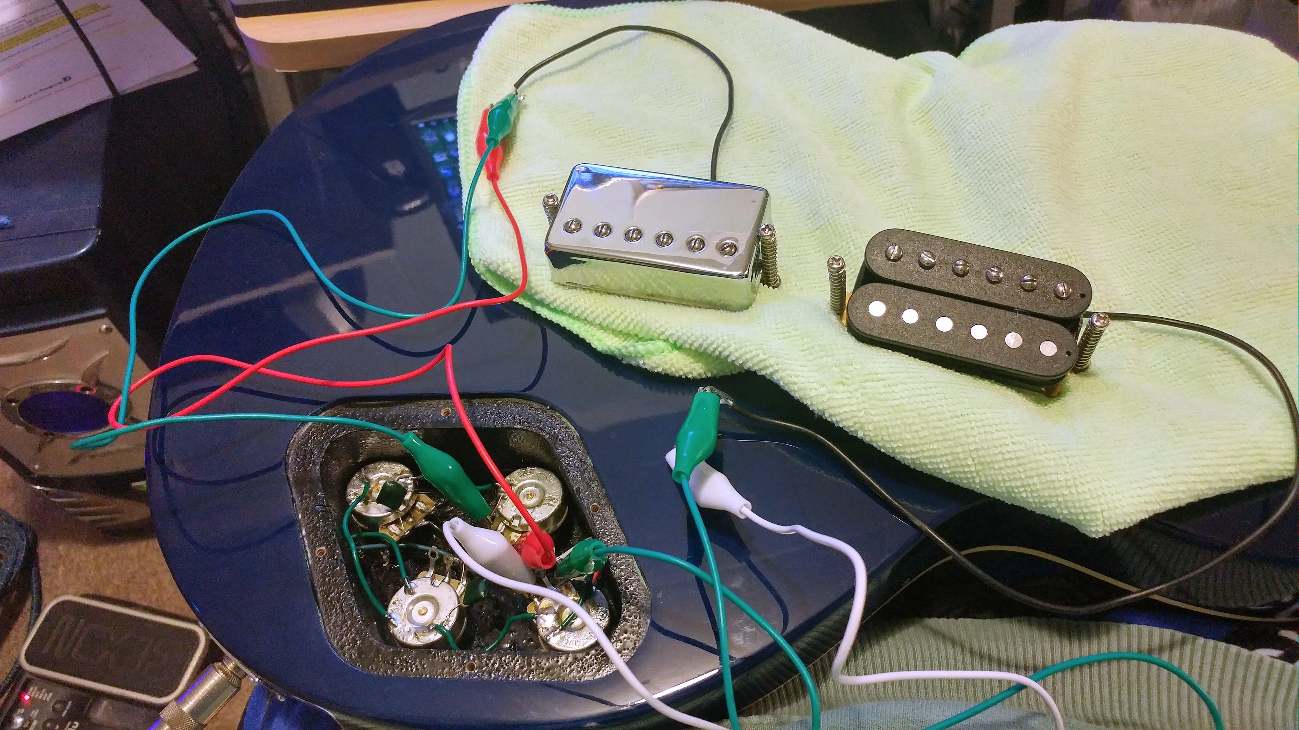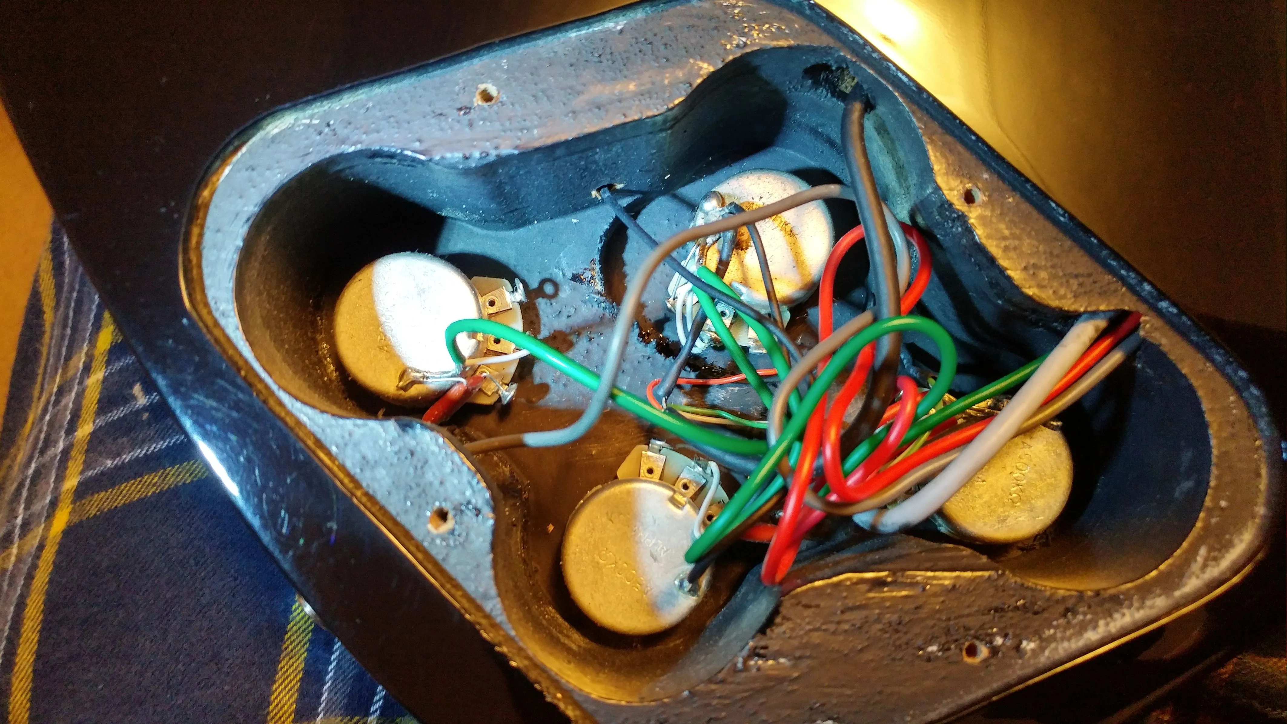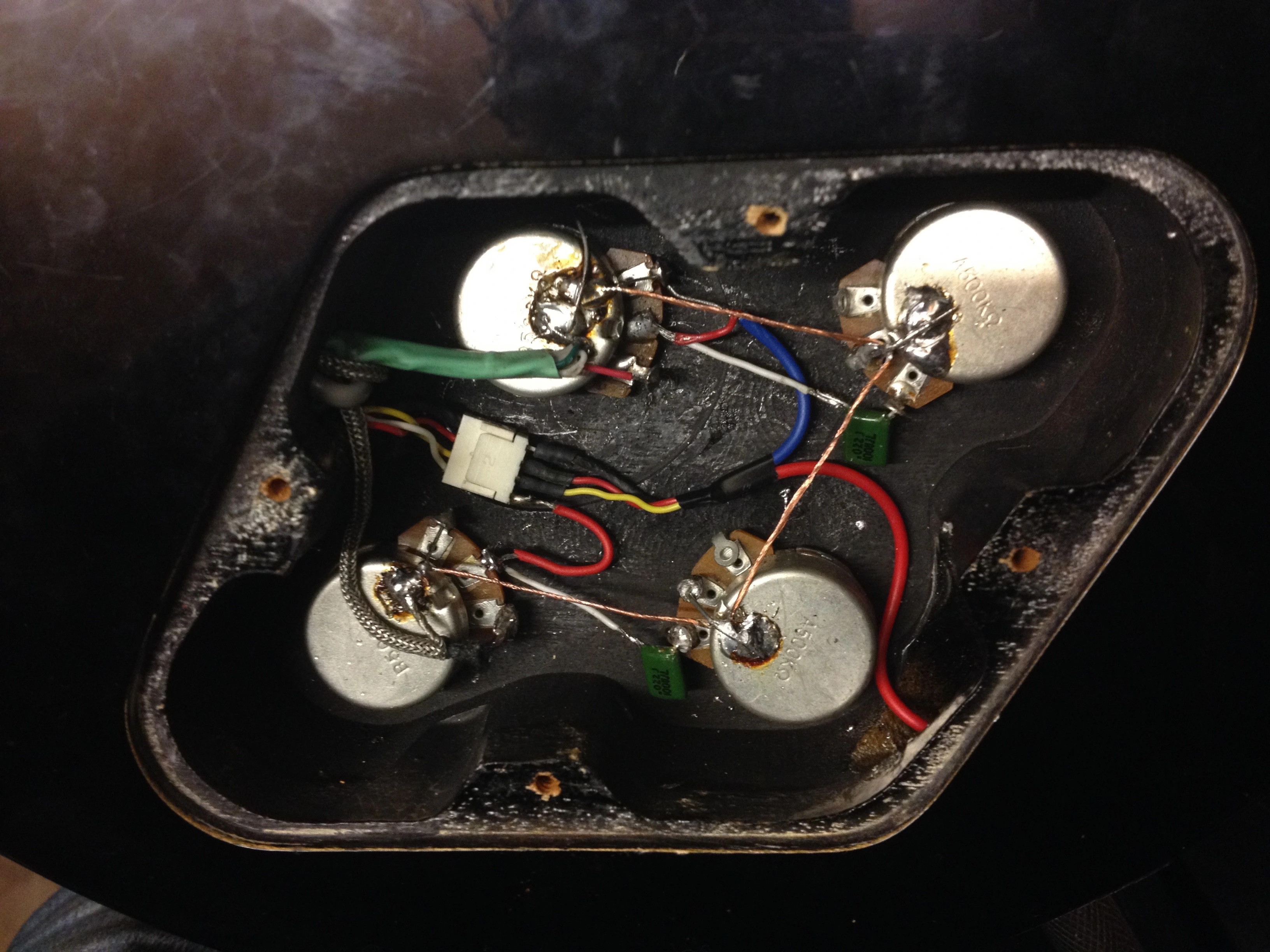 Now your circuit works, now connect your shield wires (pot backs, bridge ground...) to the jack sleeve. Now it's as good as it's gonna get.