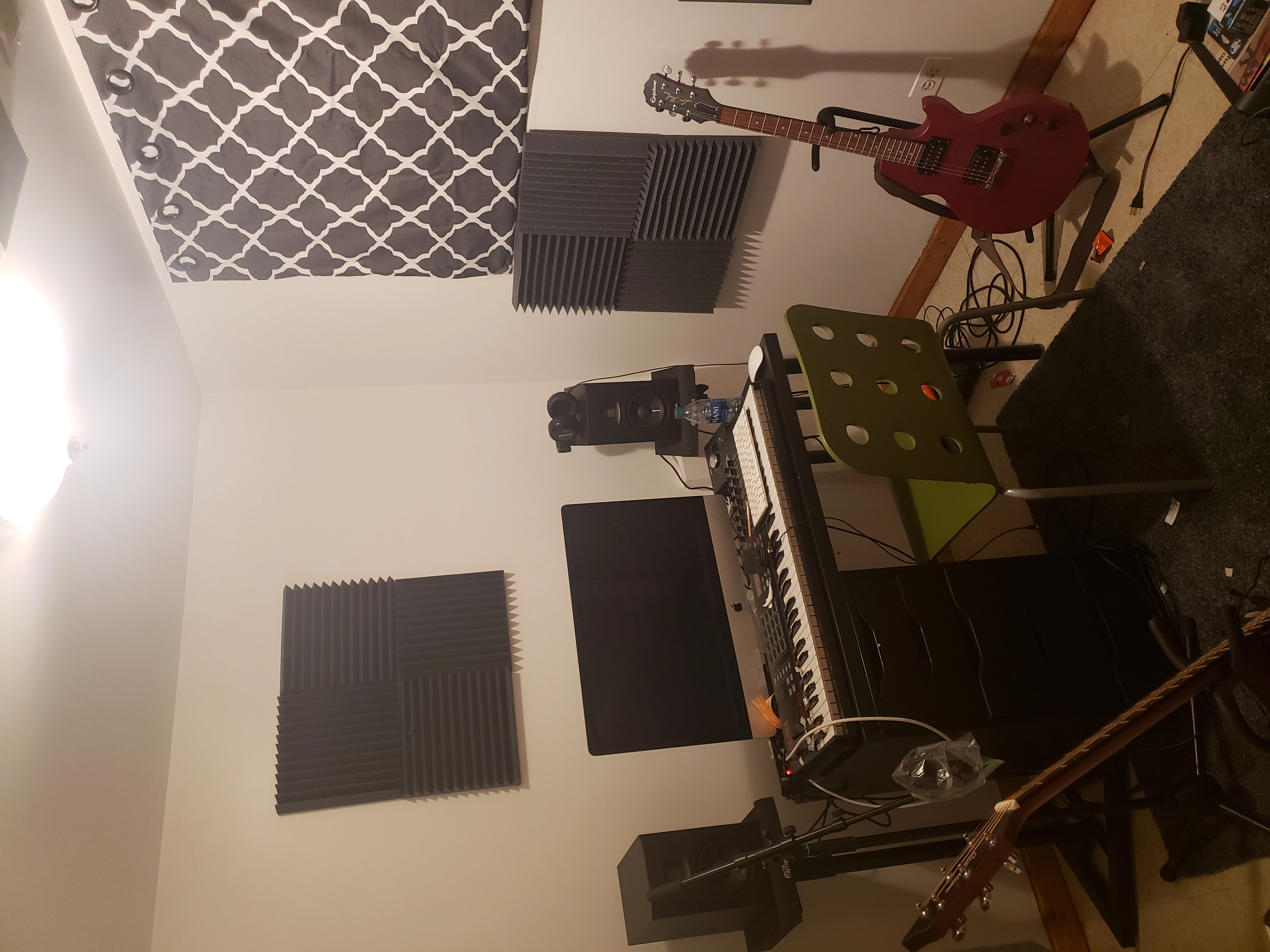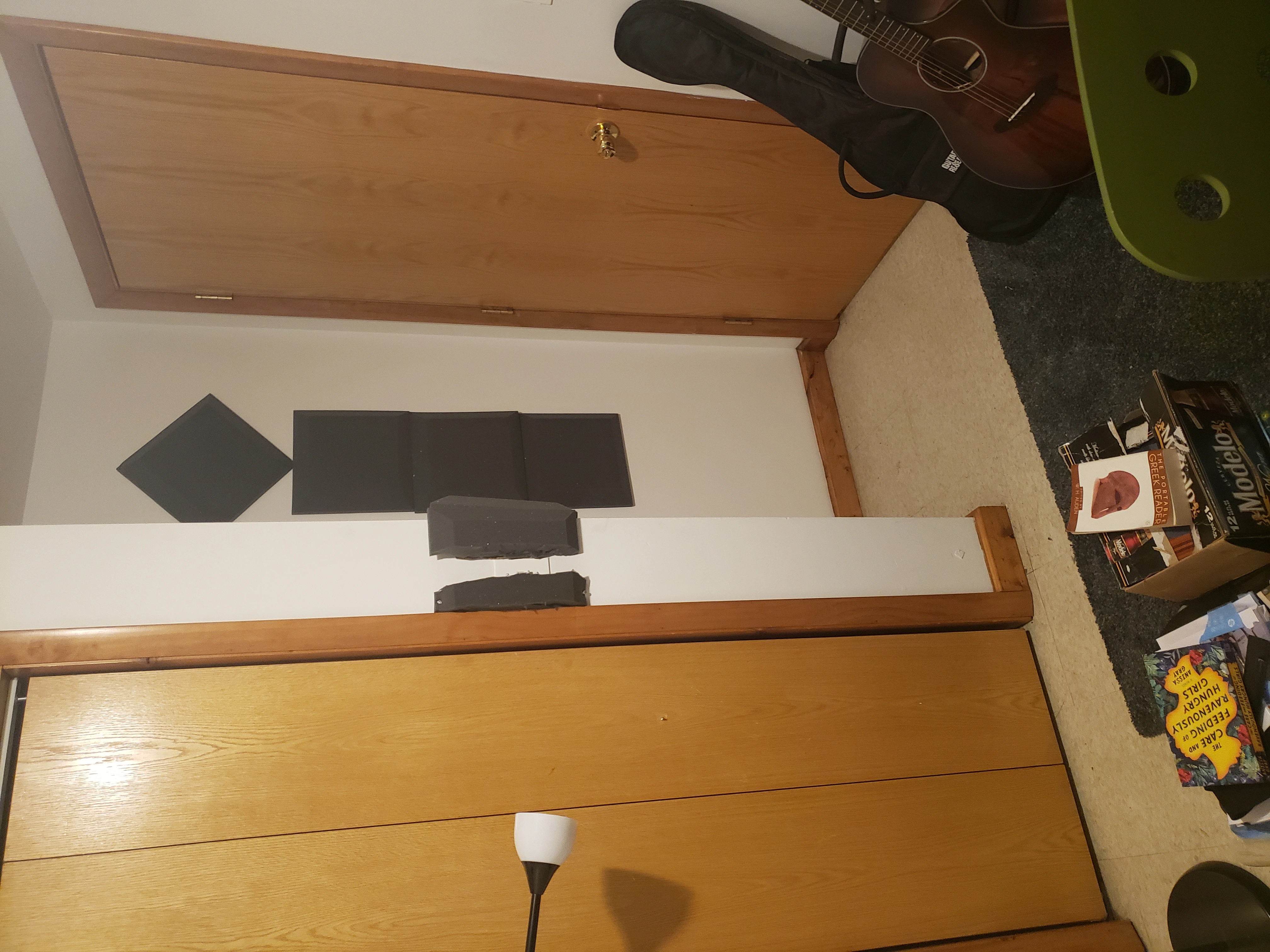 Ive been asking questions about acoustic treatment for my room, where I plan on recording myself playing acoustic guitar, singing and rapping on a neumann tlm 102. It was suggested that I should post my room dimensions, so here they are. Short wall-6.1ft Long wall-8.2ft Theres also a little nook that extends out to 10.5ft. And the ceiling is 7.5 ft high. Ive attached a few photos of the room. The black curtain on the wall is covering a window. I have a few foam panels up, but know those don't do much. I also have an area rug over most of the tile floor. Looking to buy some bass traps, dont want to build them. Any recommendations or advice on ways to get my room to sound better? There's not much echo, but when I clap my hands loudly, I hear a metallic high pitched ringing sound.
