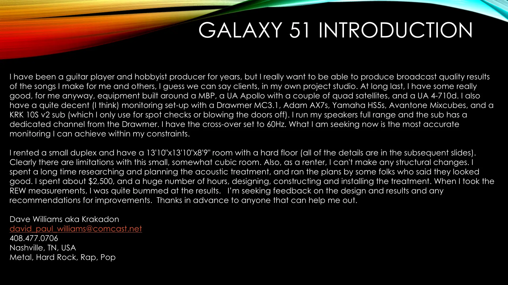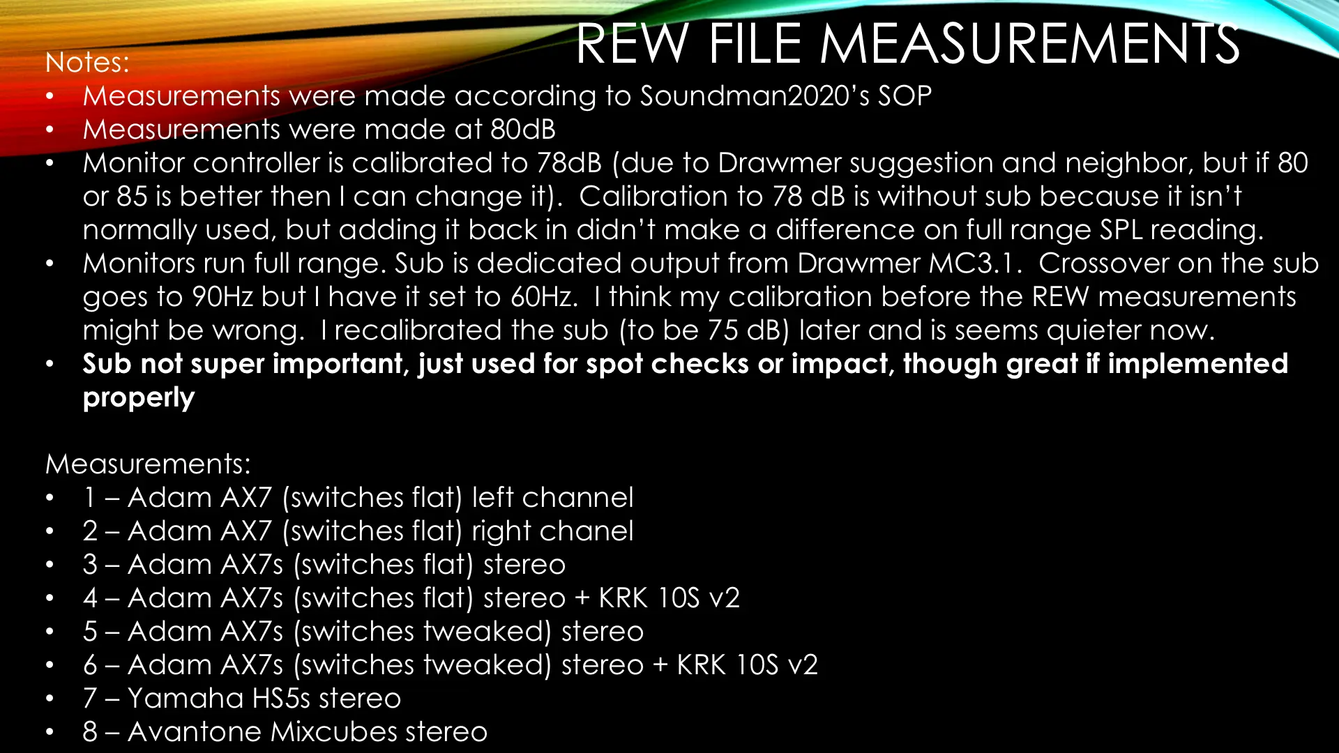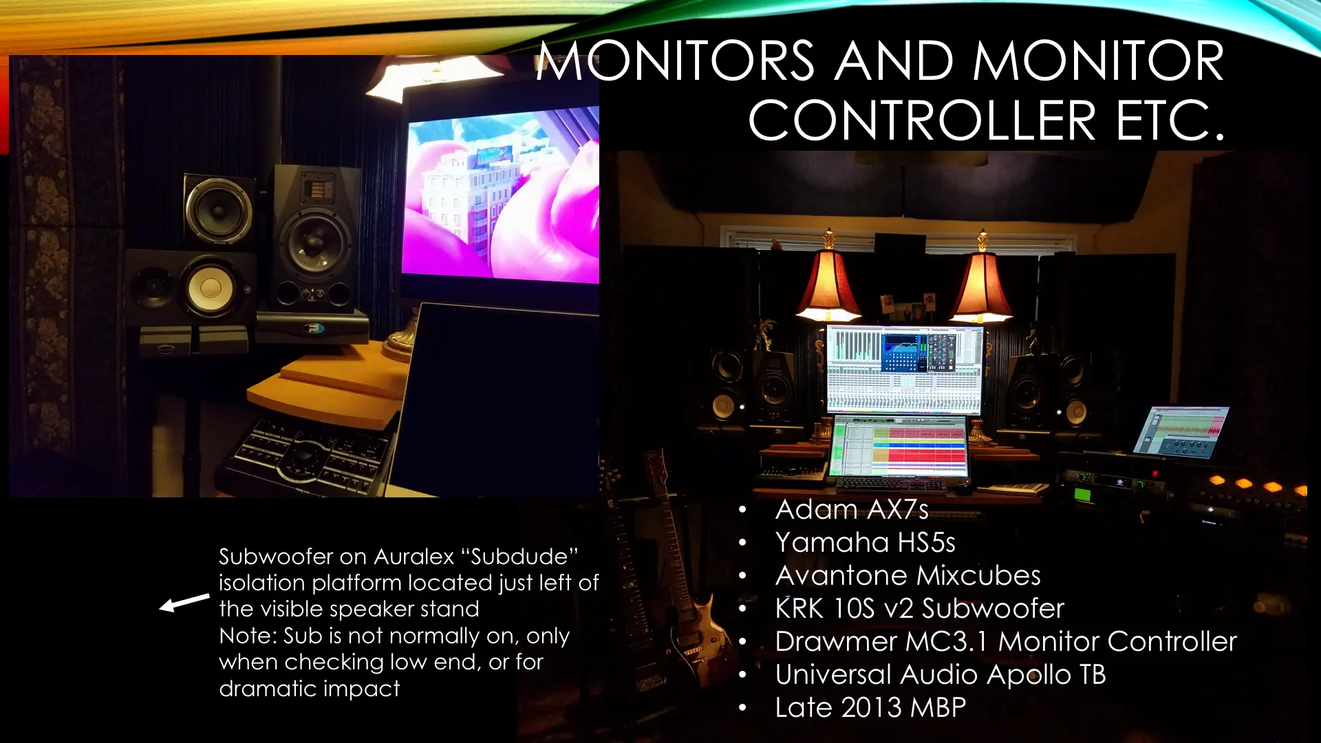 I have been a guitar player and hobbyist producer for years, but I really want to be able to produce broadcast quality results of the songs I make for me and others, I guess we can say clients, in my own project studio. At long last, I have some really good, for me anyway, equipment built around a MBP, a UA Apollo with a couple of quad satellites, and a UA 4-710D. I also have a quite decent (I think) monitoring set-up with a Drawmer MC3.1, Adam AX7s, Yamaha HS5s, Avantone MixCubes, and a KRK 10S v2 sub (which I only use for spot checks or blowing the doors off). I run my speakers full range and the sub has a dedicated channel from the Drawmer. I have the cross-over set to 60Hz. What I am seeking now is the most accurate monitoring I can achieve within my constraints.