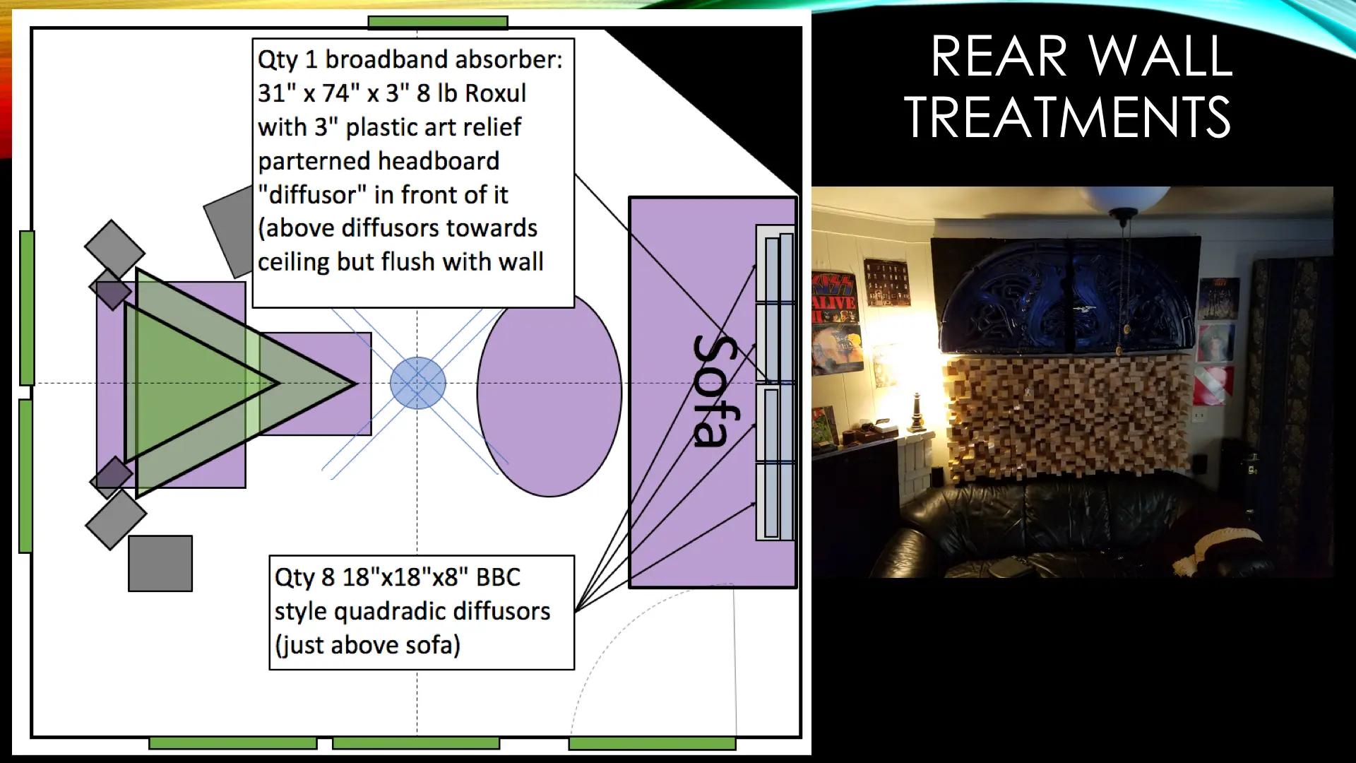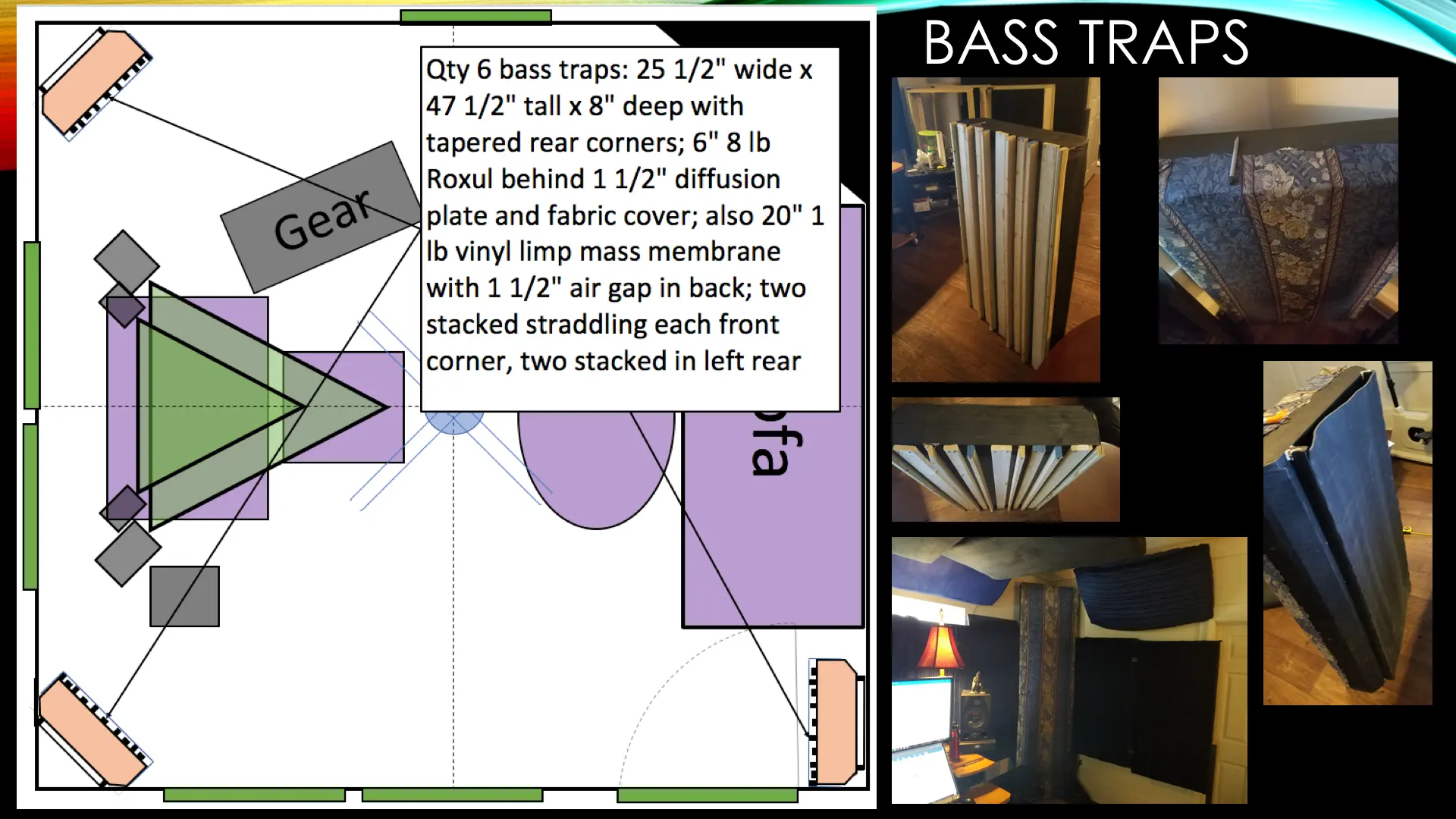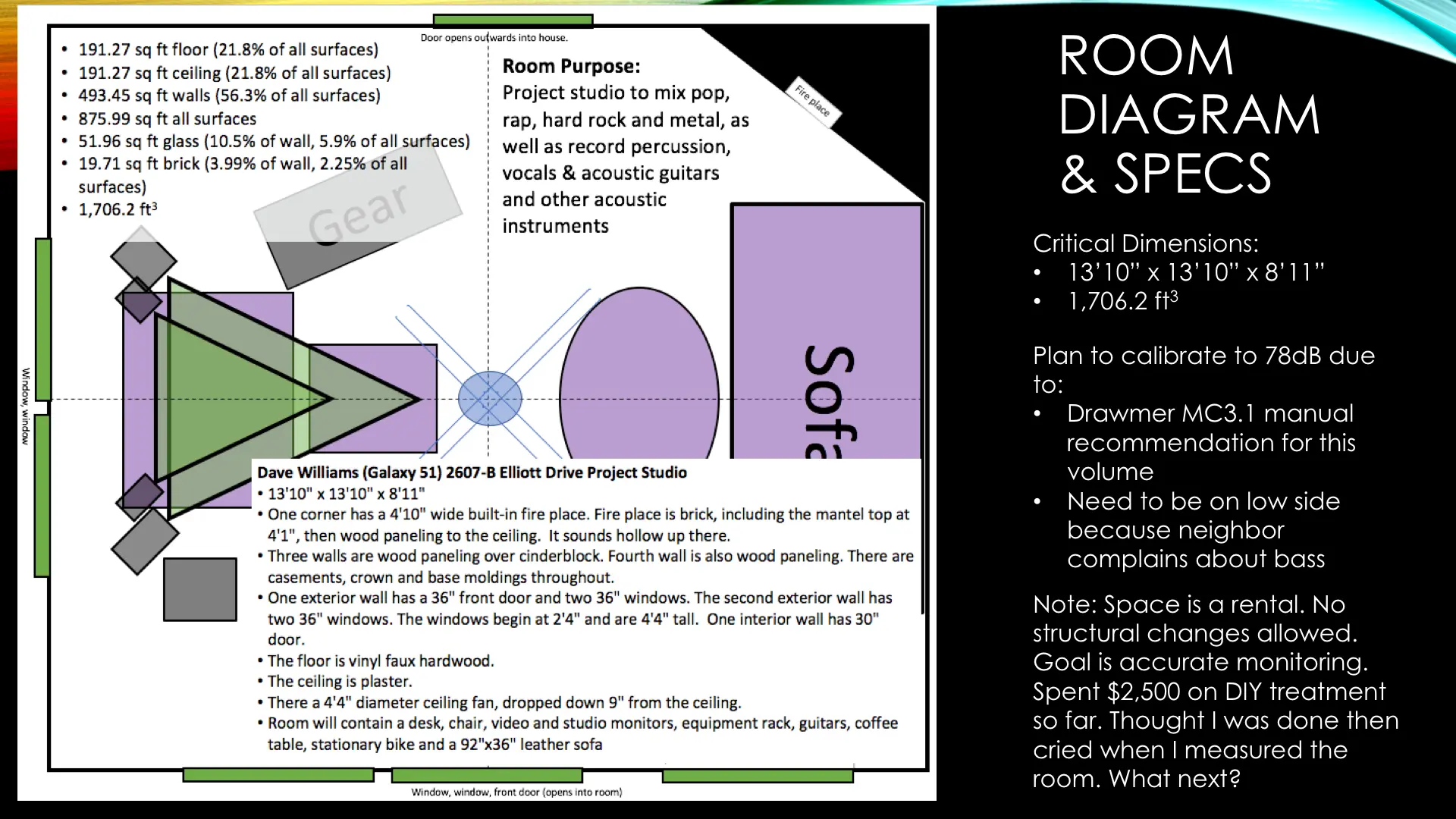 I rented a small duplex and have a 13'10"x13'10"x8'9" room with a hard floor (all of the details are in the subsequent slides). Clearly there are limitations with this small, somewhat cubic room. Also, as a renter, I can't make any structural changes. I spent a long time researching and planning the Acoustic Treatment, and ran the plans by some folks who said they looked good. I spent about $2,500, and a huge number of hours, designing, constructing and installing the treatment. When I took the REW measurements, I was quite bummed at the results. I’m seeking feedback on the design and results and any recommendations for improvements. Thanks in advance to anyone that can help me out.