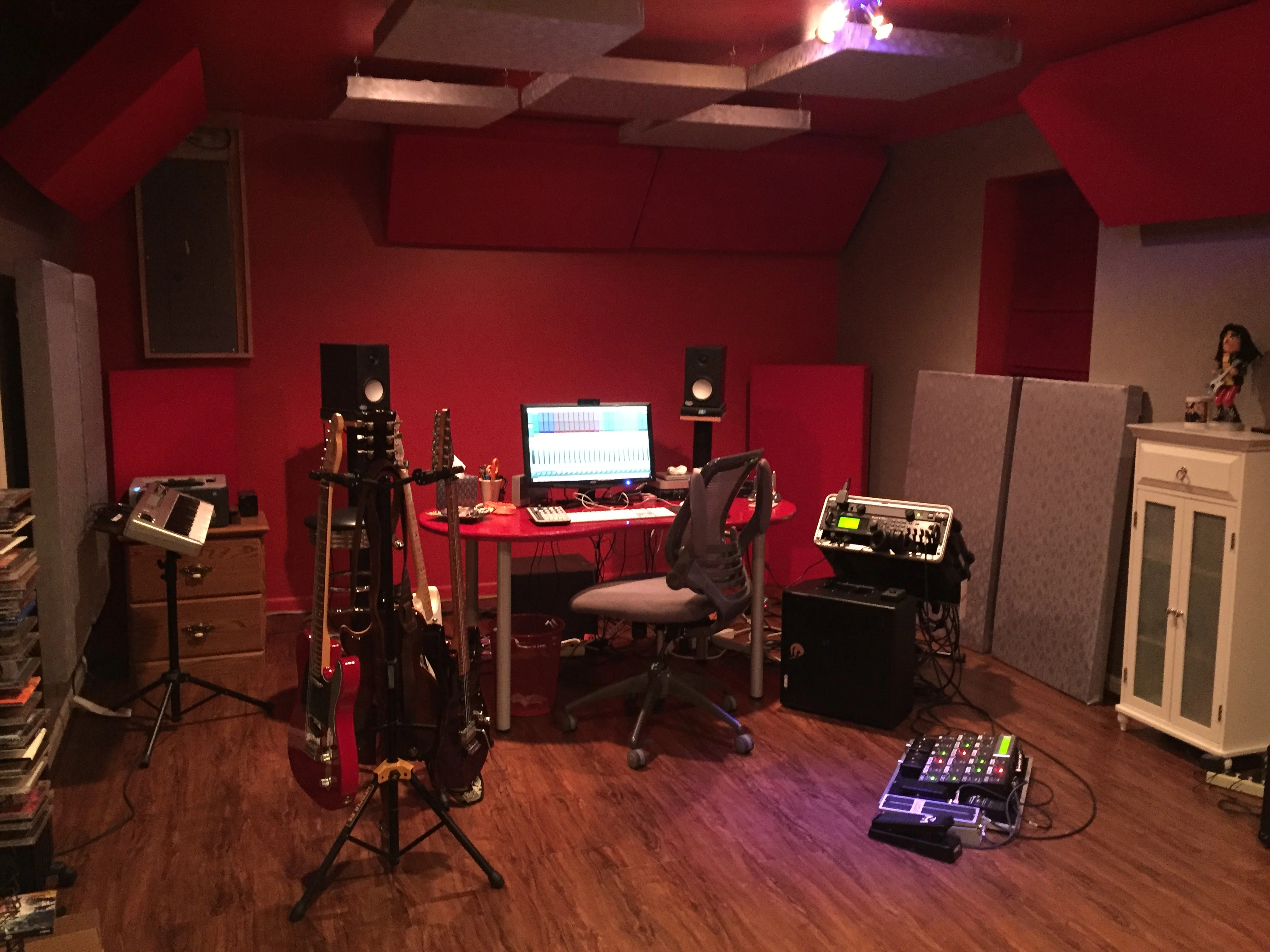 It’s a one room studio that I treated acoustically. The acoustic treatment design was provided by “Ready Acoustics”, which I followed to the T.