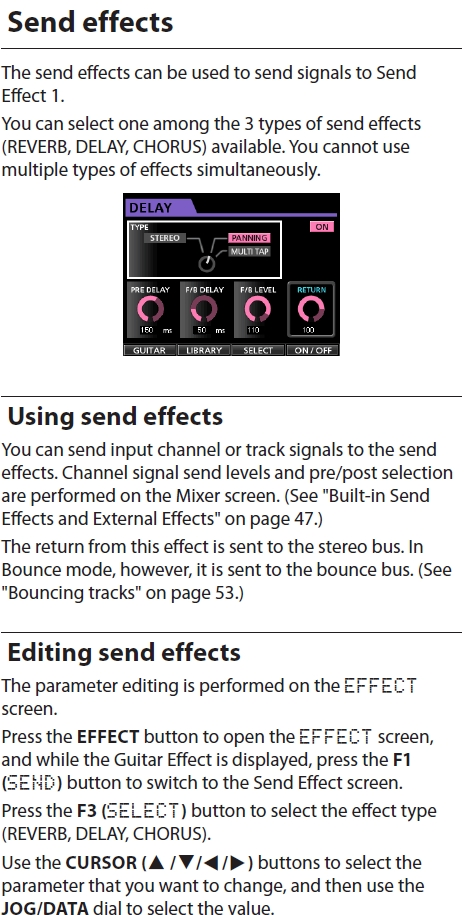 I have had a Tascam DP 24 before and sold it. I just purchased another one and am kind of rusty on how to use the send effects. When I do my vocal track, I do it with no effect and add later. When I go to the effects and choose chorus or whatever I choose, it sounds like there is a loud distorted sound along with the effect. When I turn the effect off, it is gone so I know it isn't the microphone.